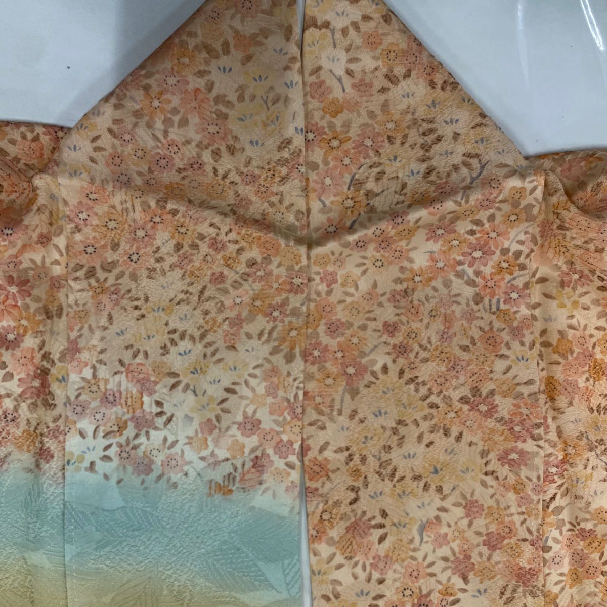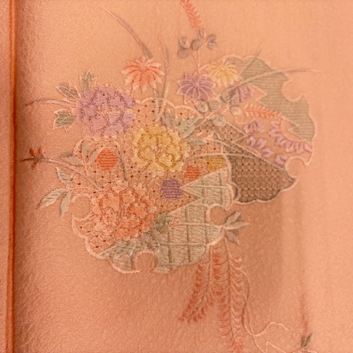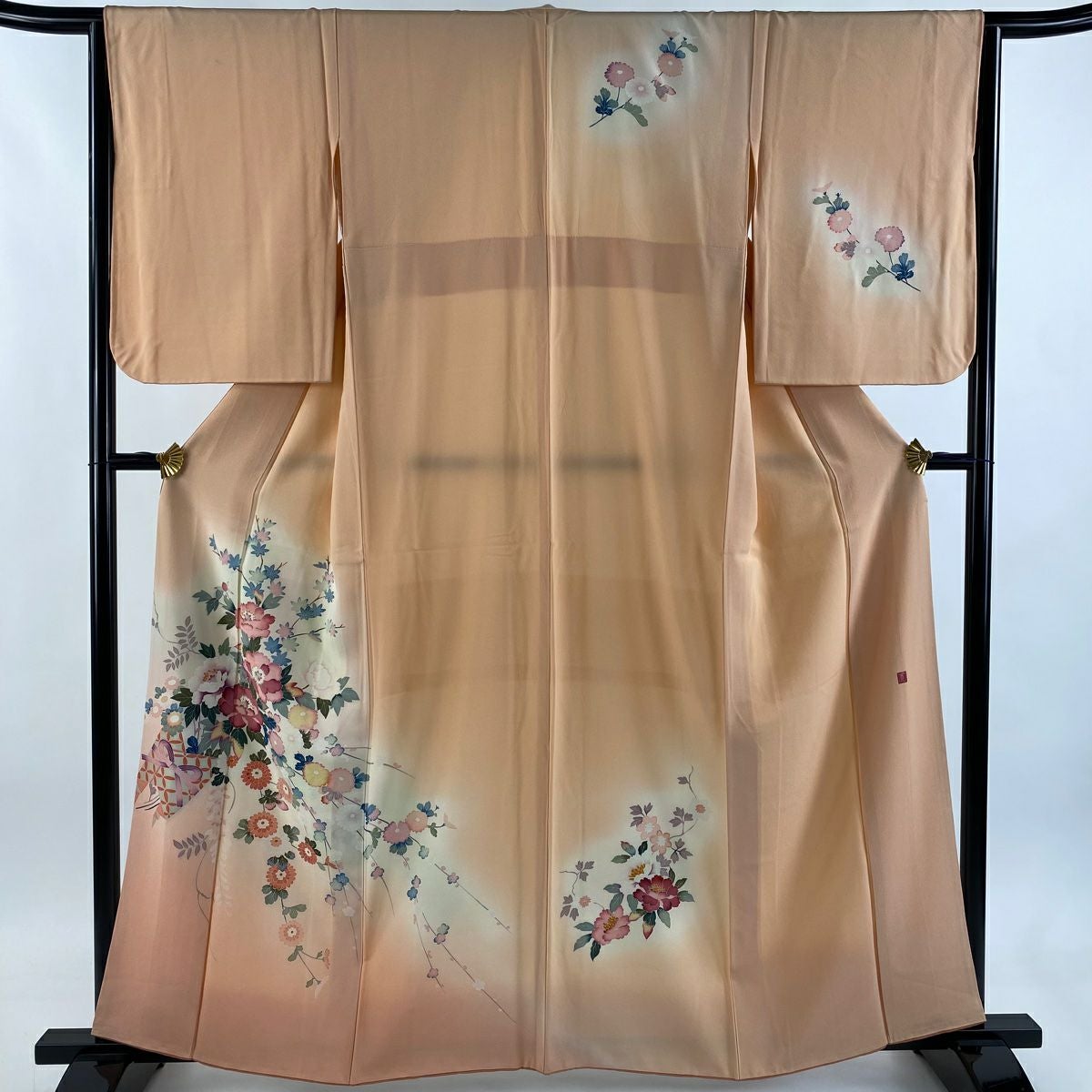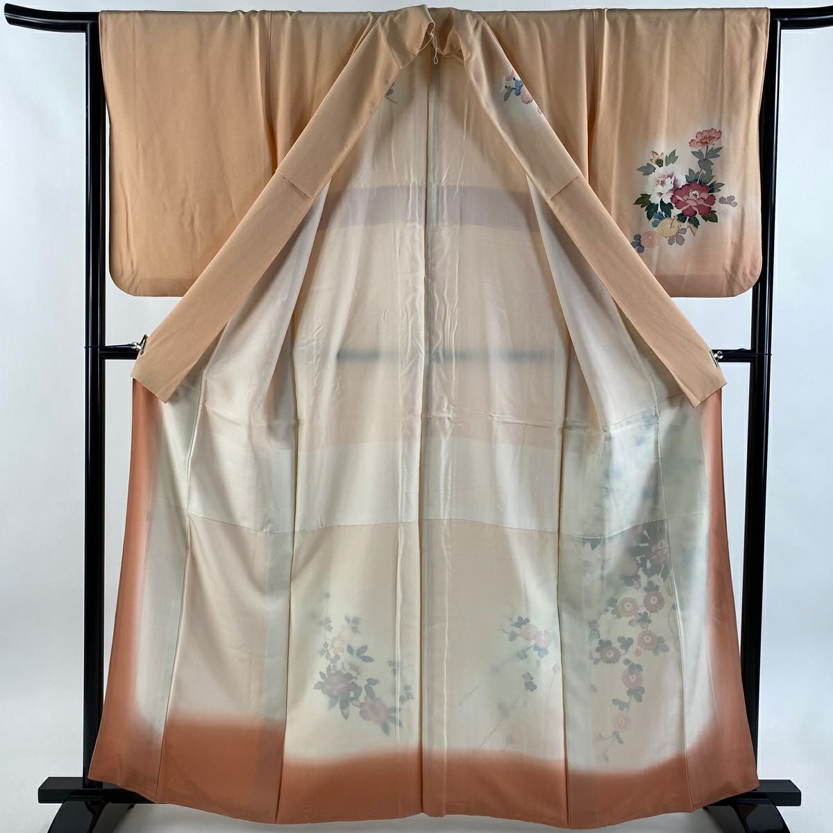【在庫一掃】 訪問着 身丈161cm 裄丈64cm M 袷 落款あり 草花 花束 ぼかし 薄オレンジ 正絹 秀品