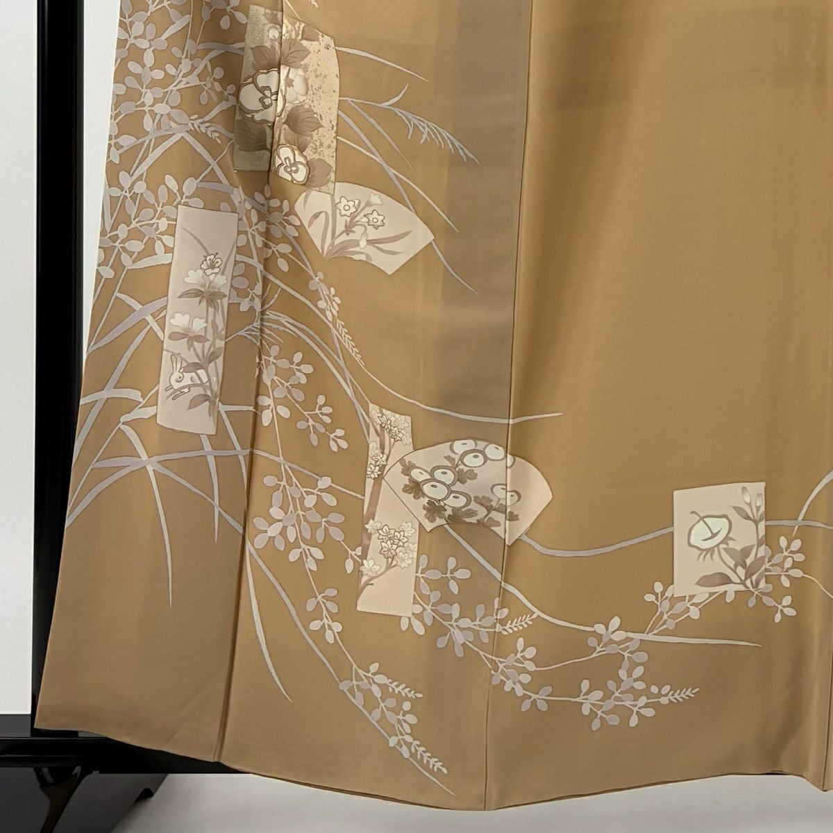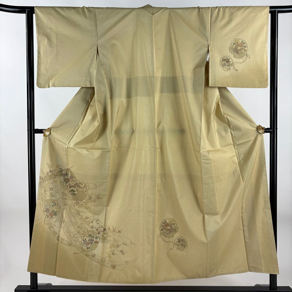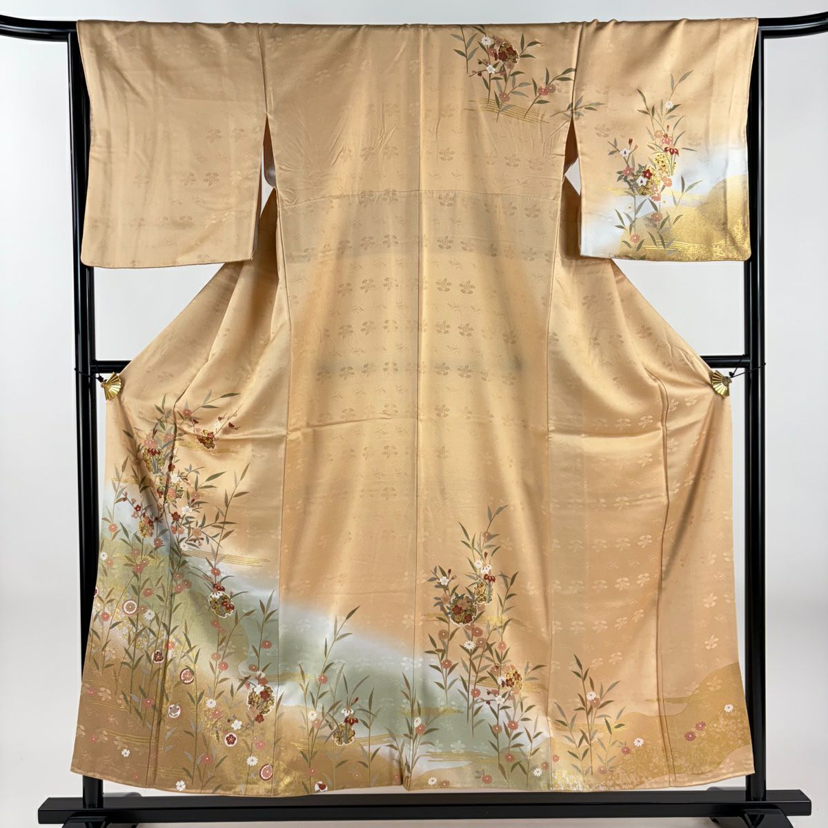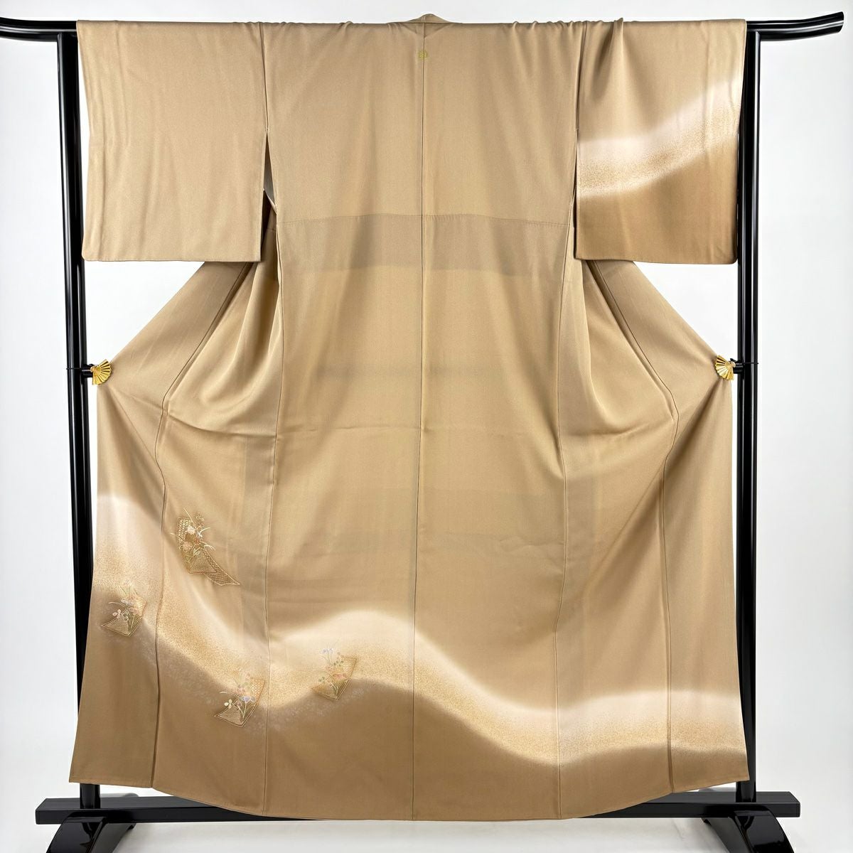 【在庫一掃】 訪問着 身丈160.5cm 裄丈66cm M 袷 扇面 草花 金糸 金銀彩 薄茶色 正絹 秀品 一つ紋