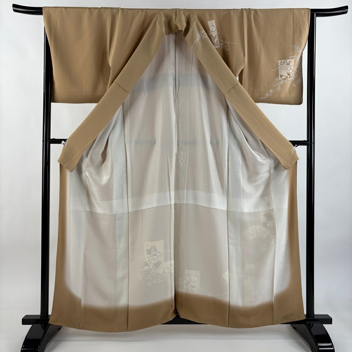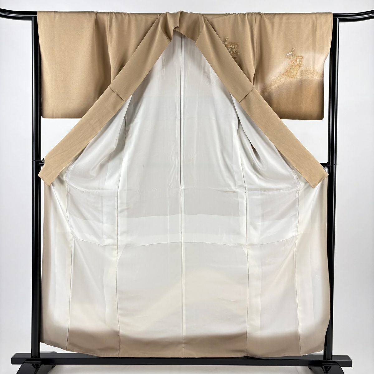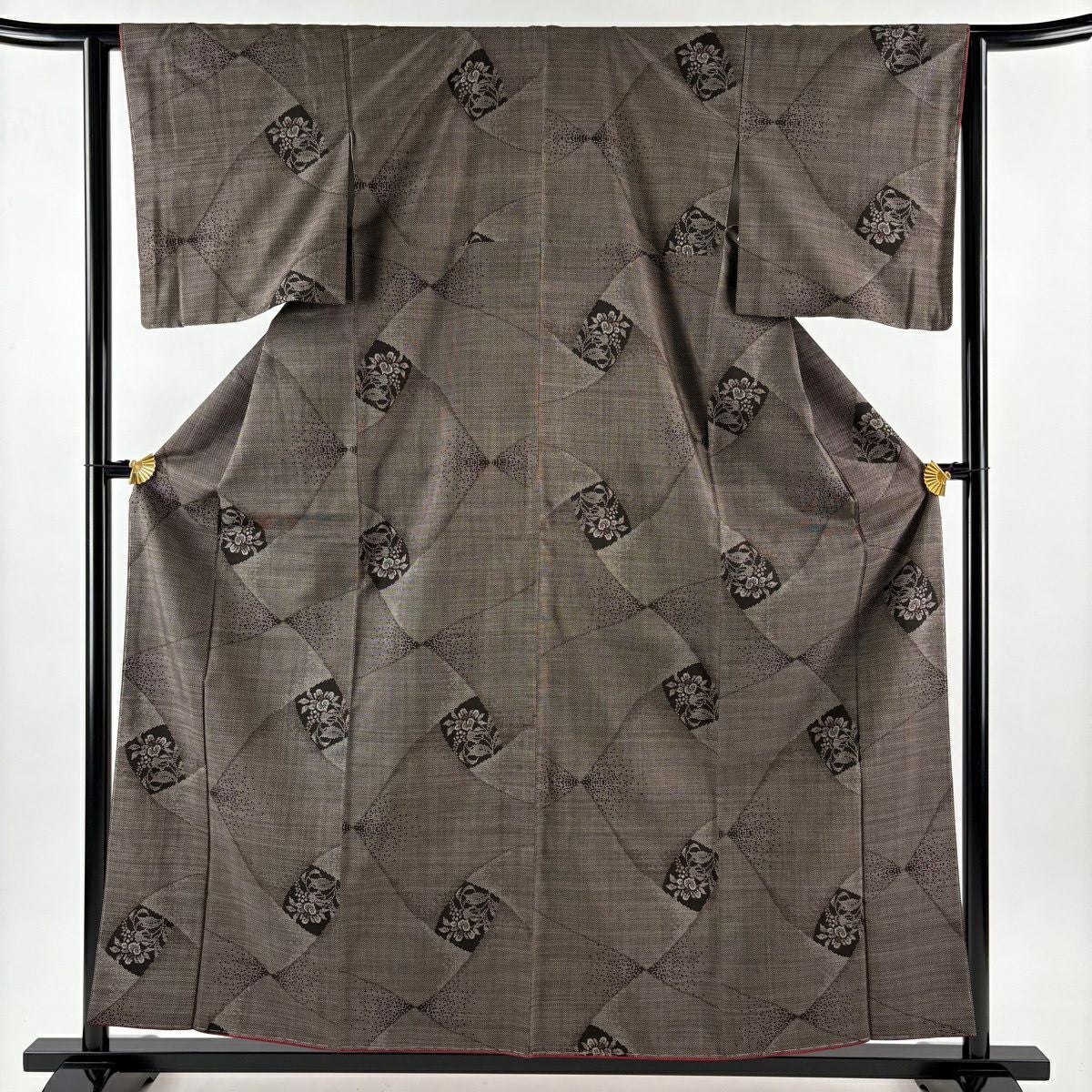 【在庫一掃】 訪問着 身丈160.5cm 裄丈66cm M 袷 扇面 草花 金糸 金銀彩 薄茶色 正絹 秀品 一つ紋