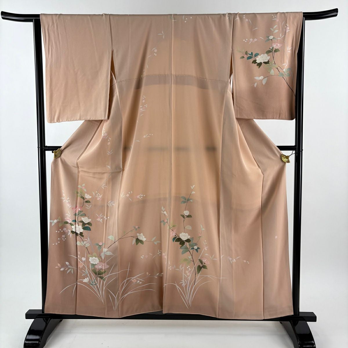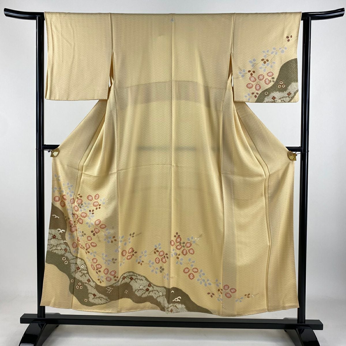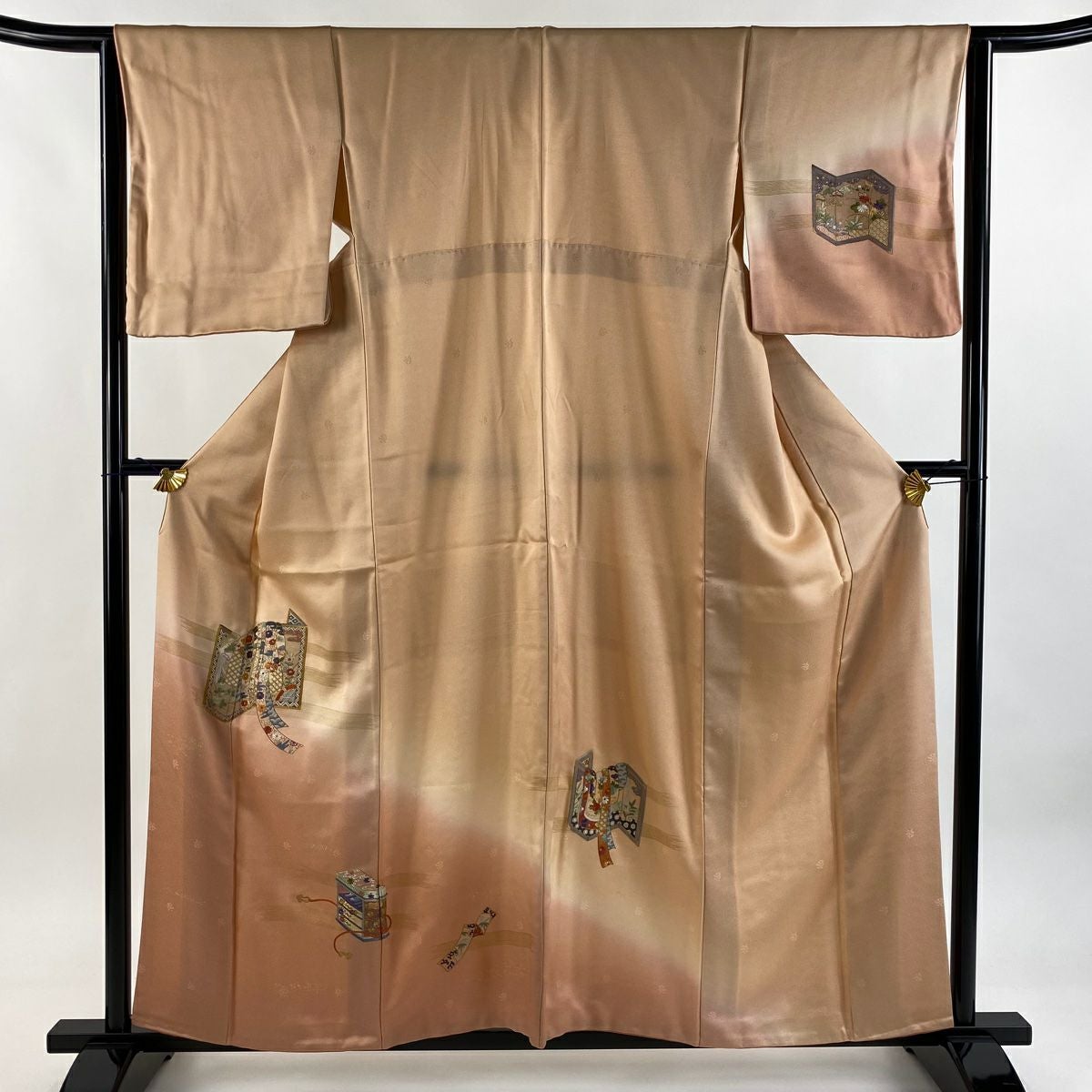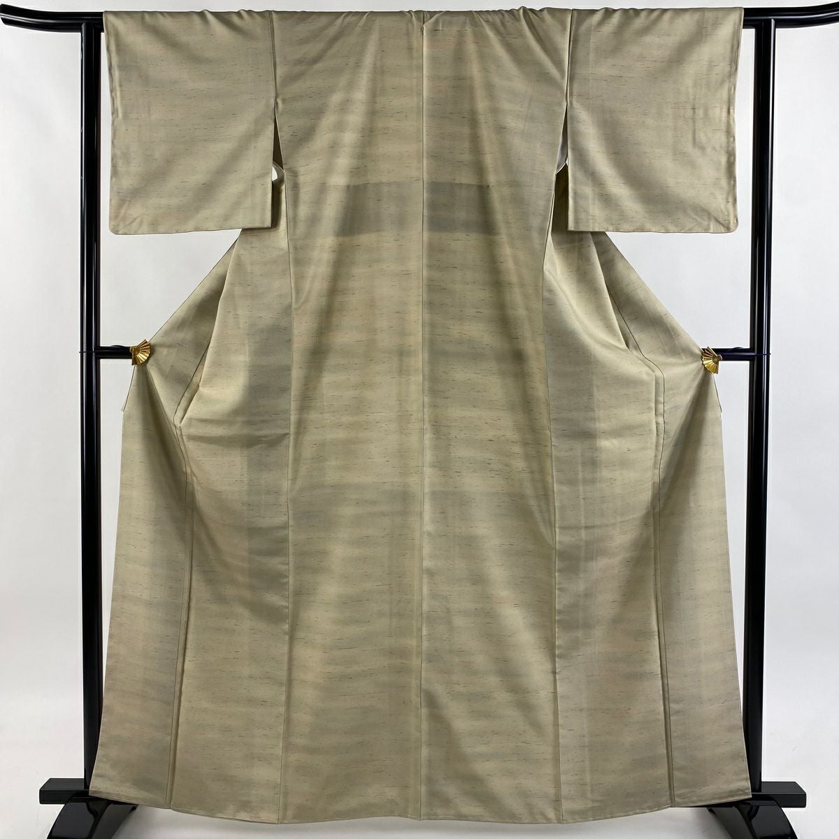 【在庫一掃】 訪問着 身丈160.5cm 裄丈66cm M 袷 扇面 草花 金糸 金銀彩 薄茶色 正絹 秀品 一つ紋