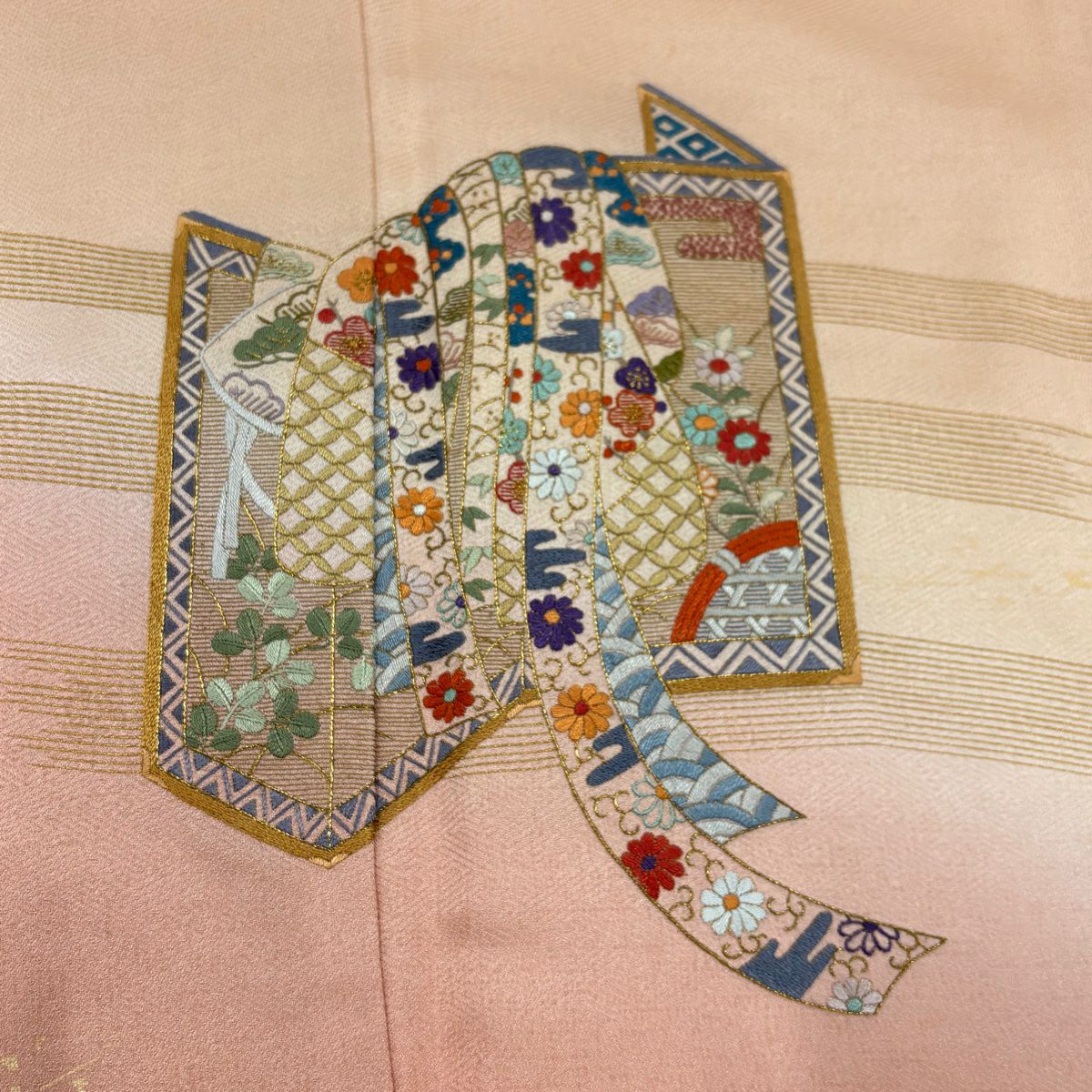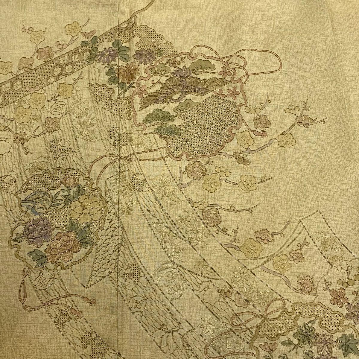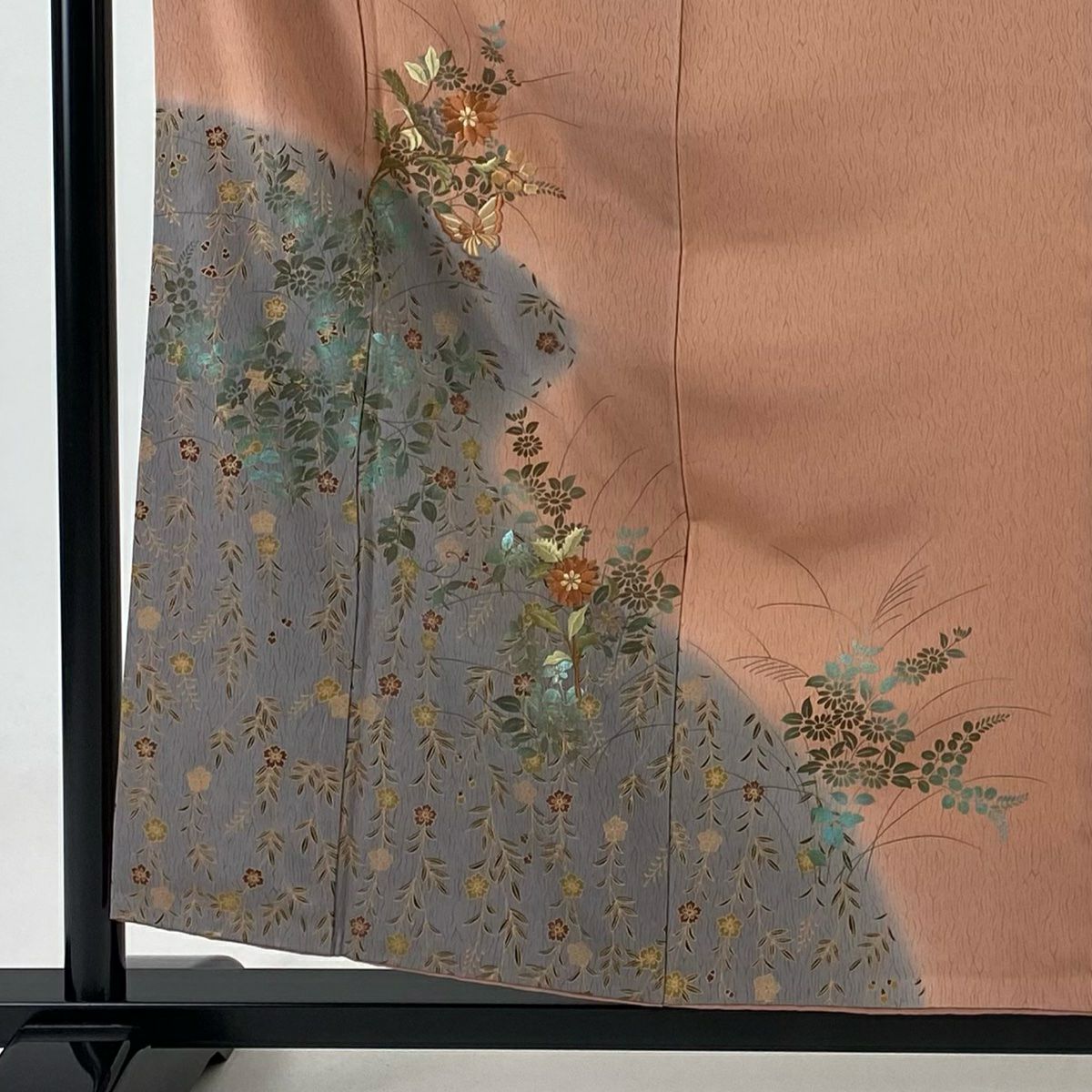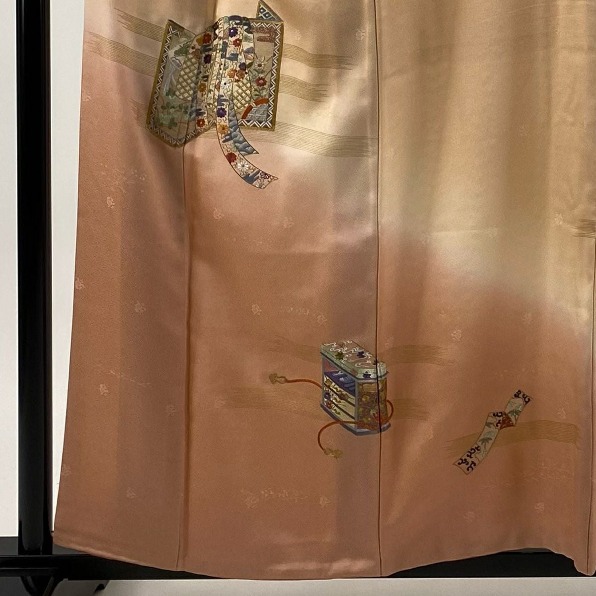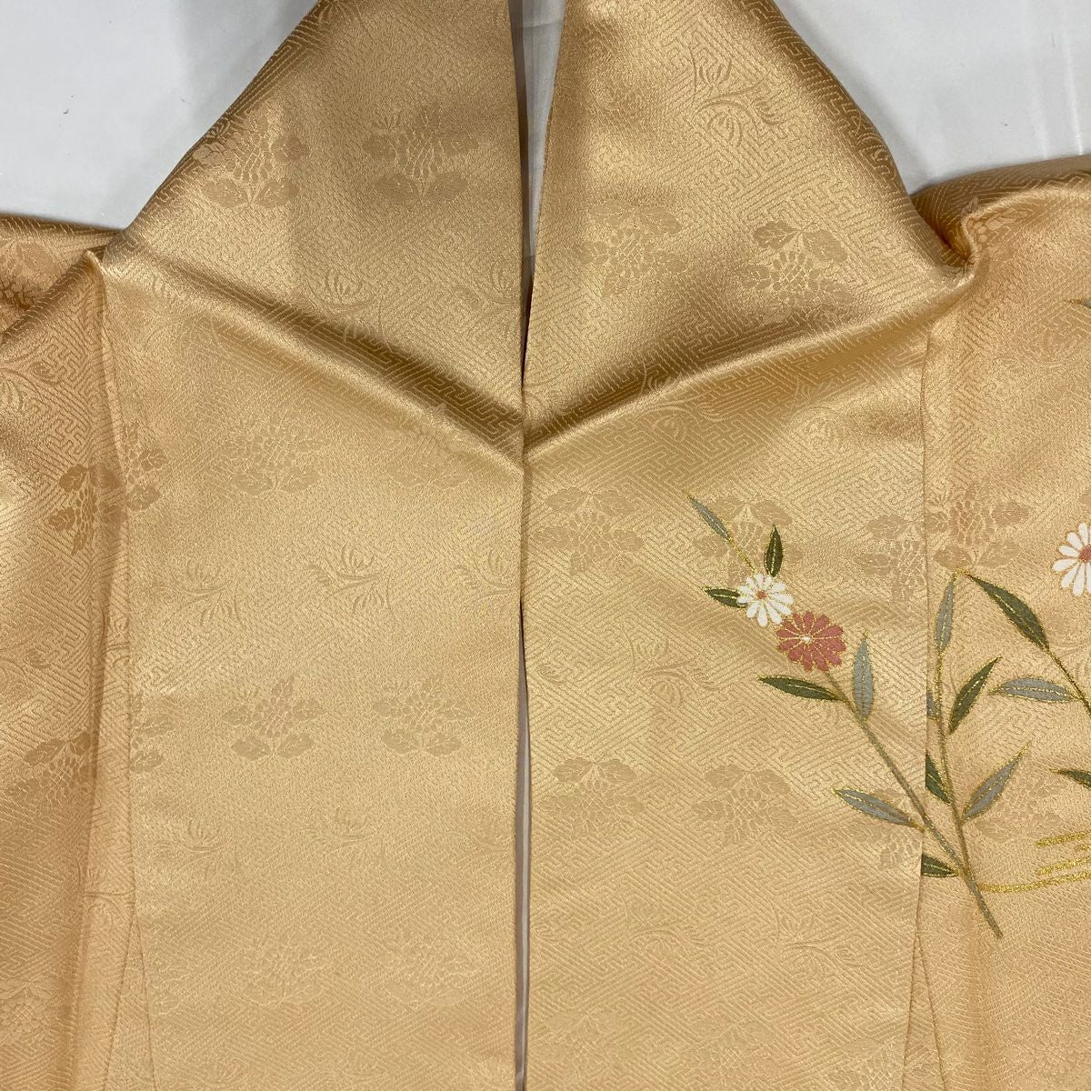 【在庫一掃】 付下げ 身丈157.5cm 裄丈63.5cm S 袷 衝立 松竹梅 金糸 刺繍 薄オレンジ 正絹 秀品