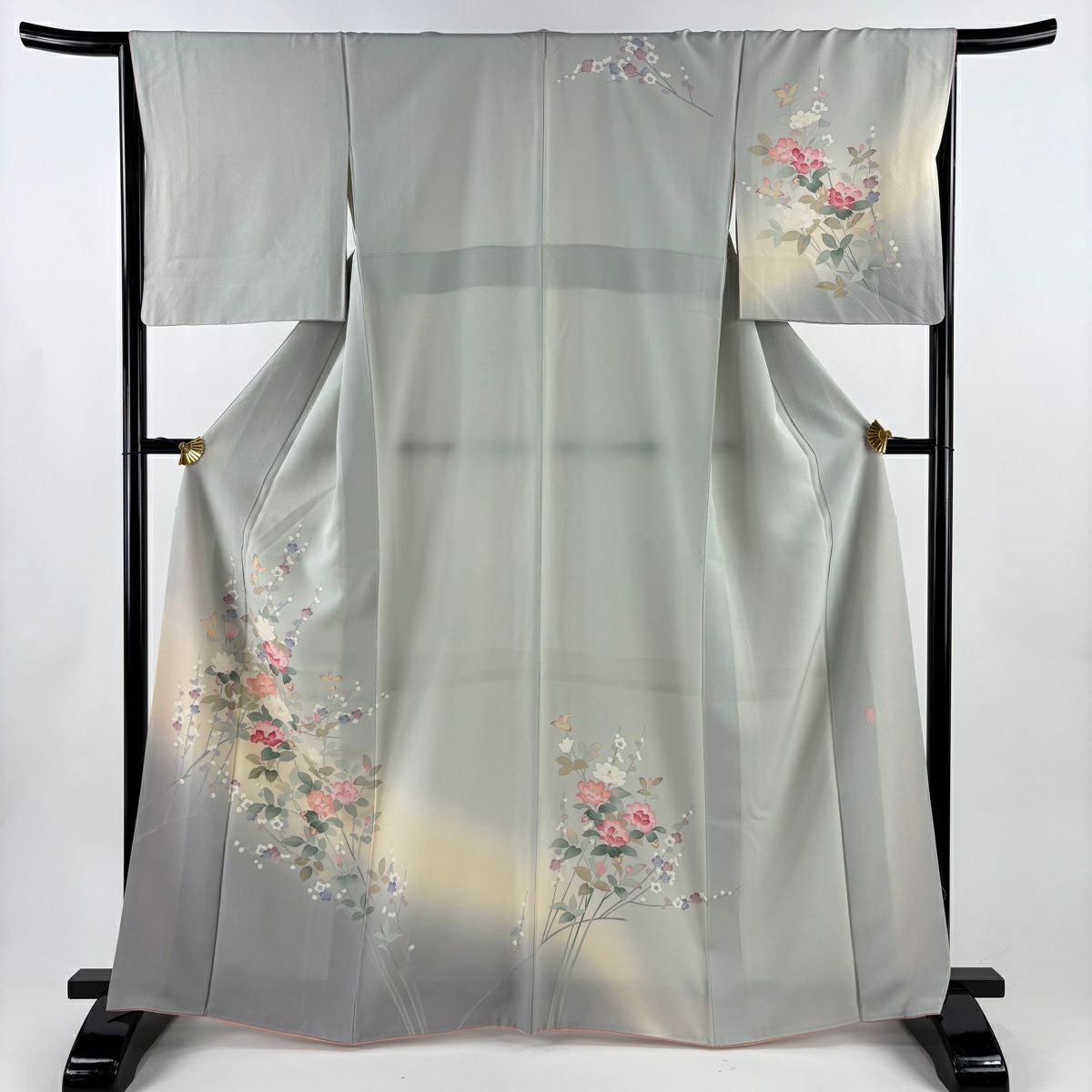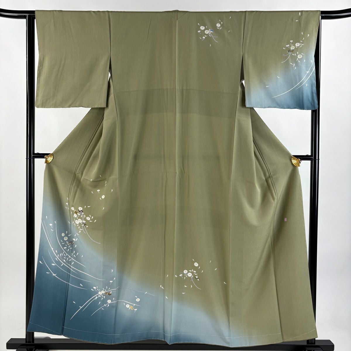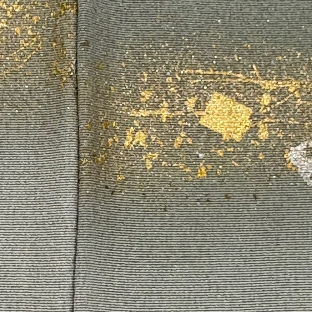 【在庫一掃】 付下げ 身丈156.5cm 裄丈64cm M 袷 落款あり 花 扇面 金彩 ぼかし 灰緑 正絹 秀品