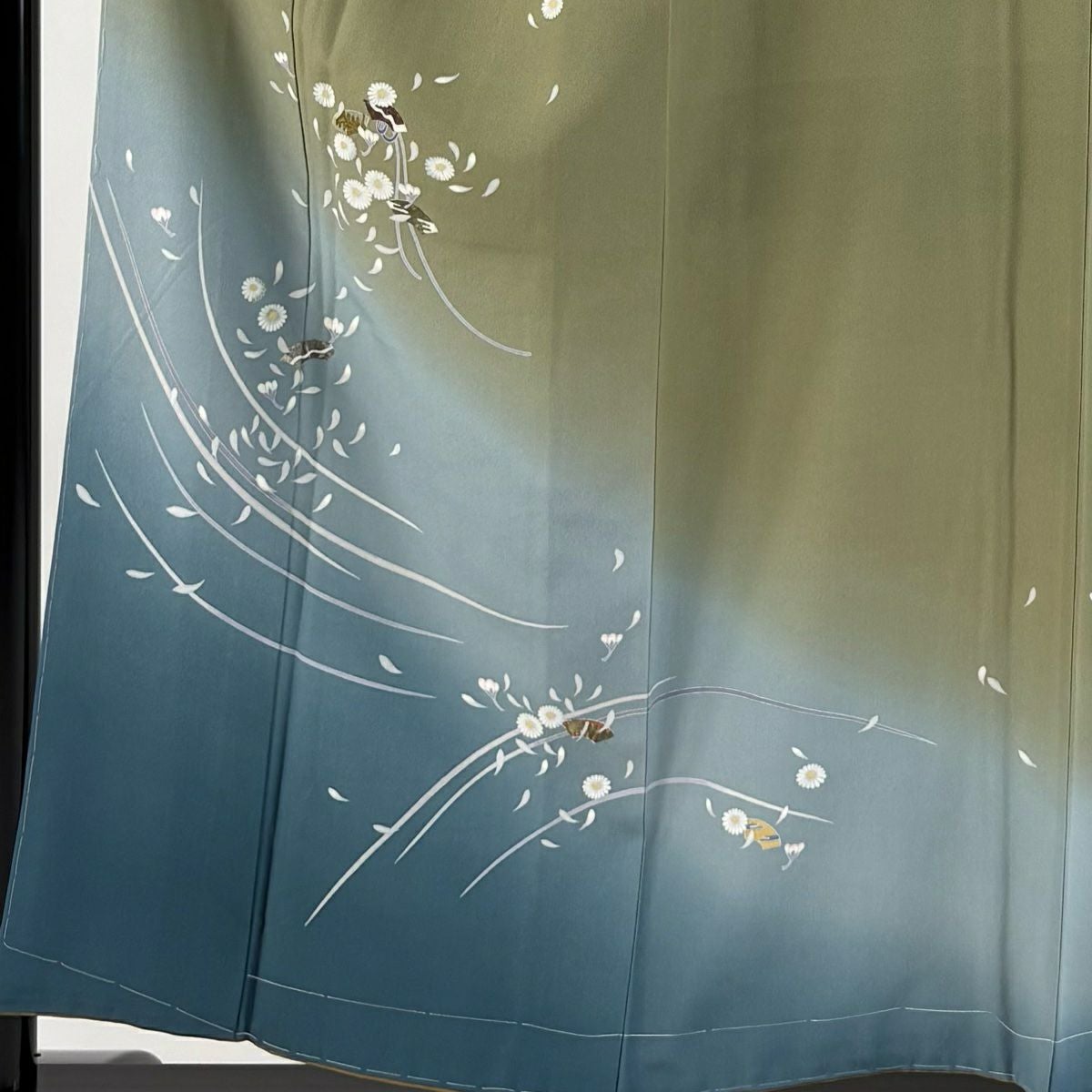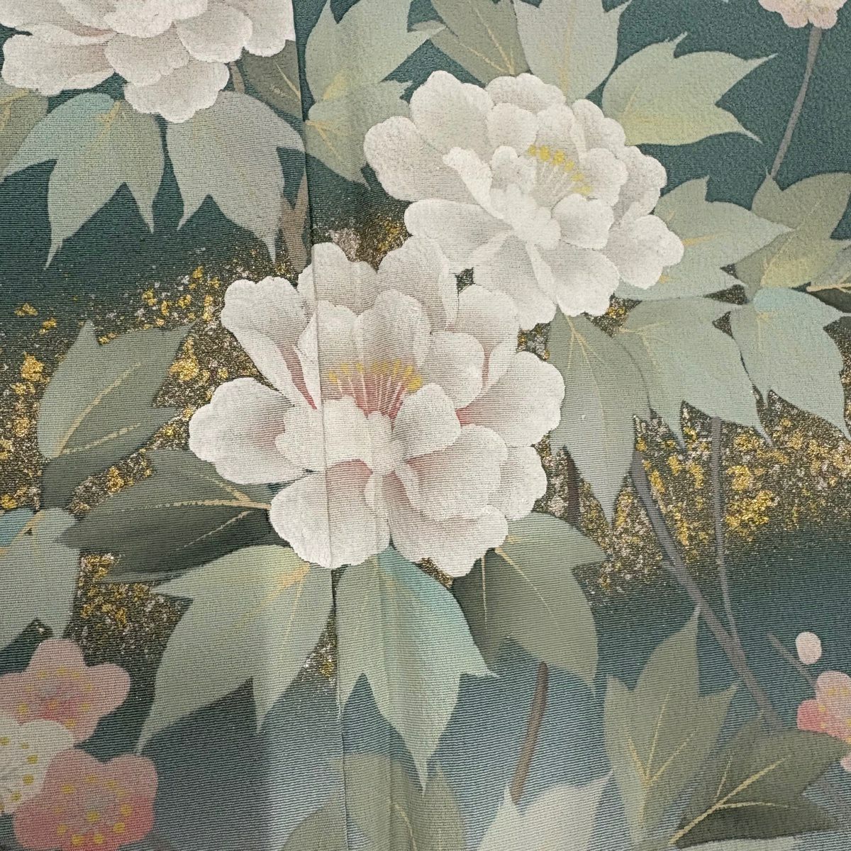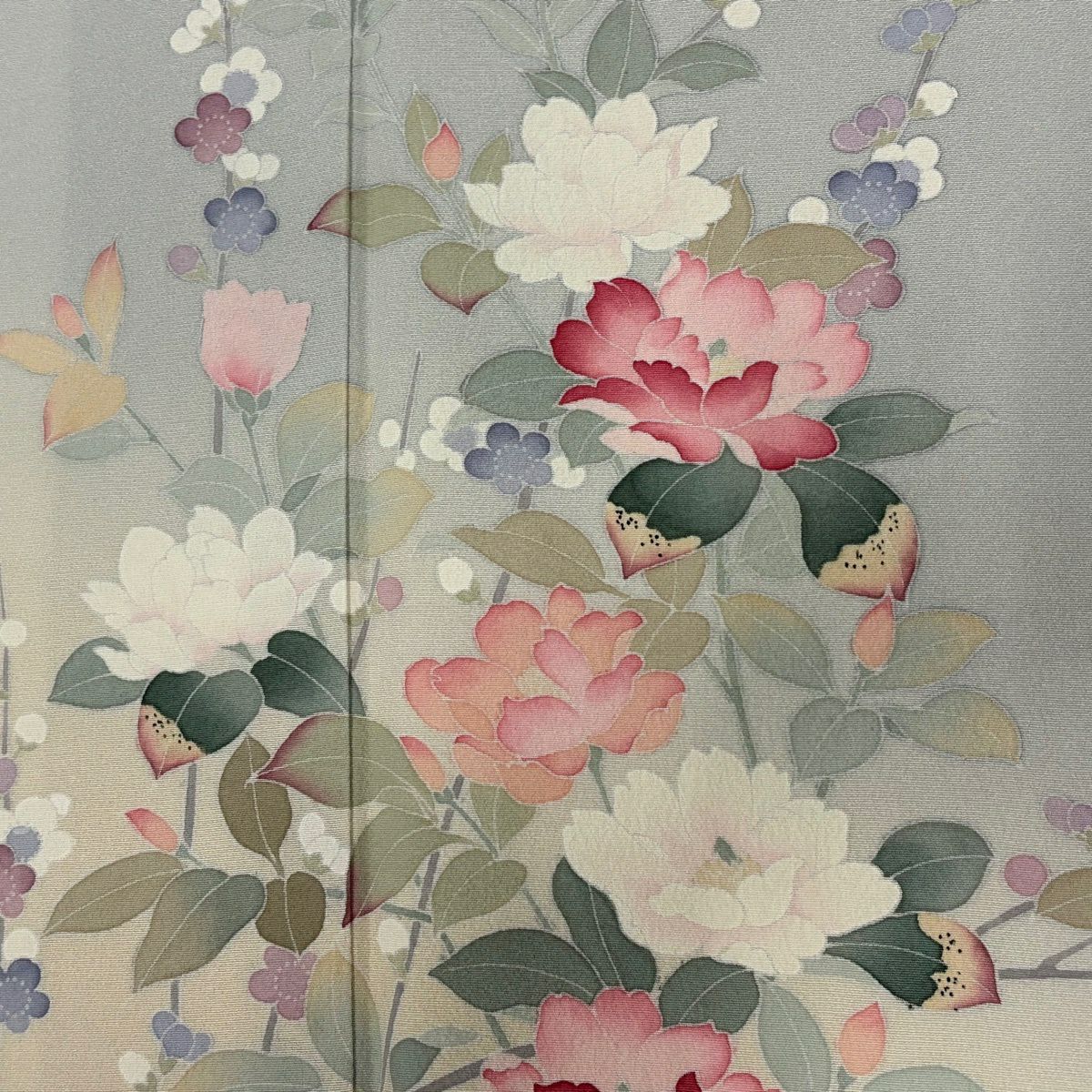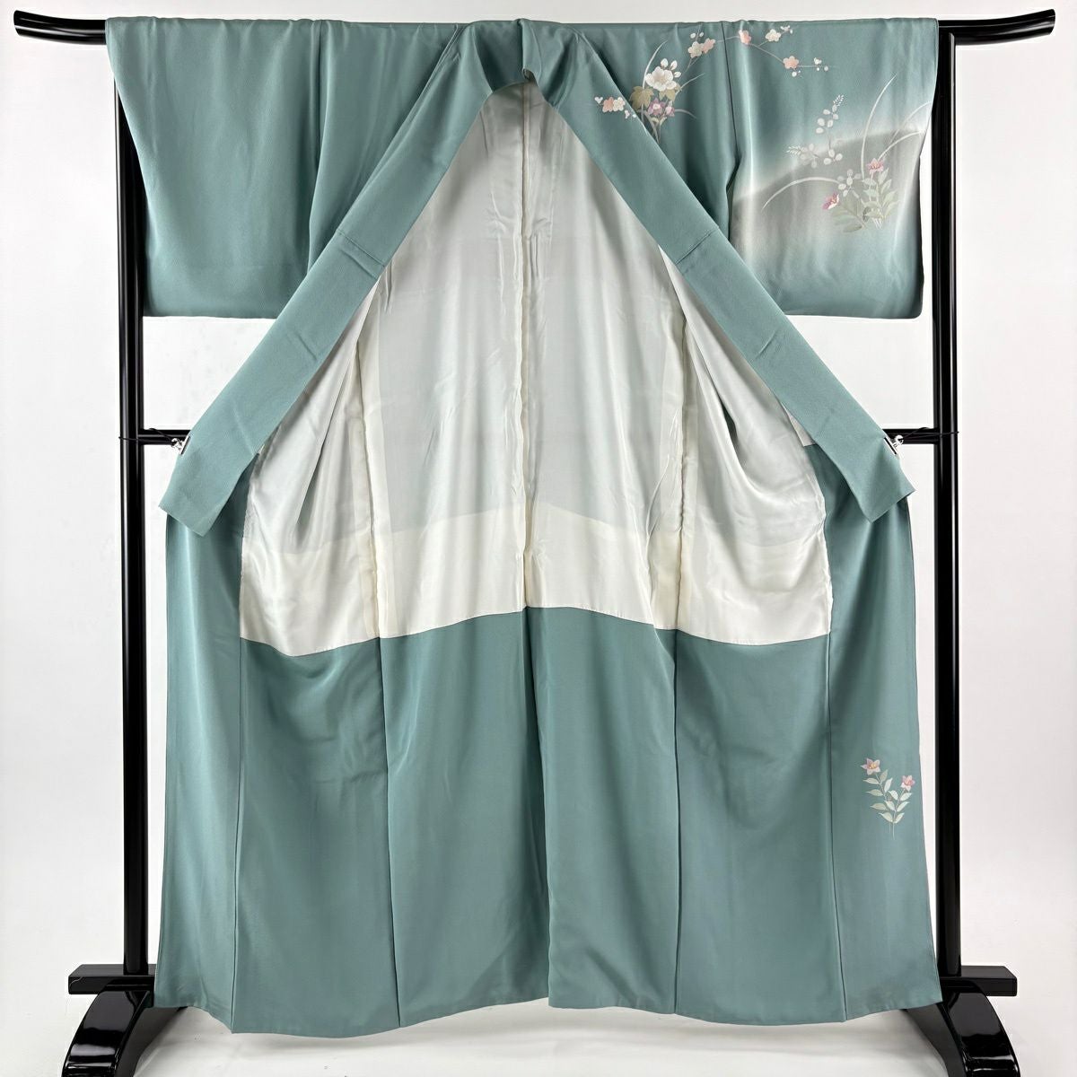 【在庫一掃】 付下げ 身丈156.5cm 裄丈64cm M 袷 落款あり 花 扇面 金彩 ぼかし 灰緑 正絹 秀品