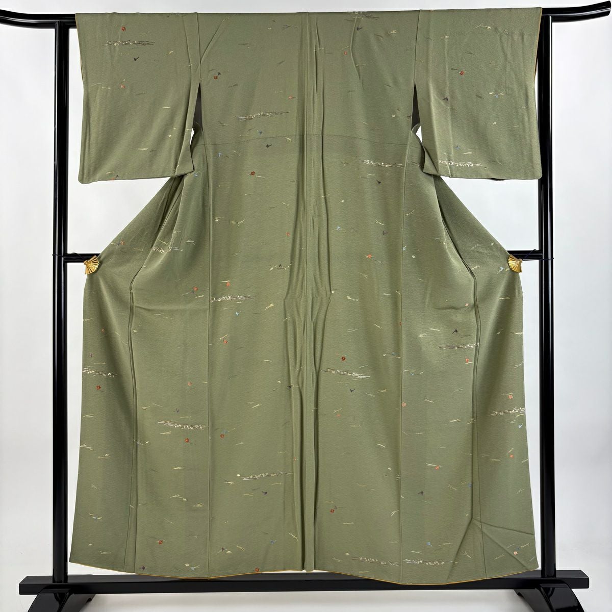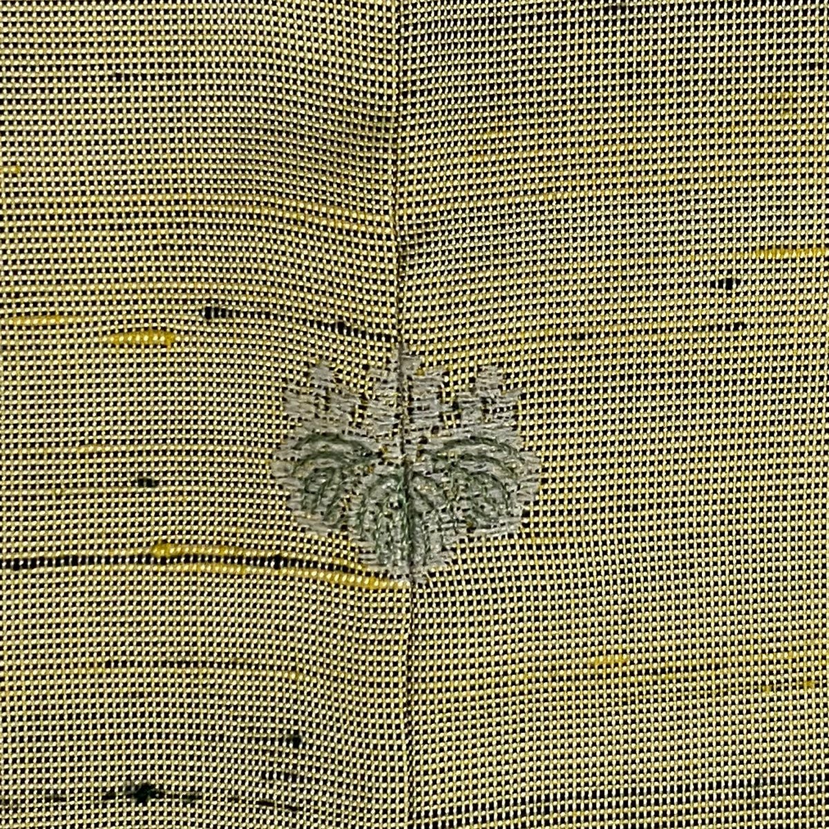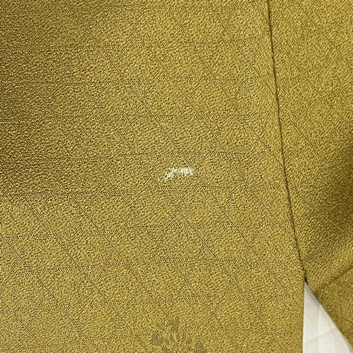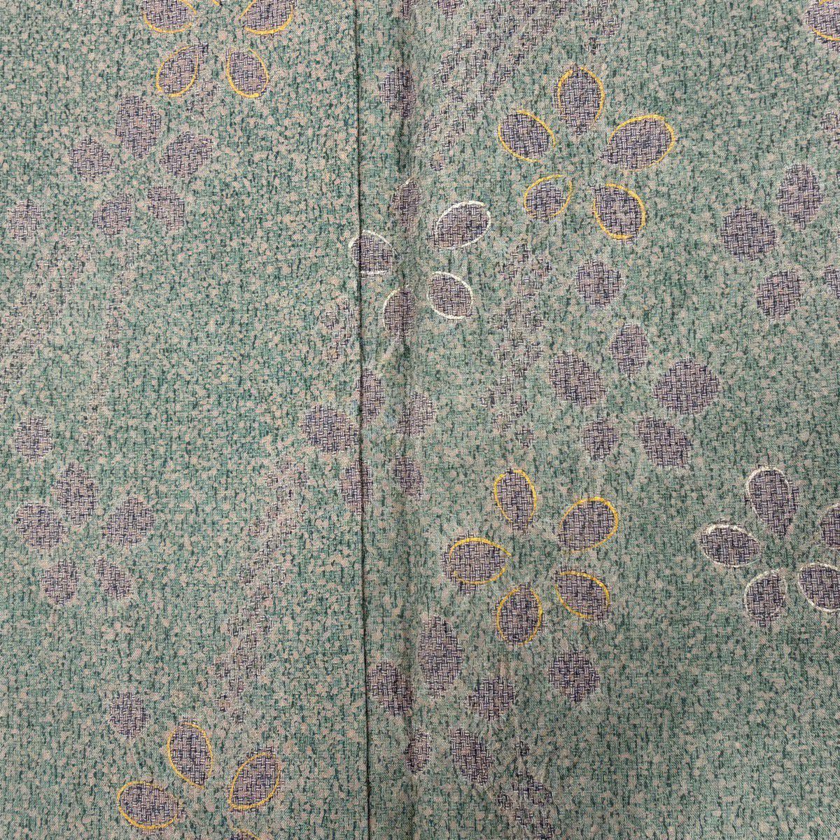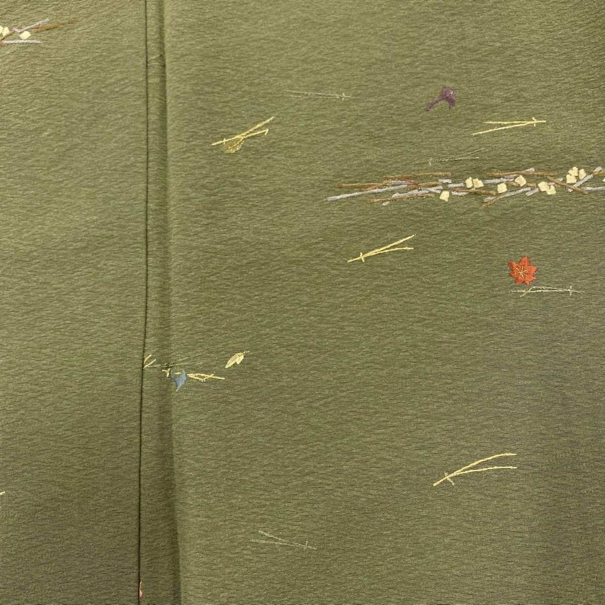【在庫一掃】 小紋 身丈155.5cm 裄丈62cm S 袷 やまと 松葉 葉柄 刺繍 金糸 よもぎ色 正絹 秀品