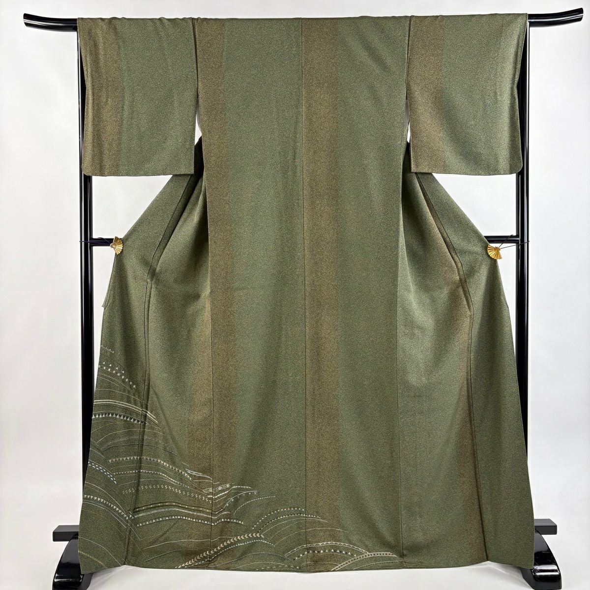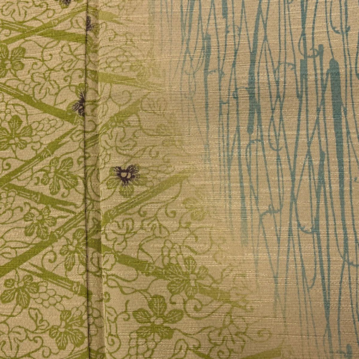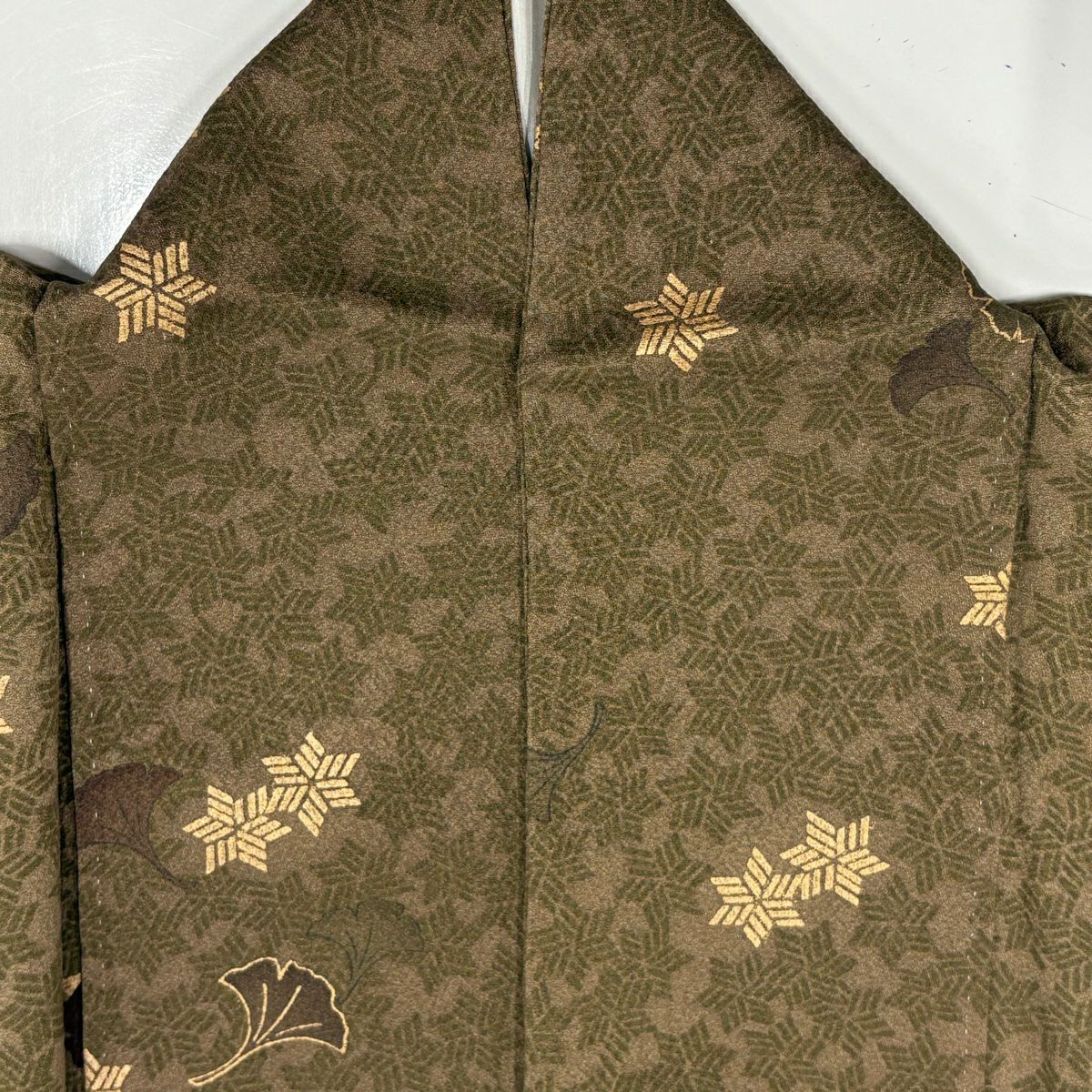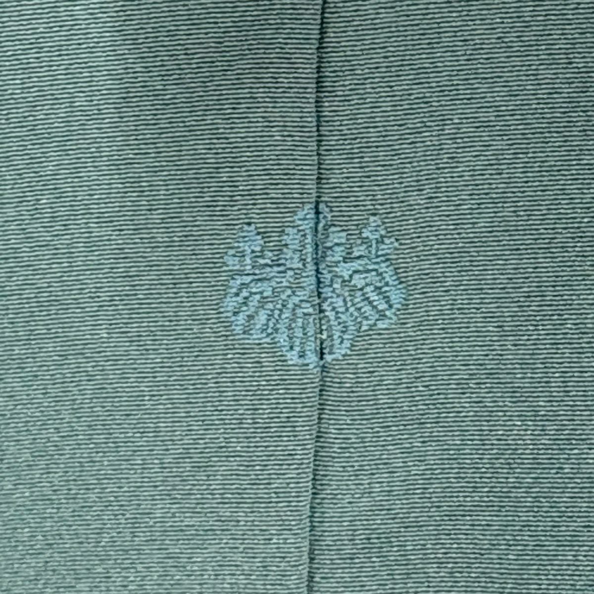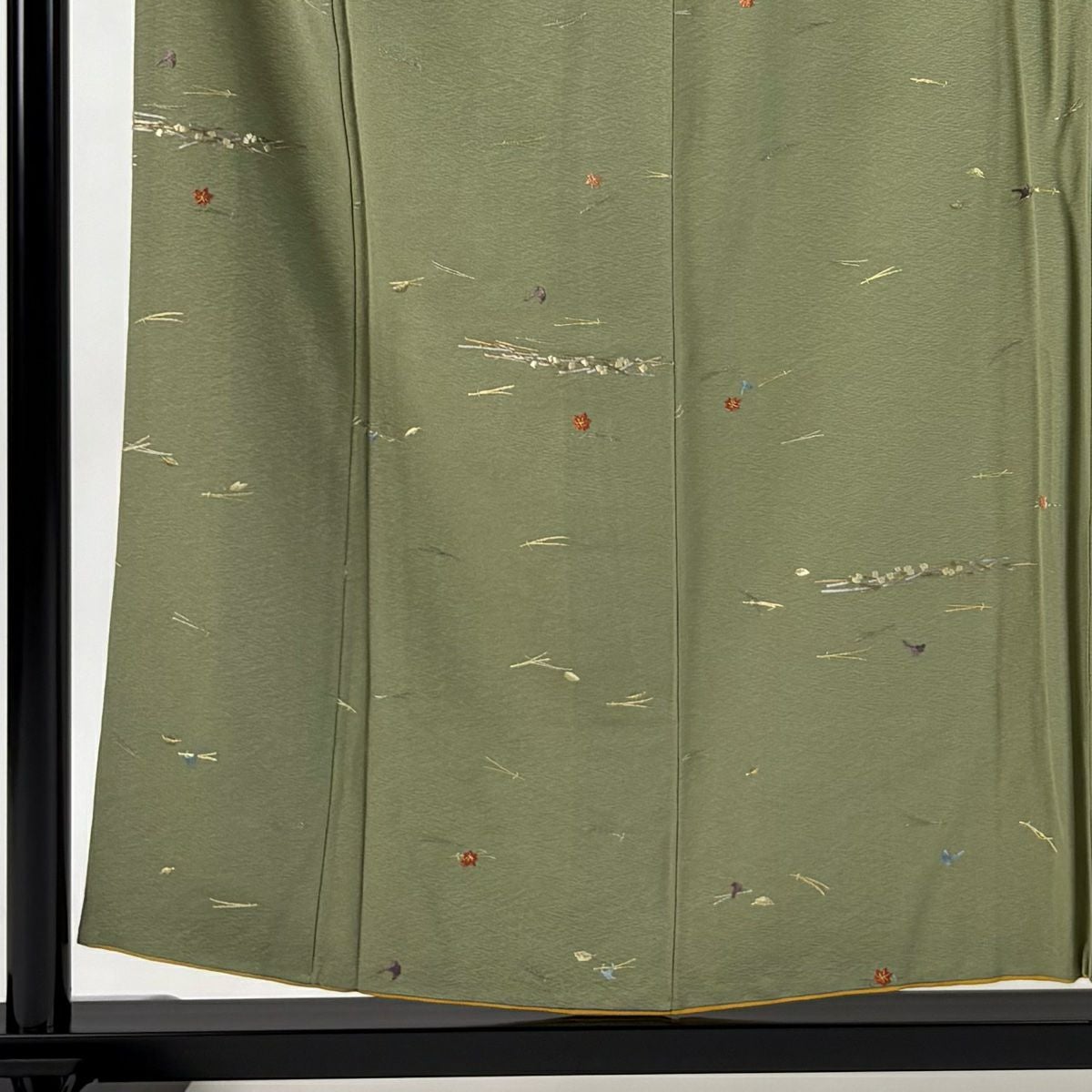 【在庫一掃】 小紋 身丈155.5cm 裄丈62cm S 袷 やまと 松葉 葉柄 刺繍 金糸 よもぎ色 正絹 秀品