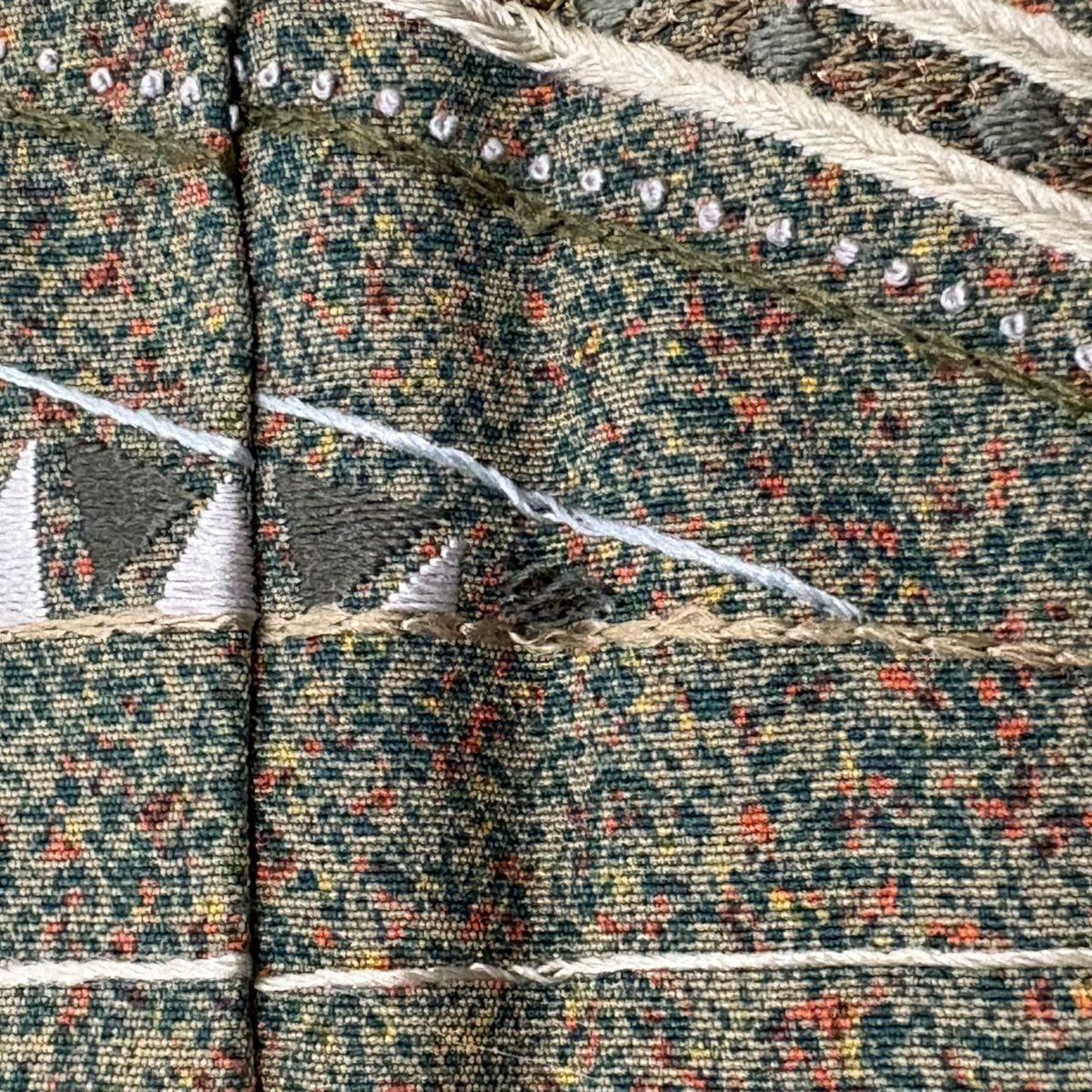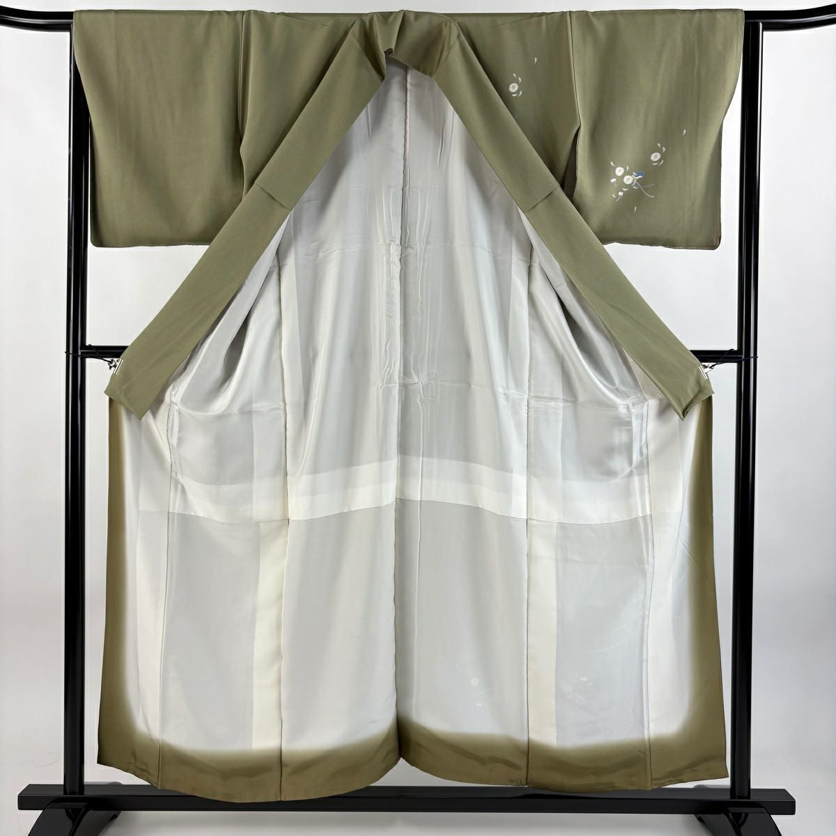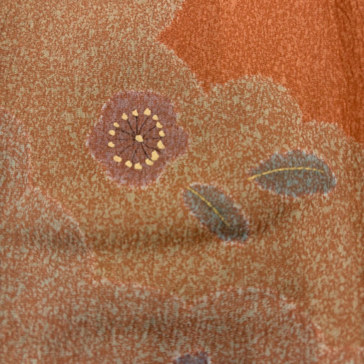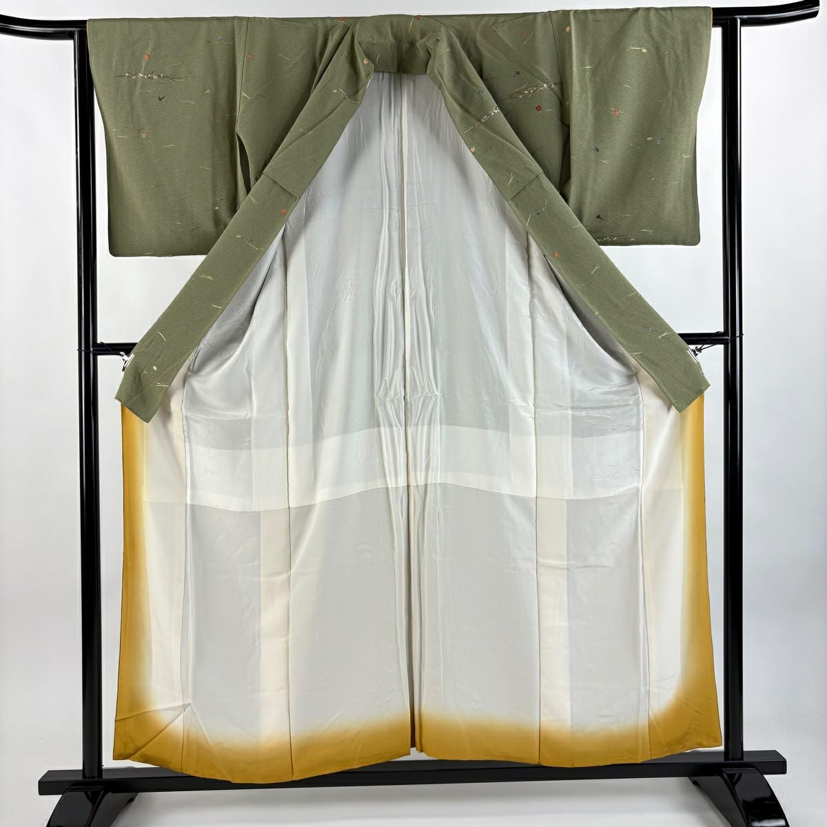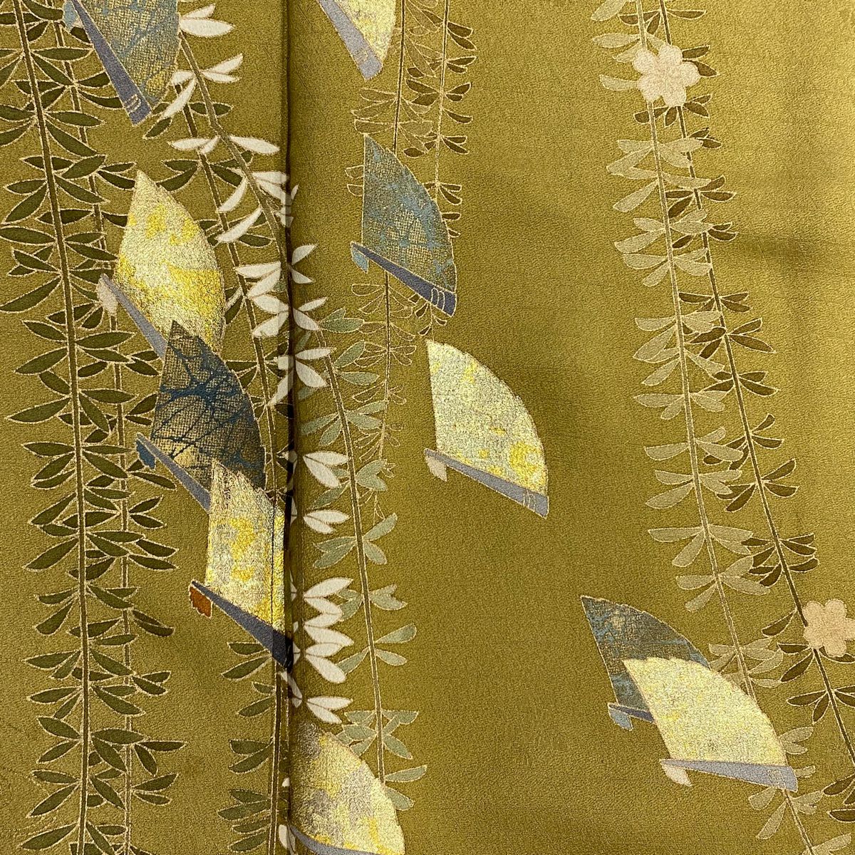 【在庫一掃】 小紋 身丈155.5cm 裄丈62cm S 袷 やまと 松葉 葉柄 刺繍 金糸 よもぎ色 正絹 秀品