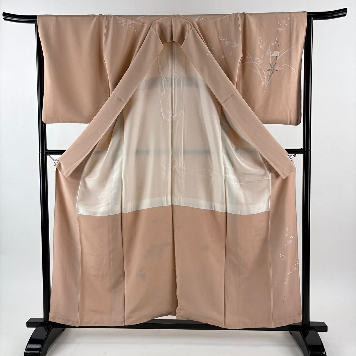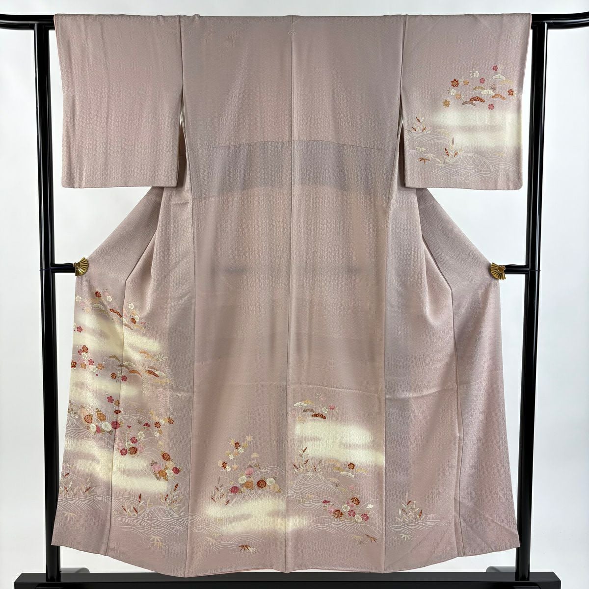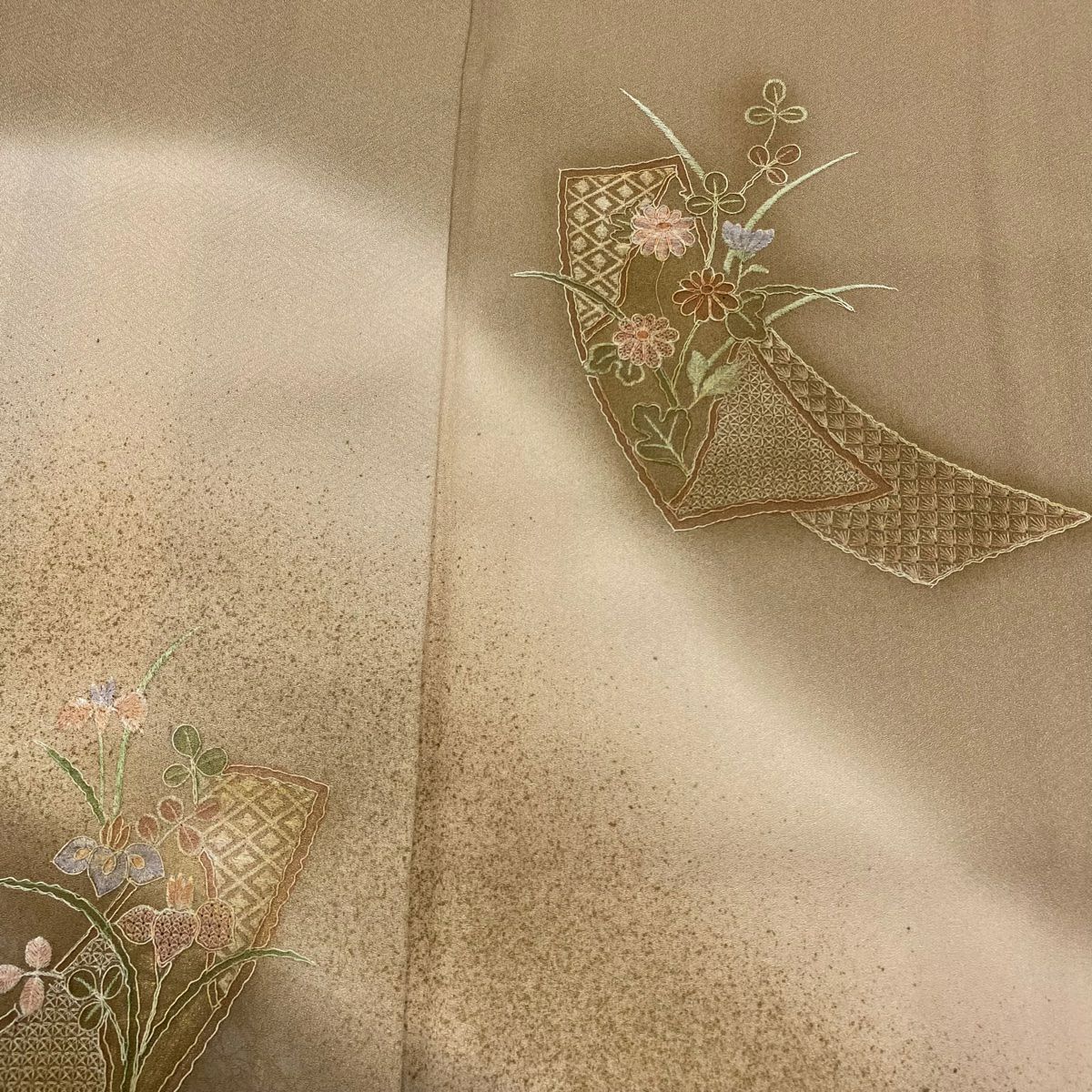 【在庫一掃】 付下げ 身丈159.5cm 裄丈66cm M 袷 短冊 草花 刺繍 金彩 薄茶色 正絹 秀品 一つ紋