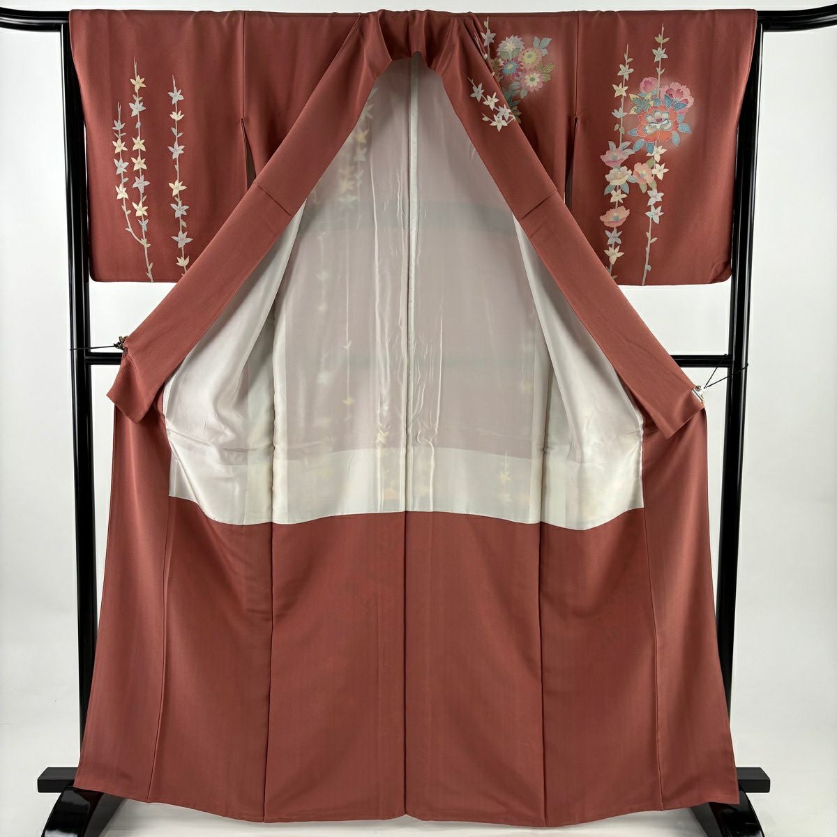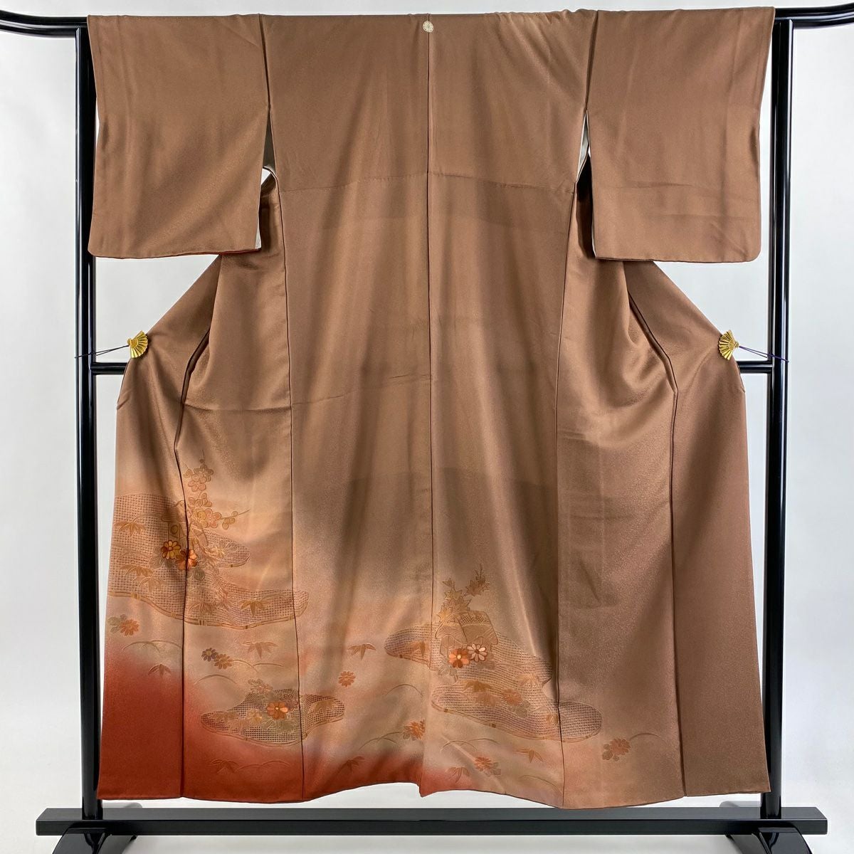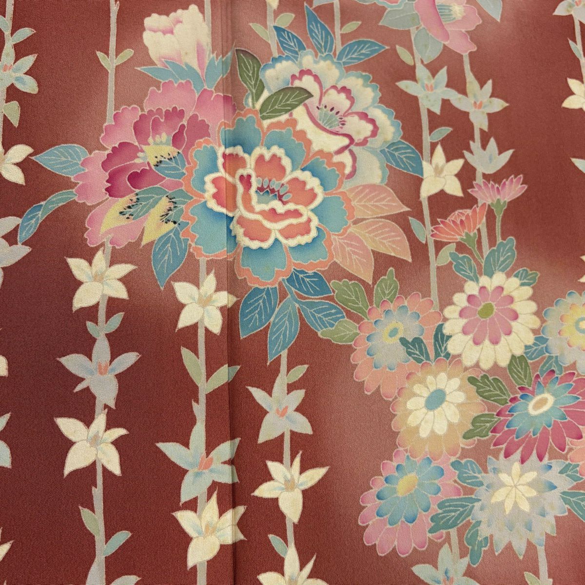 【在庫一掃】 訪問着 身丈151.5cm 裄丈64.5cm M 袷 家屋 草花 刺繍 ぼかし 赤茶 正絹 秀品 一つ紋