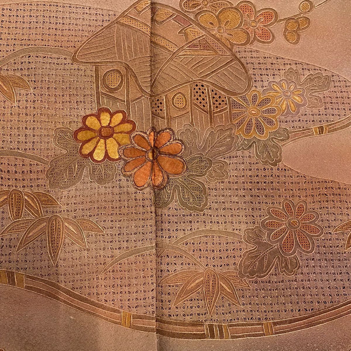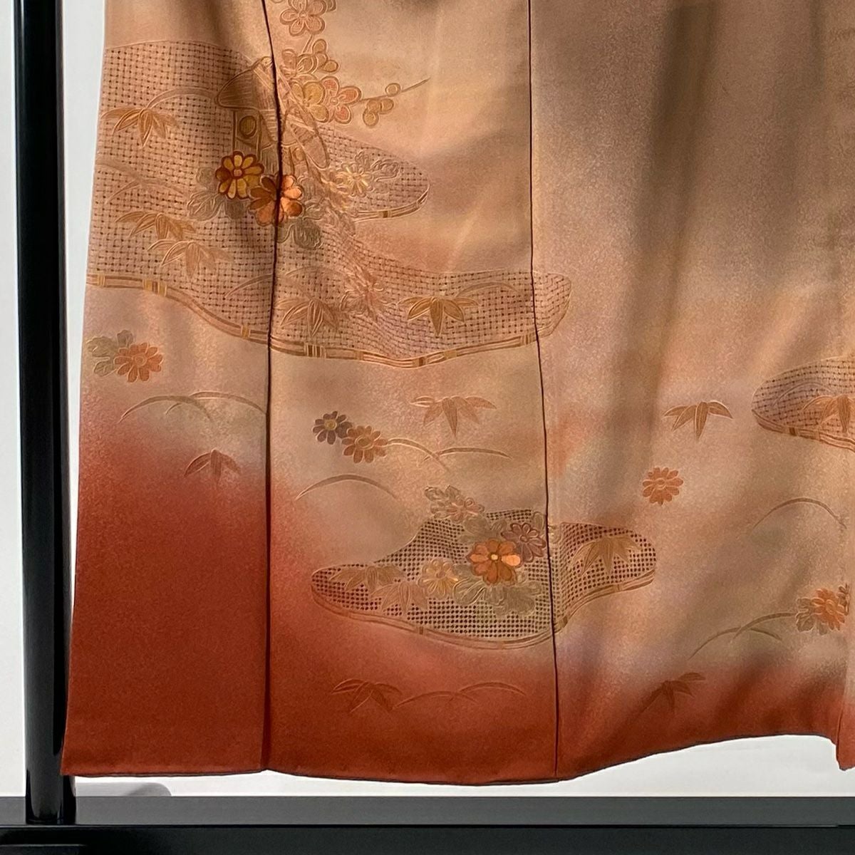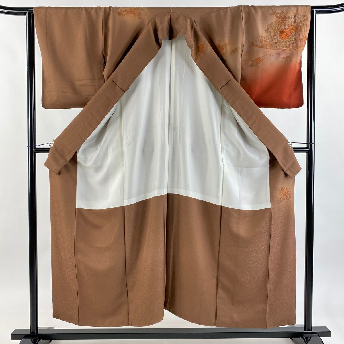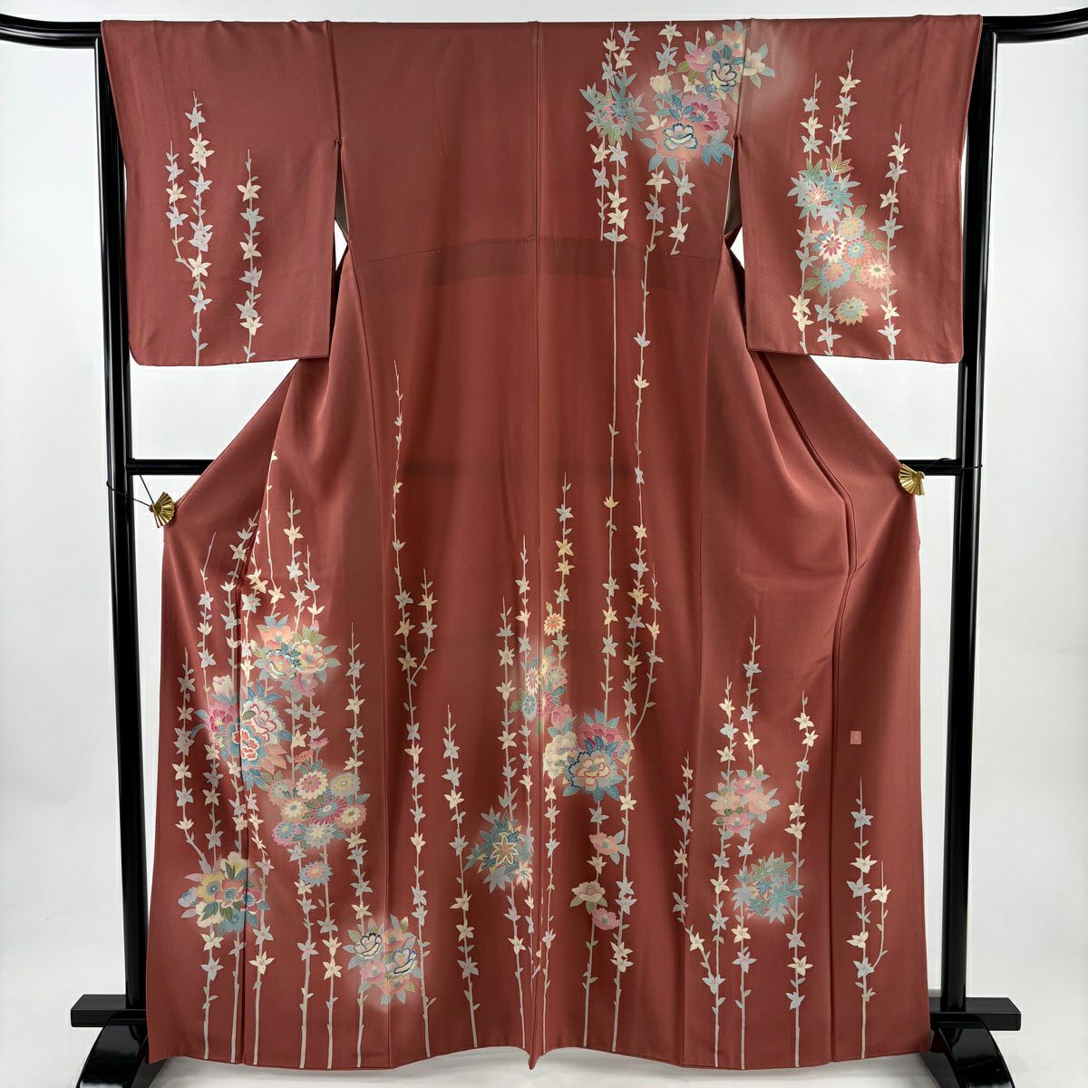 【在庫一掃】 訪問着 身丈151.5cm 裄丈64.5cm M 袷 家屋 草花 刺繍 ぼかし 赤茶 正絹 秀品 一つ紋