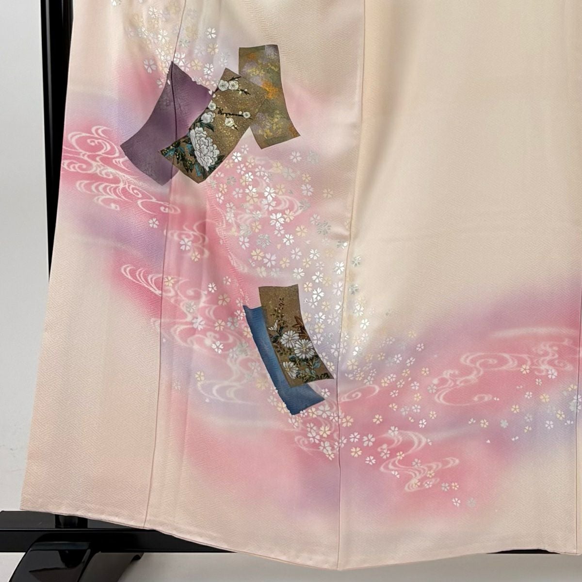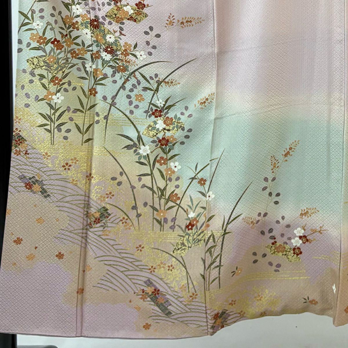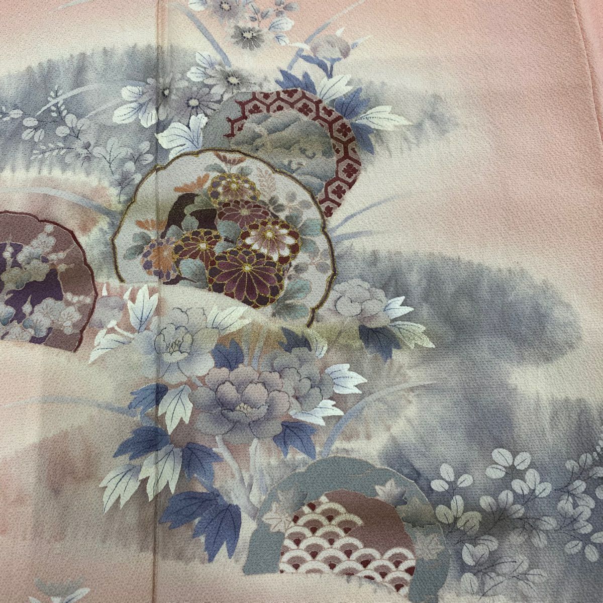 【在庫一掃】 付下げ 身丈159cm 裄丈64.5cm M 袷 短冊 草花 金銀彩 ぼかし 薄ピンク 正絹 秀品