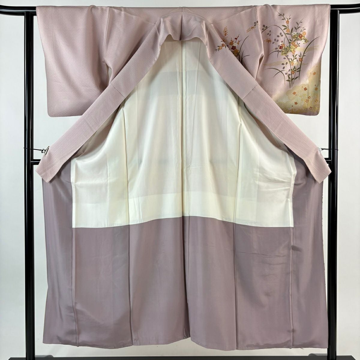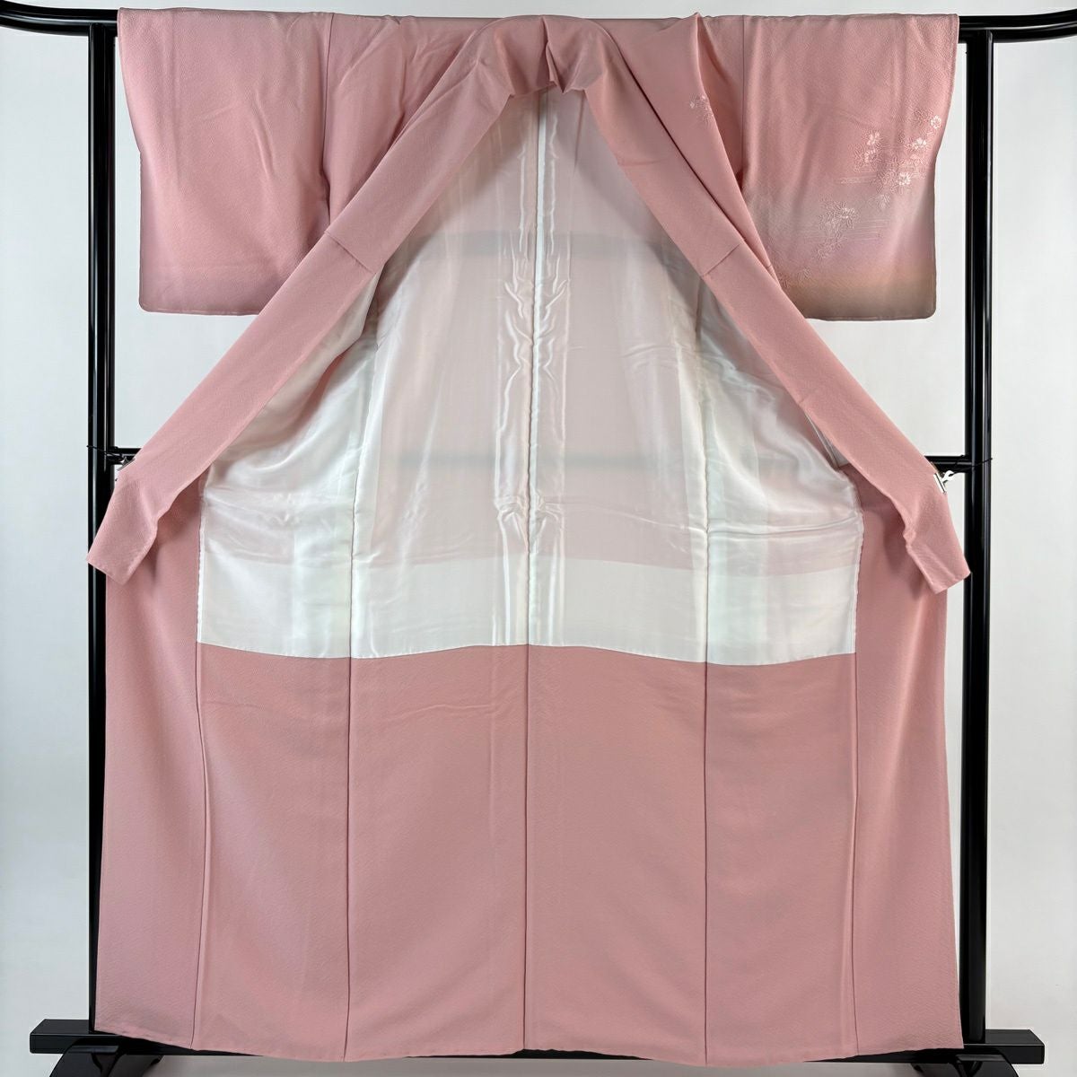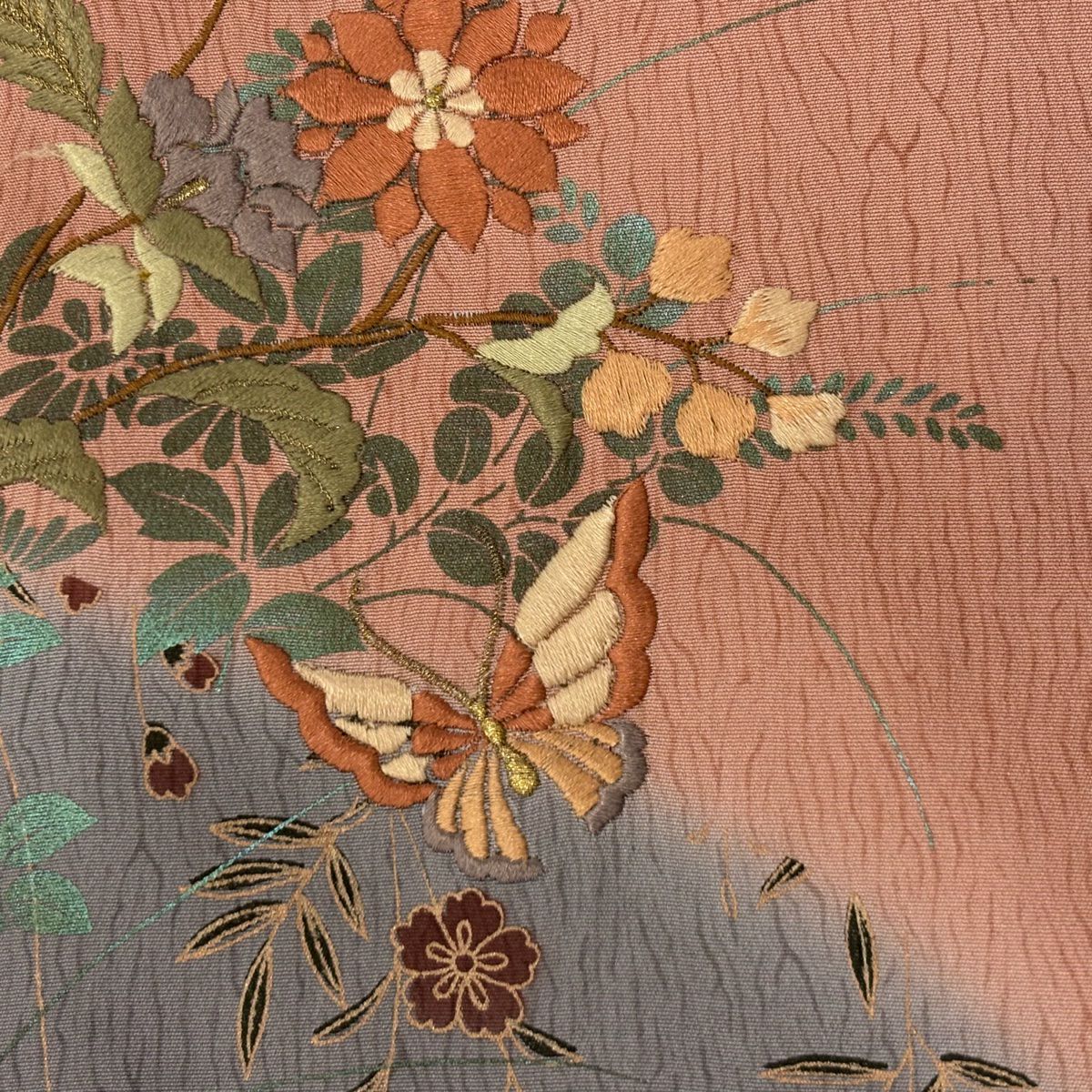 【在庫一掃】 付下げ 身丈156.5cm 裄丈62.5cm S 袷 鈴乃屋 草花 蝶 刺繍 金糸 ピンク 正絹 秀品