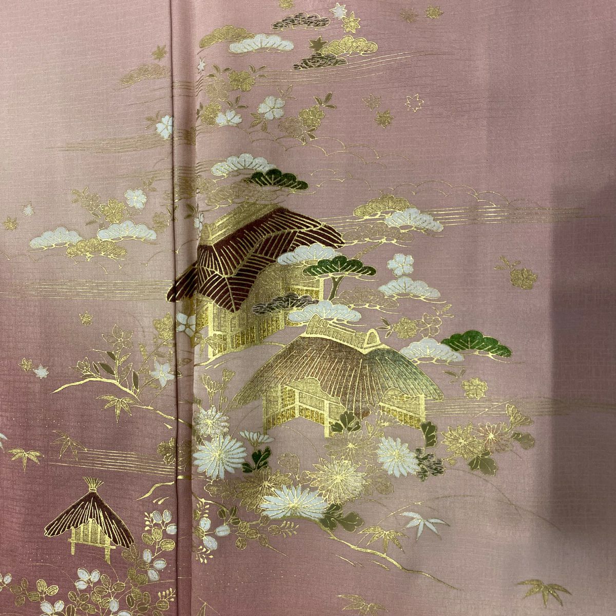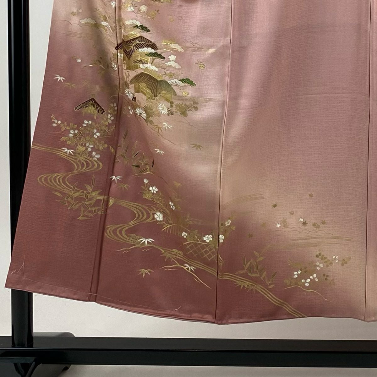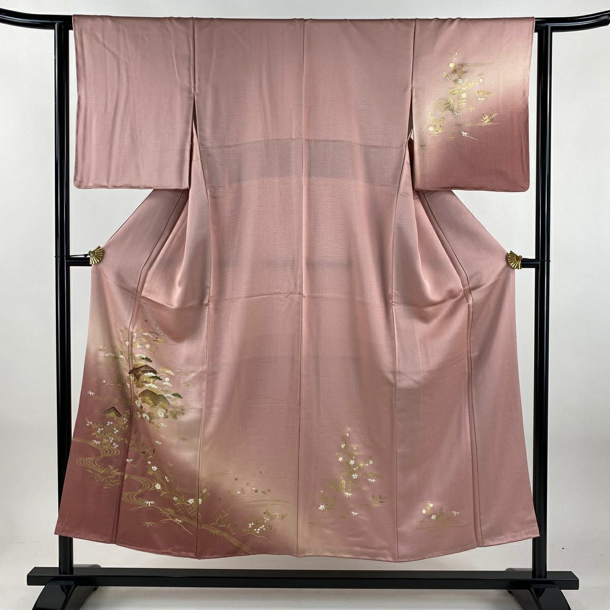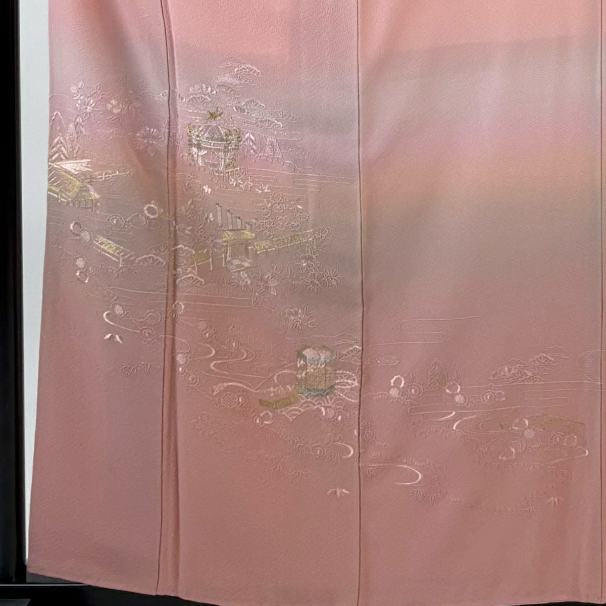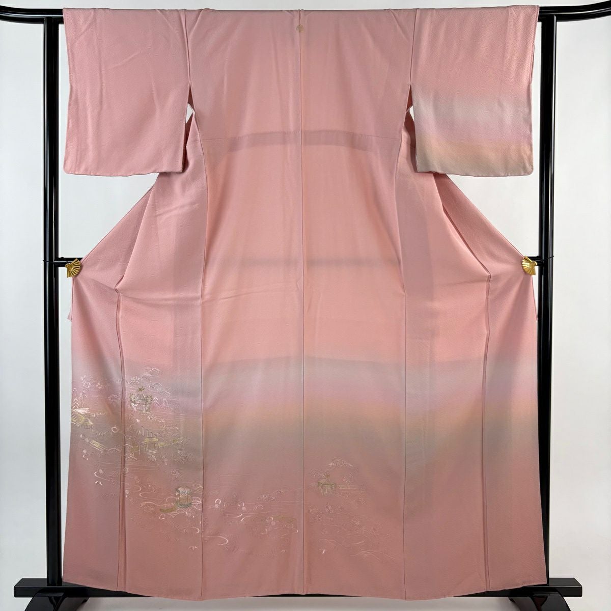 【在庫一掃】 【美品】 訪問着 身丈151cm 裄丈63cm S 袷 家屋 流水 金彩 ぼかし ピンク 正絹 秀品