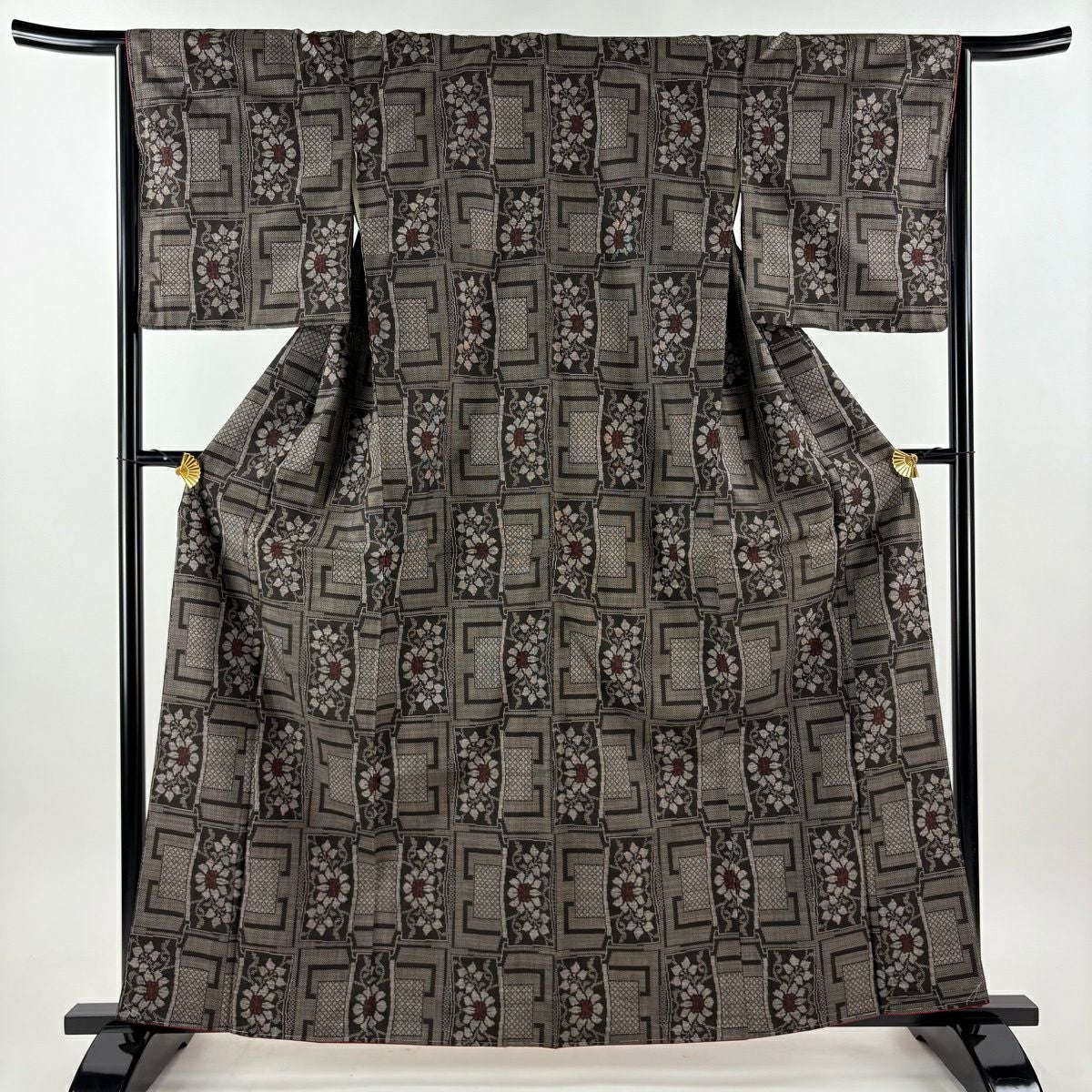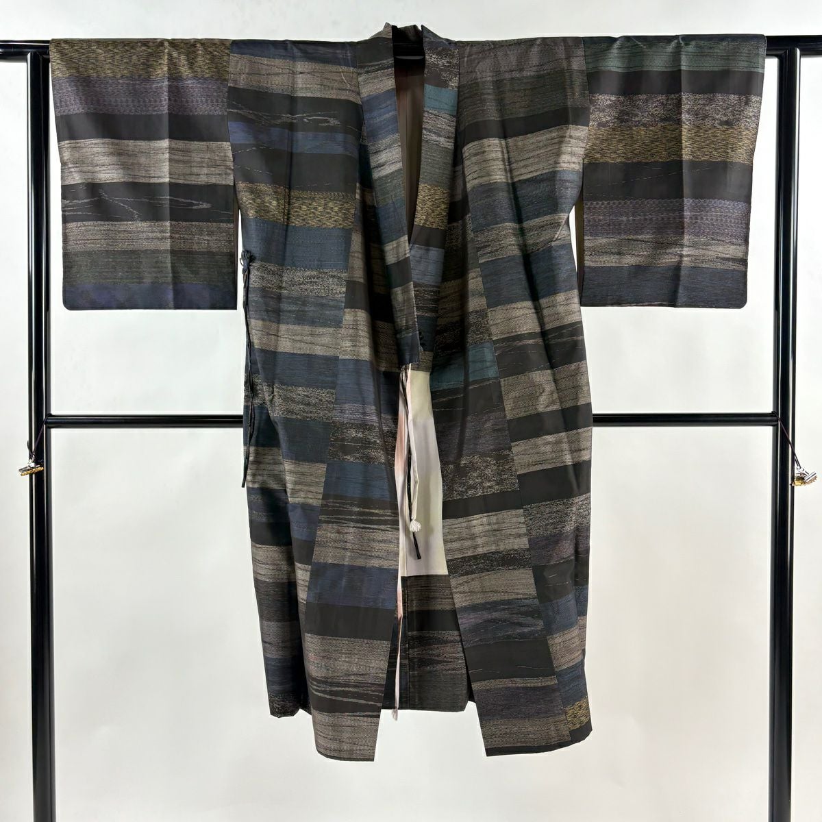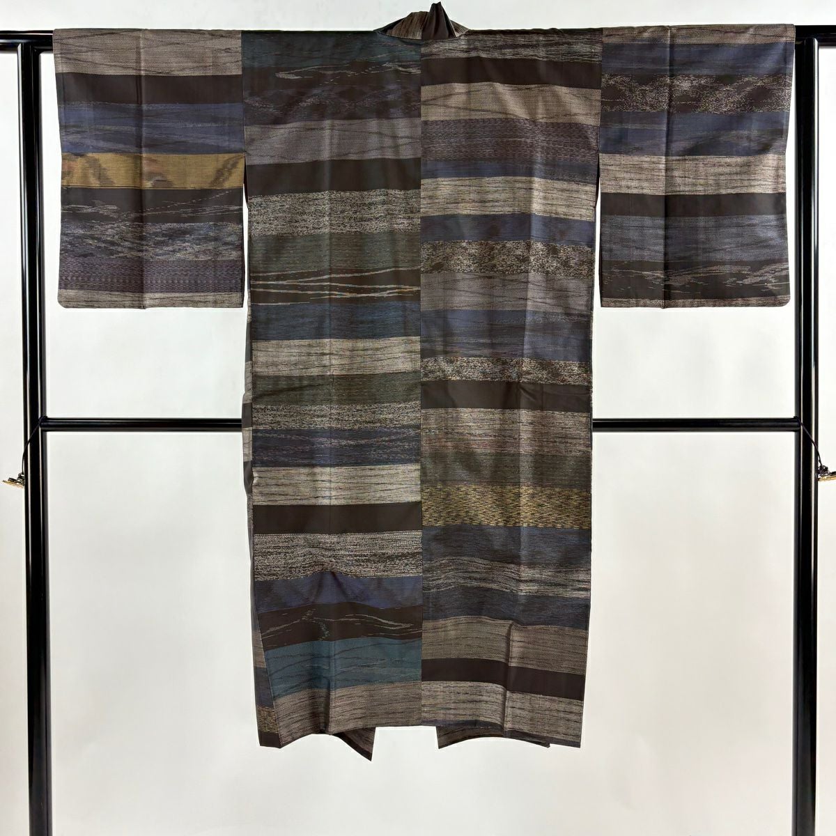 【在庫一掃】 道中着 身丈120cm 裄丈62cm S 紬地 和装コート 着物衿 段縞 幾何学 焦茶色 正絹 秀品