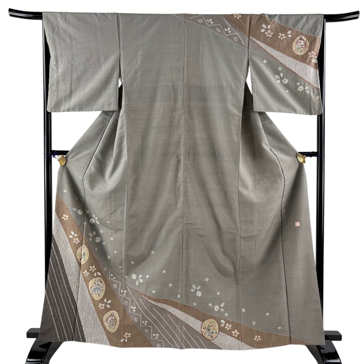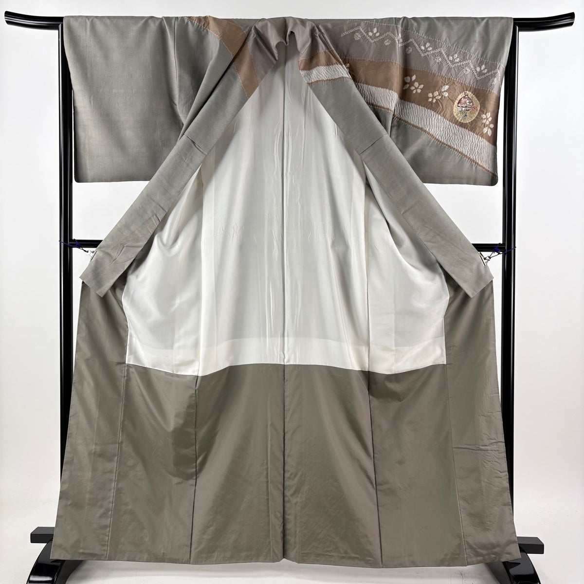 訪問着 身丈165cm 裄丈66cm M 袷 紬地 落款あり 草花 ゆきんこ 絞り 灰色 正絹 秀品