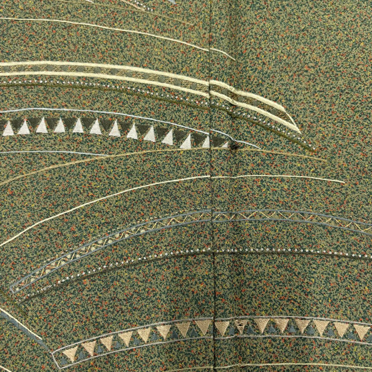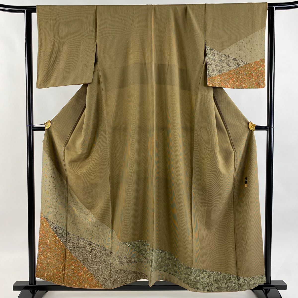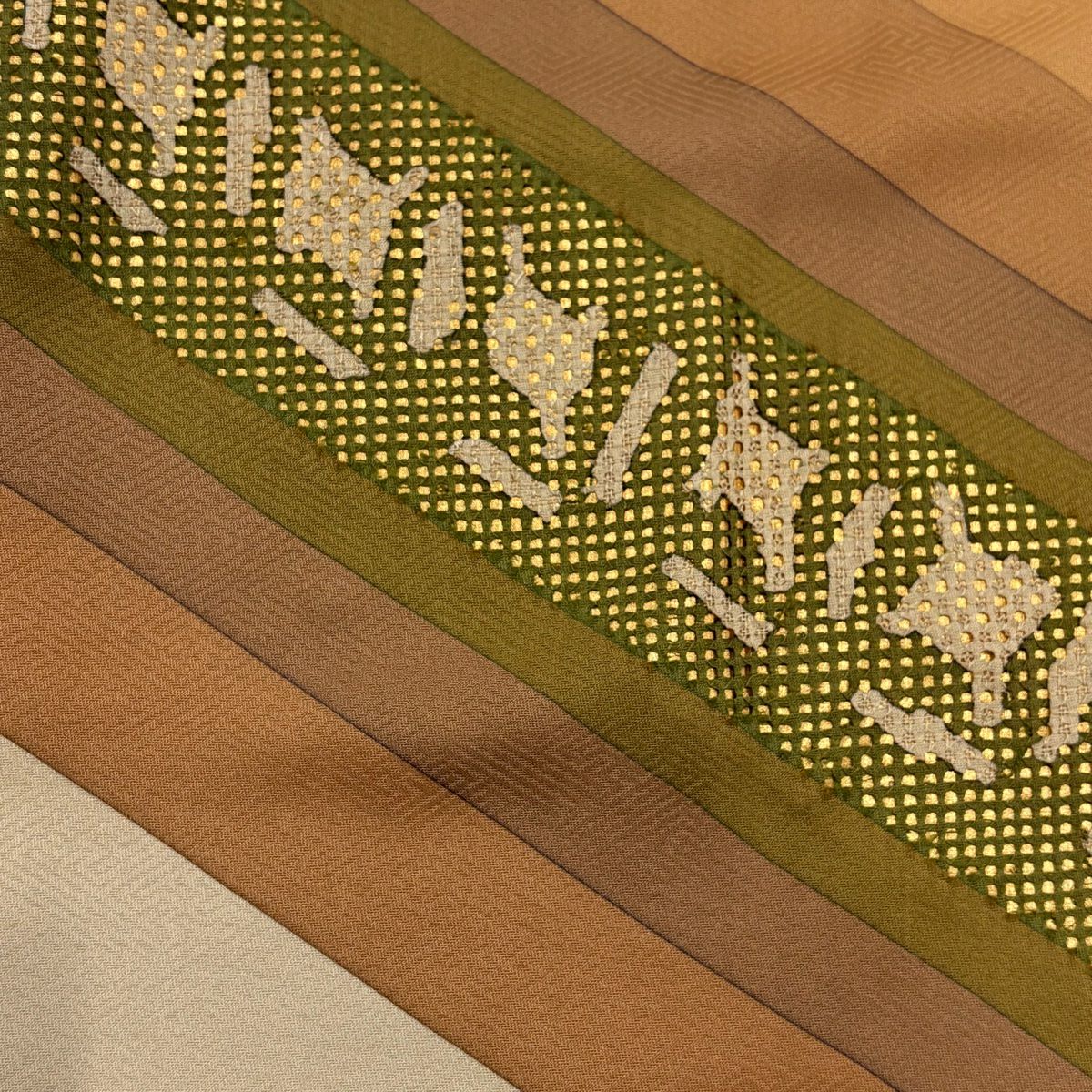 【在庫一掃】 【美品】 付下げ 身丈167.5cm 裄丈66cm M 袷 幾何学模様 刺繍 金糸 茶緑色 正絹 秀品