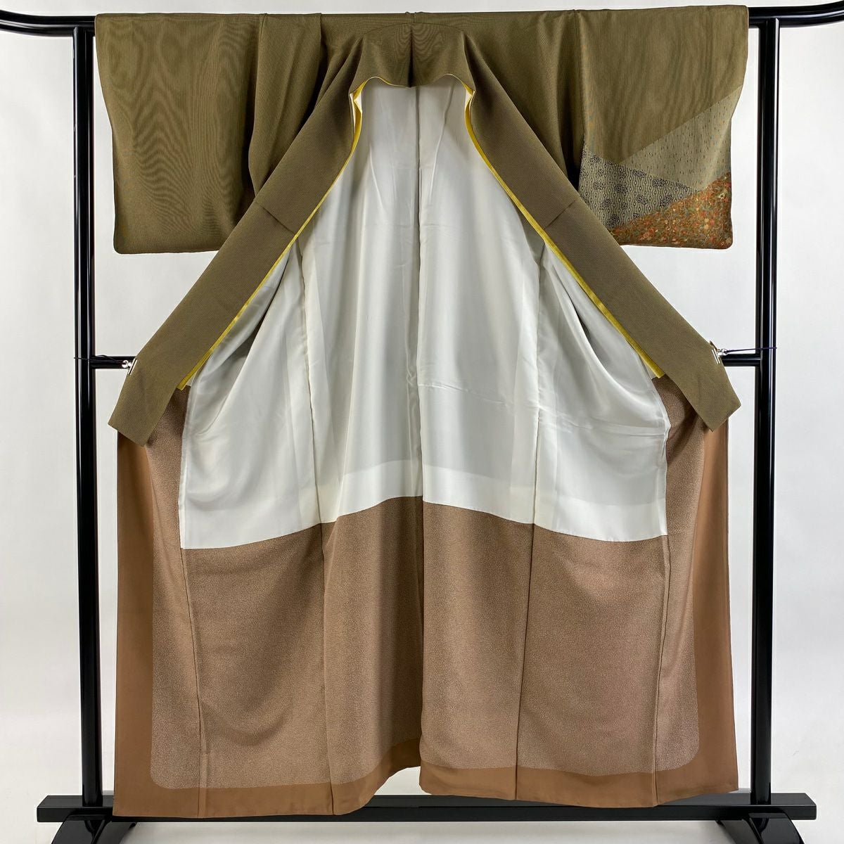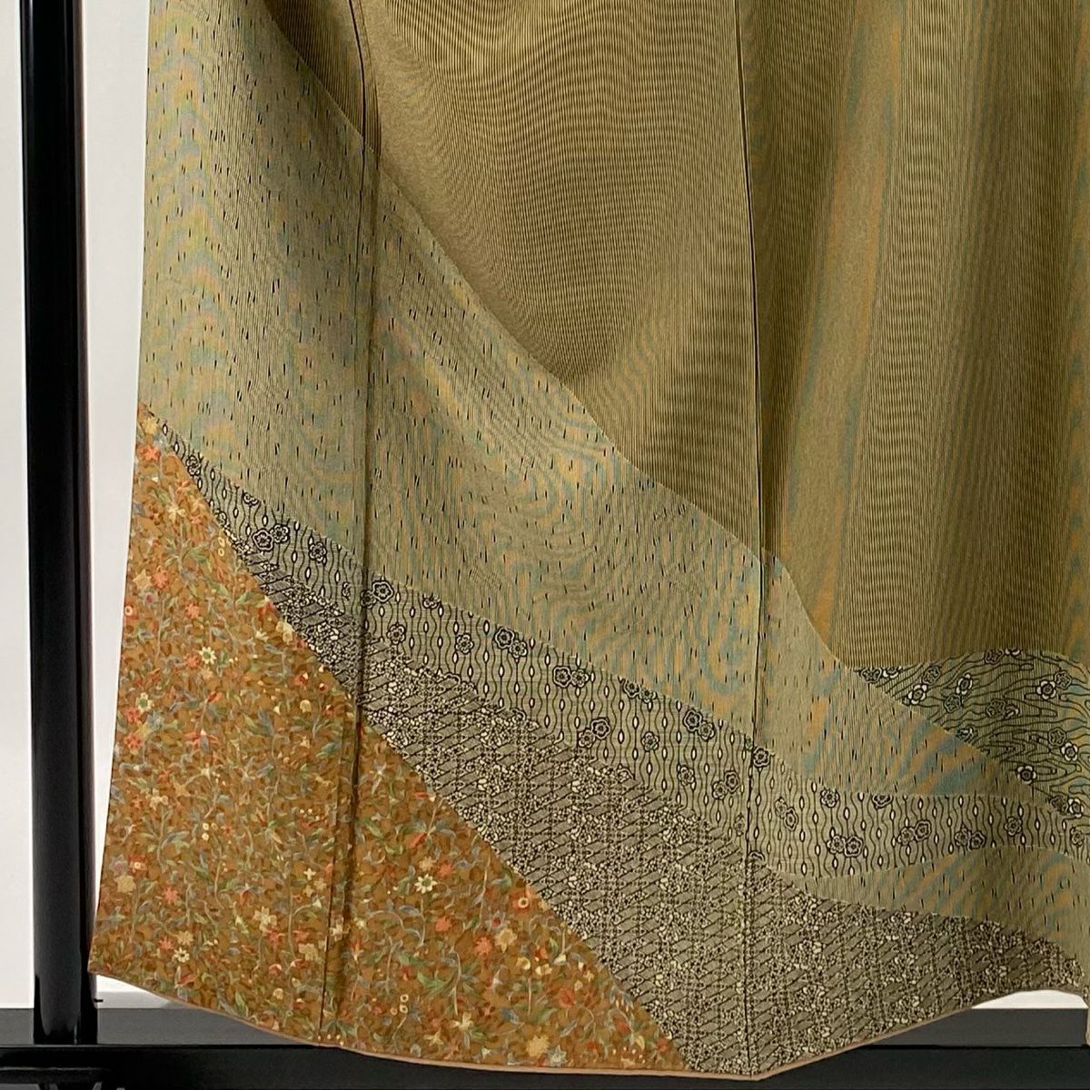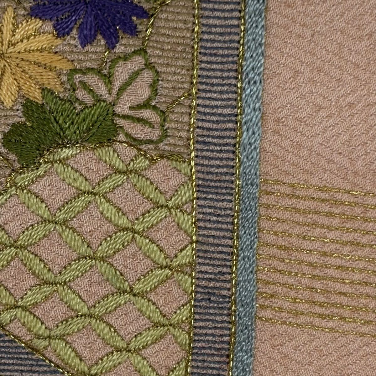【在庫一掃】 【美品】 付下げ 身丈167.5cm 裄丈66cm M 袷 幾何学模様 刺繍 金糸 茶緑色 正絹 秀品