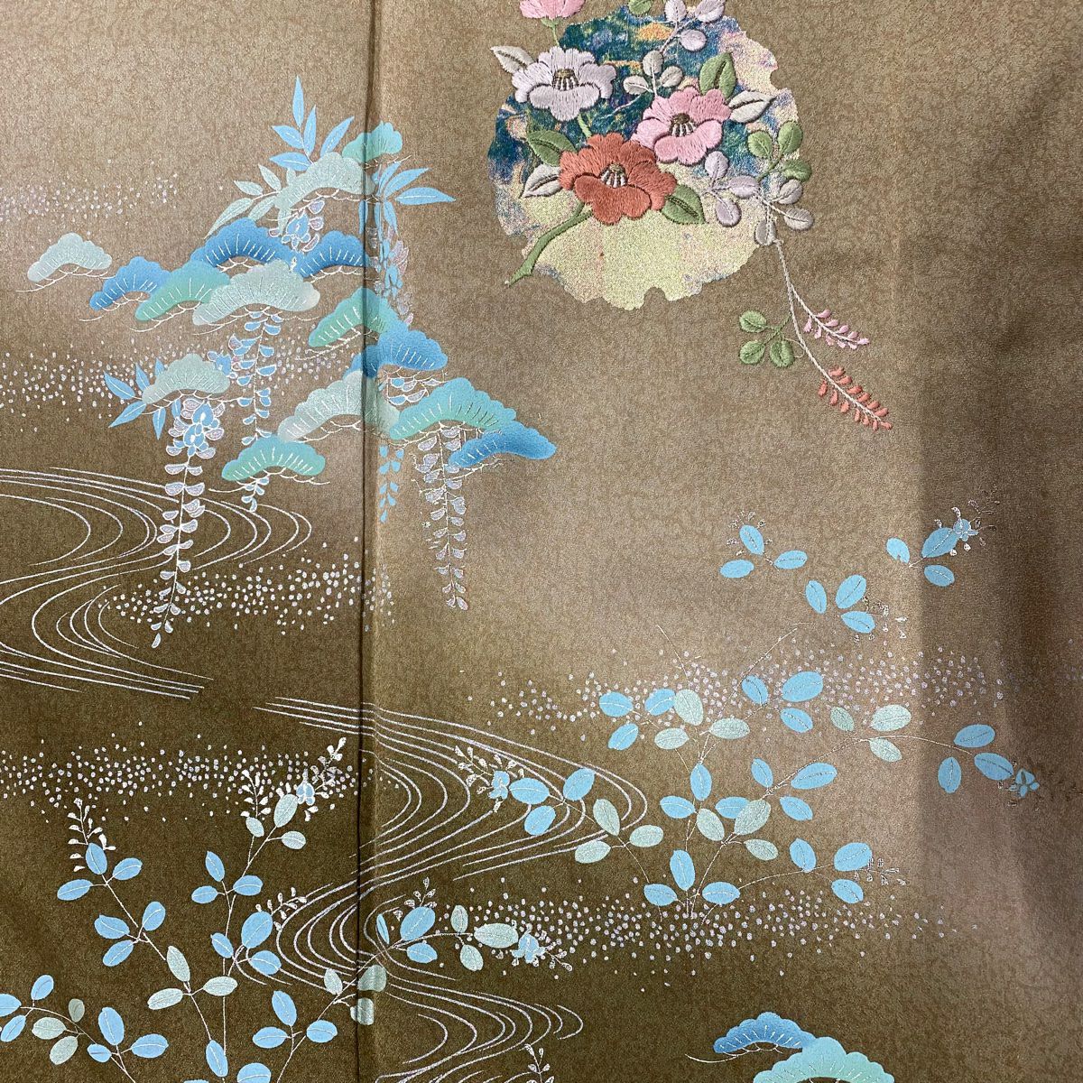 【在庫一掃】 【美品】 付下げ 身丈171cm 裄丈66.5cm M 袷 椿 流水 刺繍 金銀彩 薄茶色 正絹 秀品