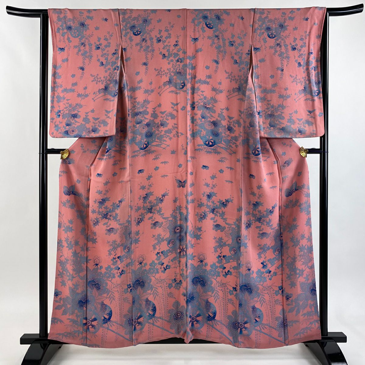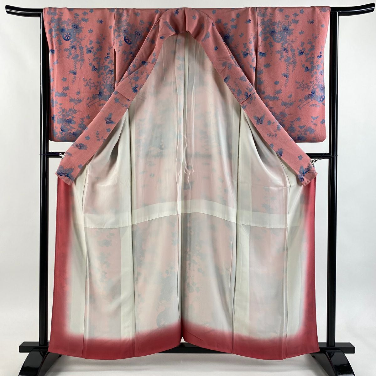 【在庫一掃】 【美品】 小紋 身丈157.5cm 裄丈63.5cm S 袷 花車 蝶 縮緬 ぼかし ピンク 正絹 秀品