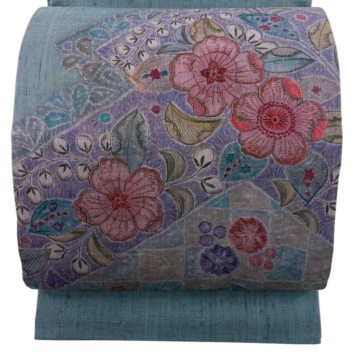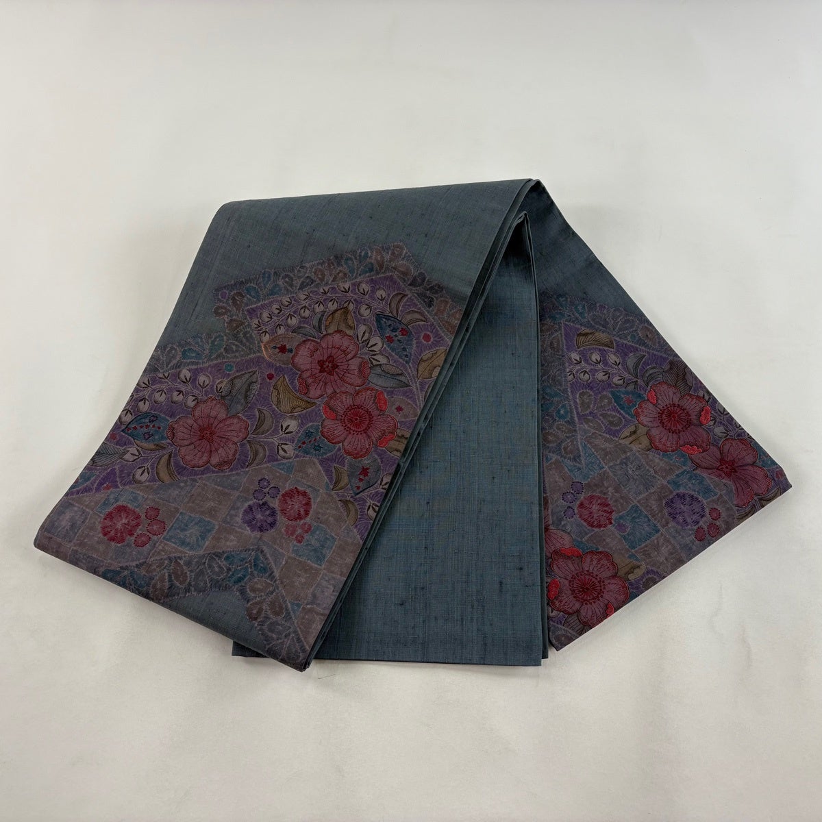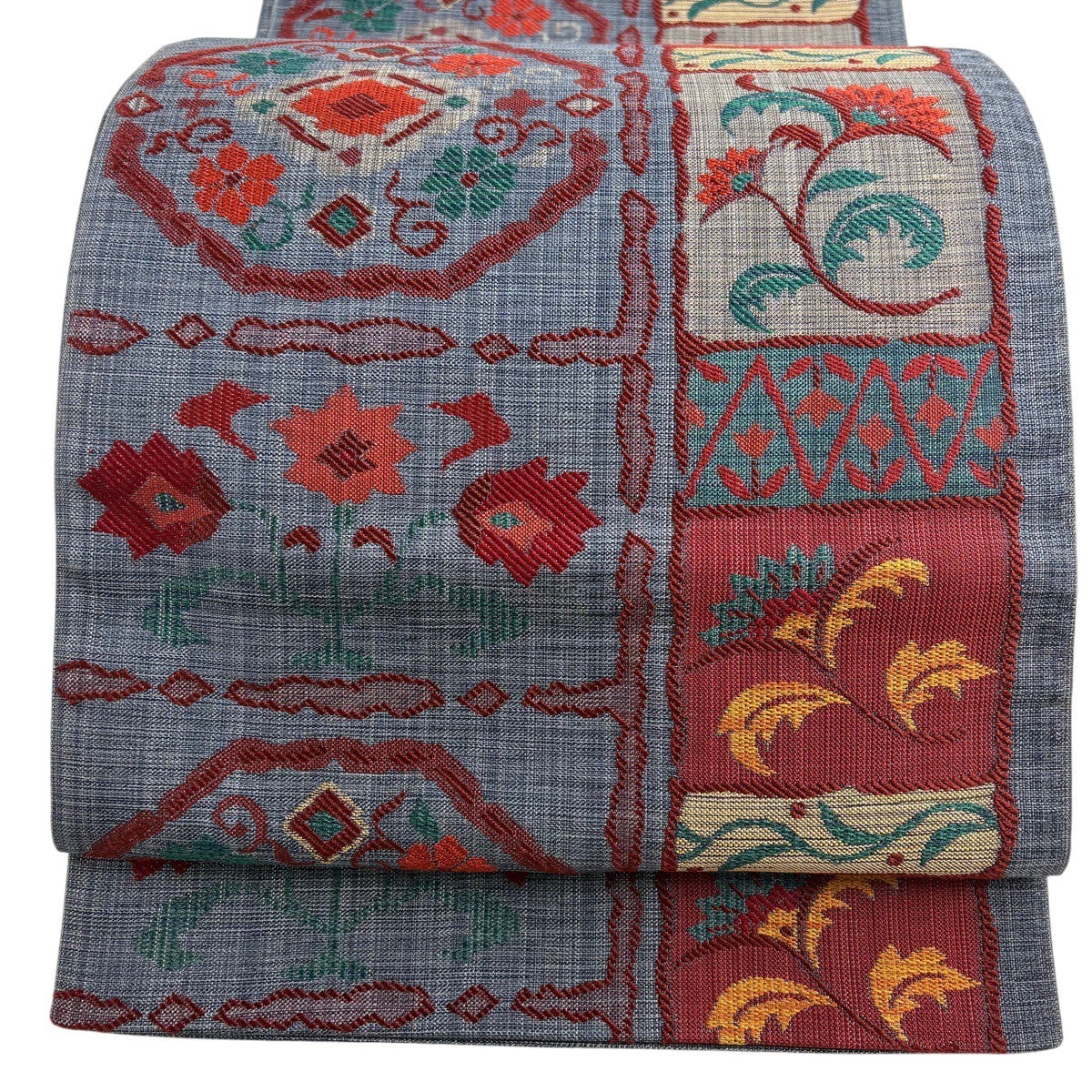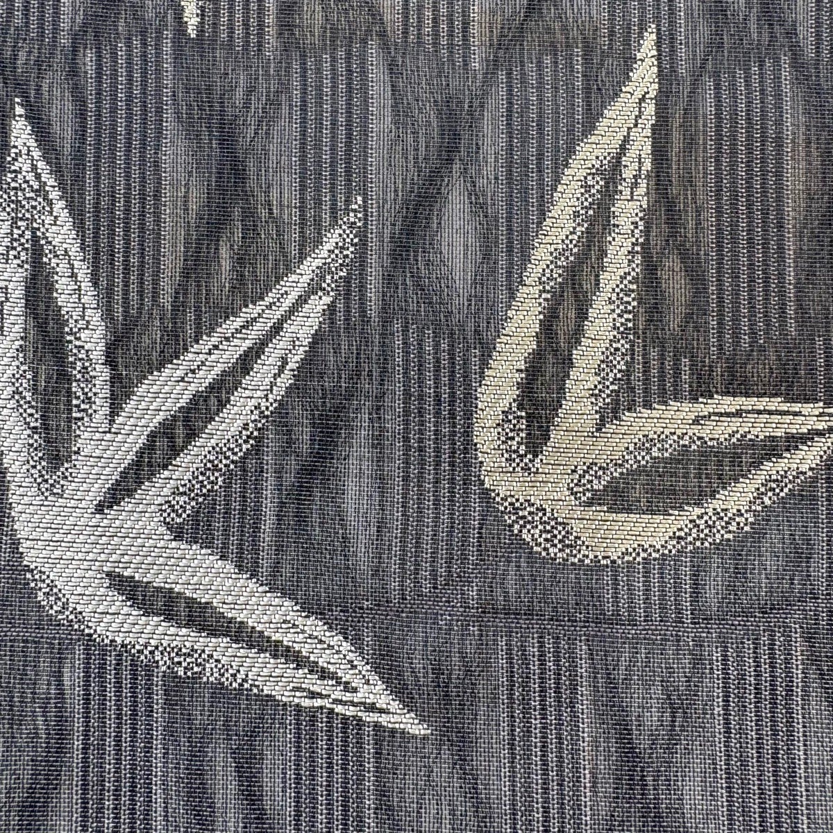 袋帯 秀品 扇面 枝花 銀糸 箔 灰色 六通 正絹