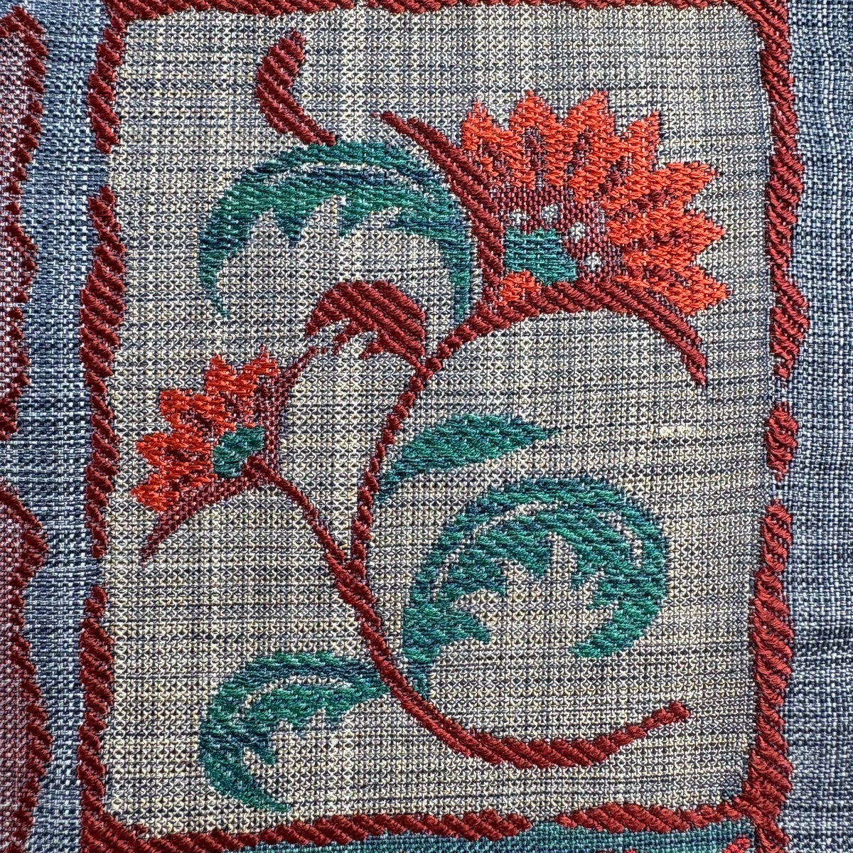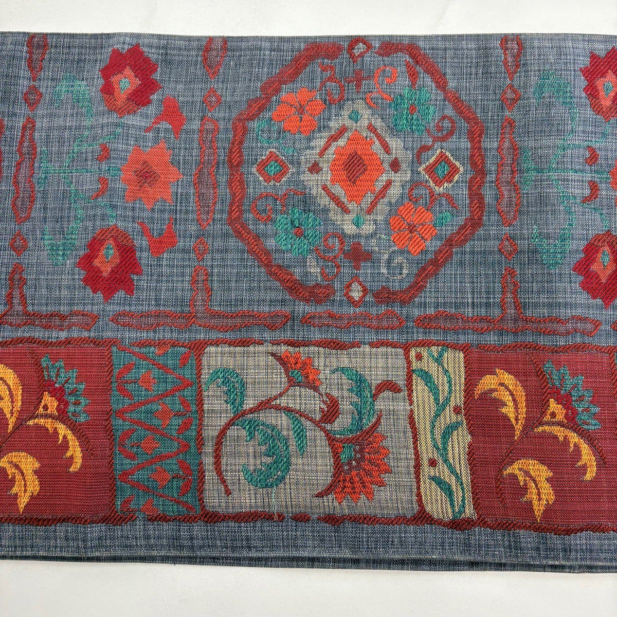 袋帯 秀品 紬地 草花 唐草 灰緑 お太鼓柄 正絹