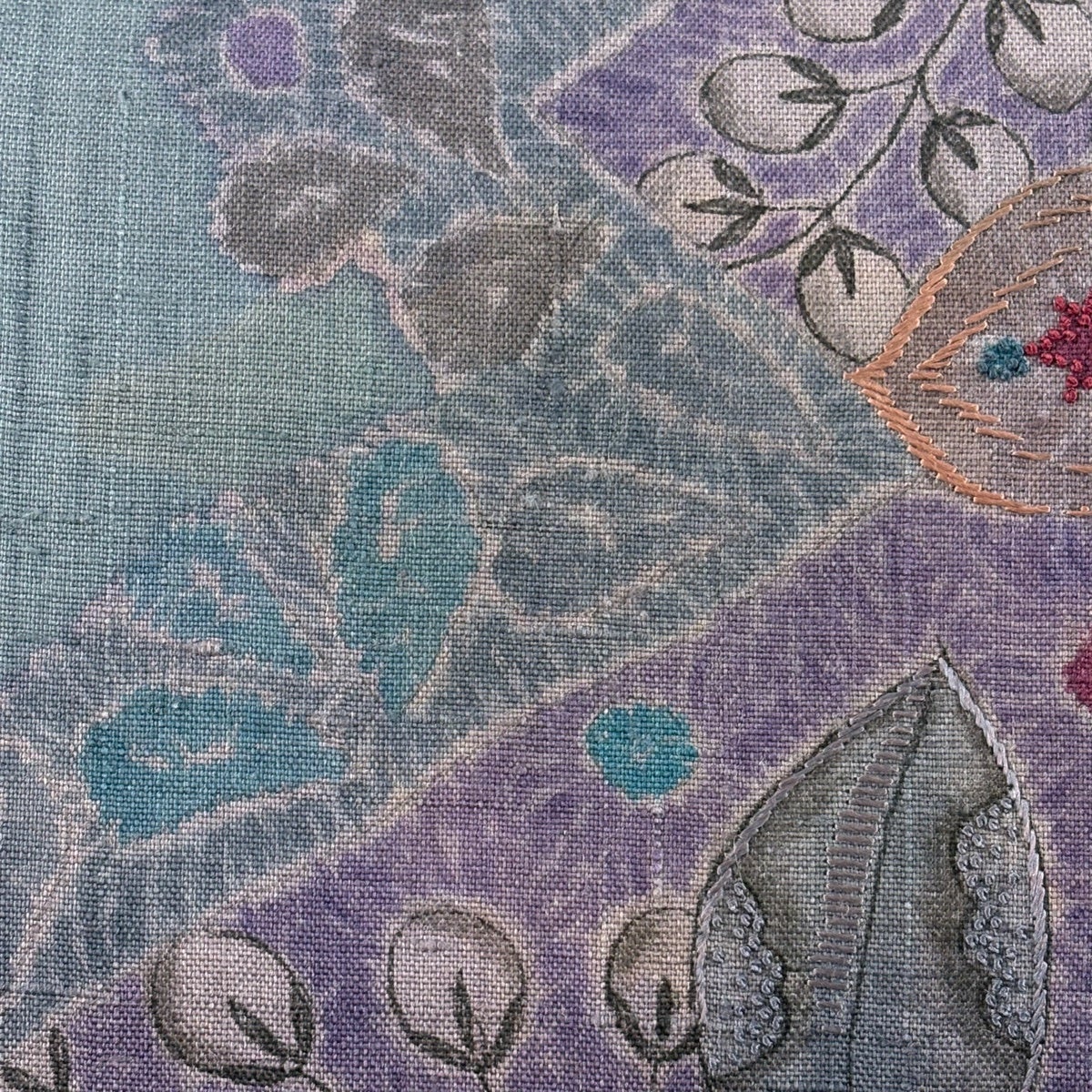 名古屋帯 秀品 紬地 蝶 草花 刺繍 青灰色 正絹