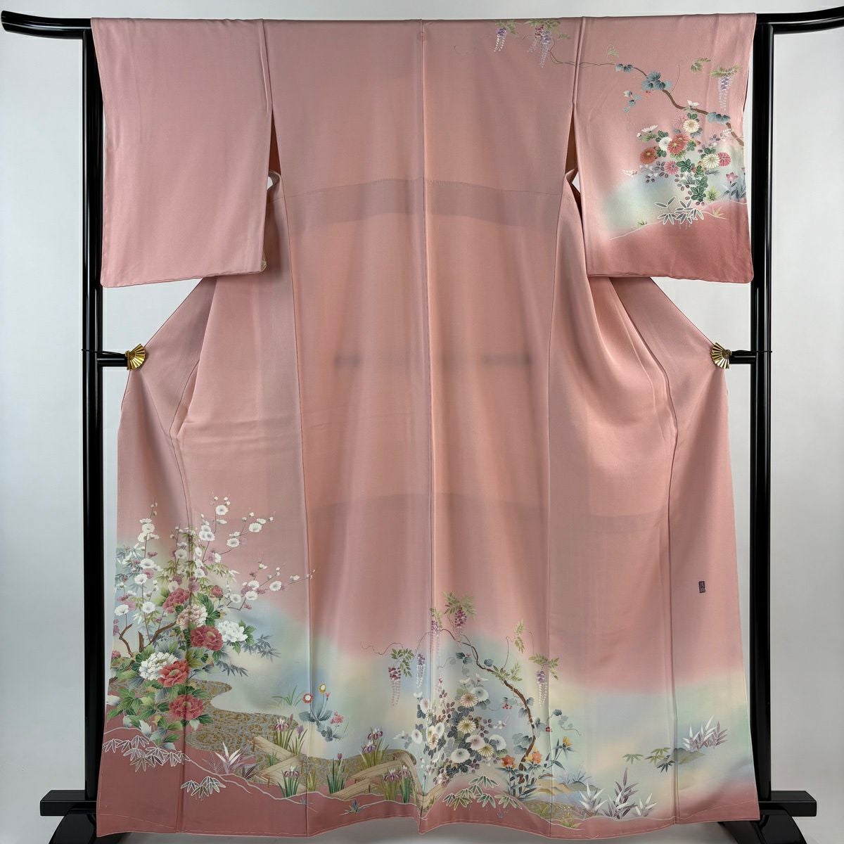 【美品】 訪問着 身丈163cm 裄丈64cm M 袷 落款あり 牡丹 観世水 金彩 ぼかし ピンク 正絹 秀品 一つ紋