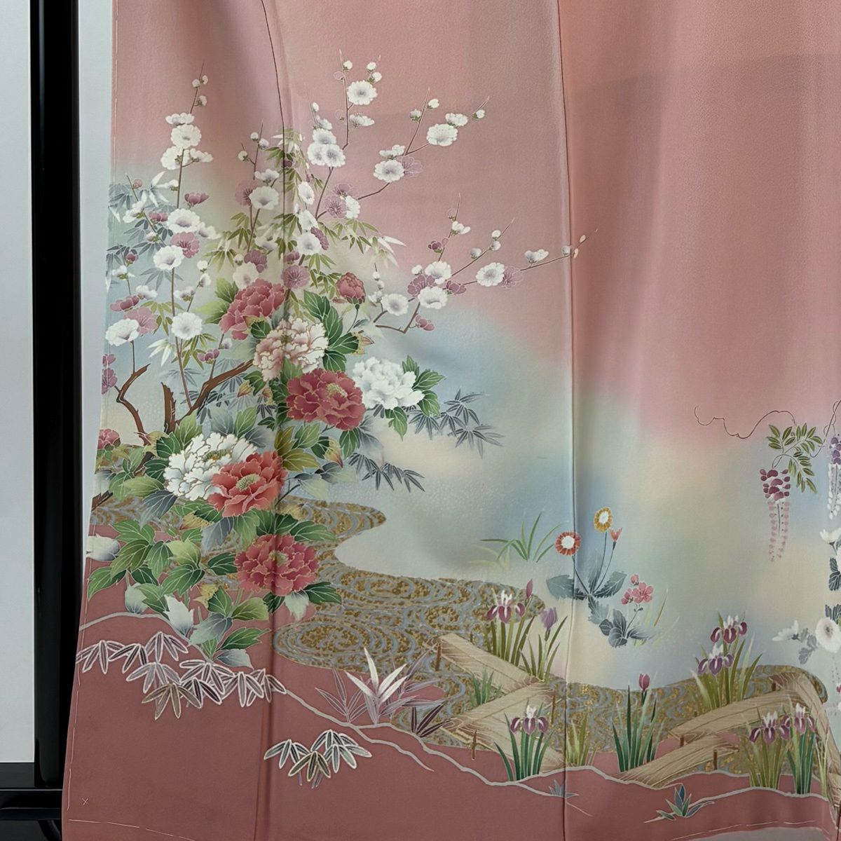 【美品】 訪問着 身丈156cm 裄丈66.5cm M 袷 やまと 落款あり 枝花 橋 ぼかし サーモンピンク 正絹 秀品