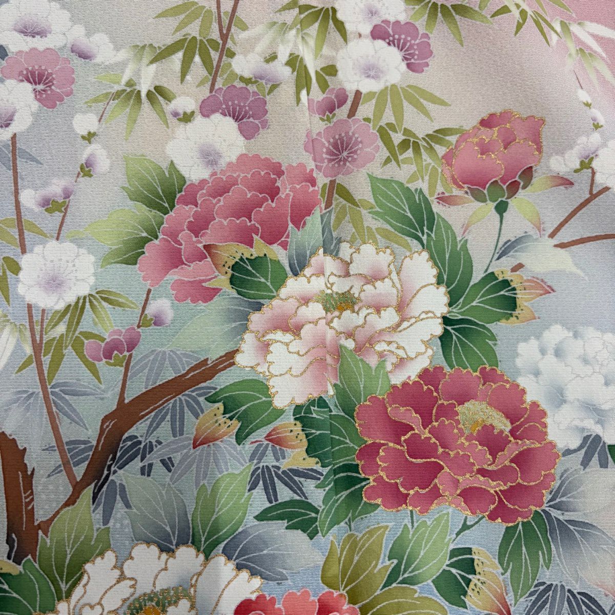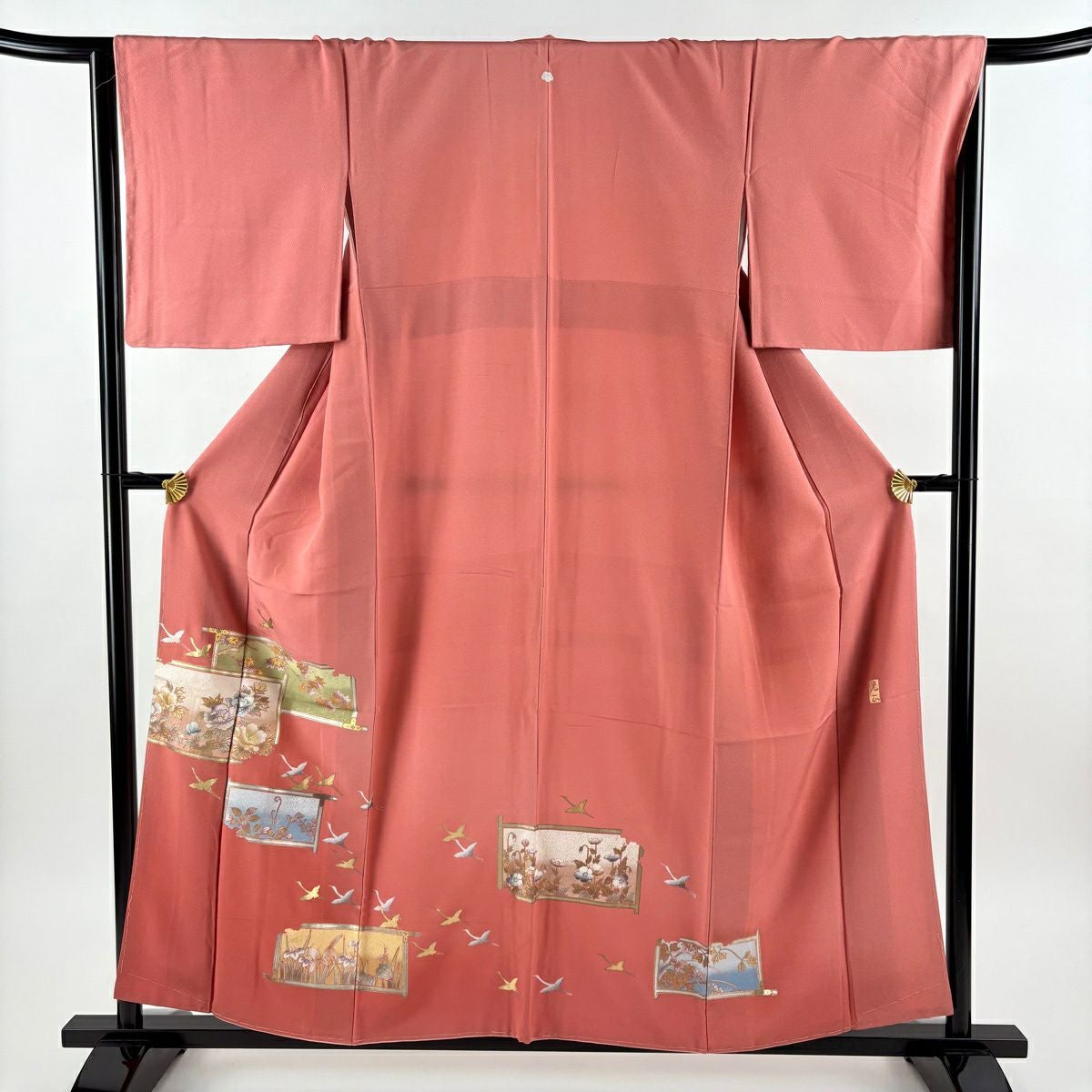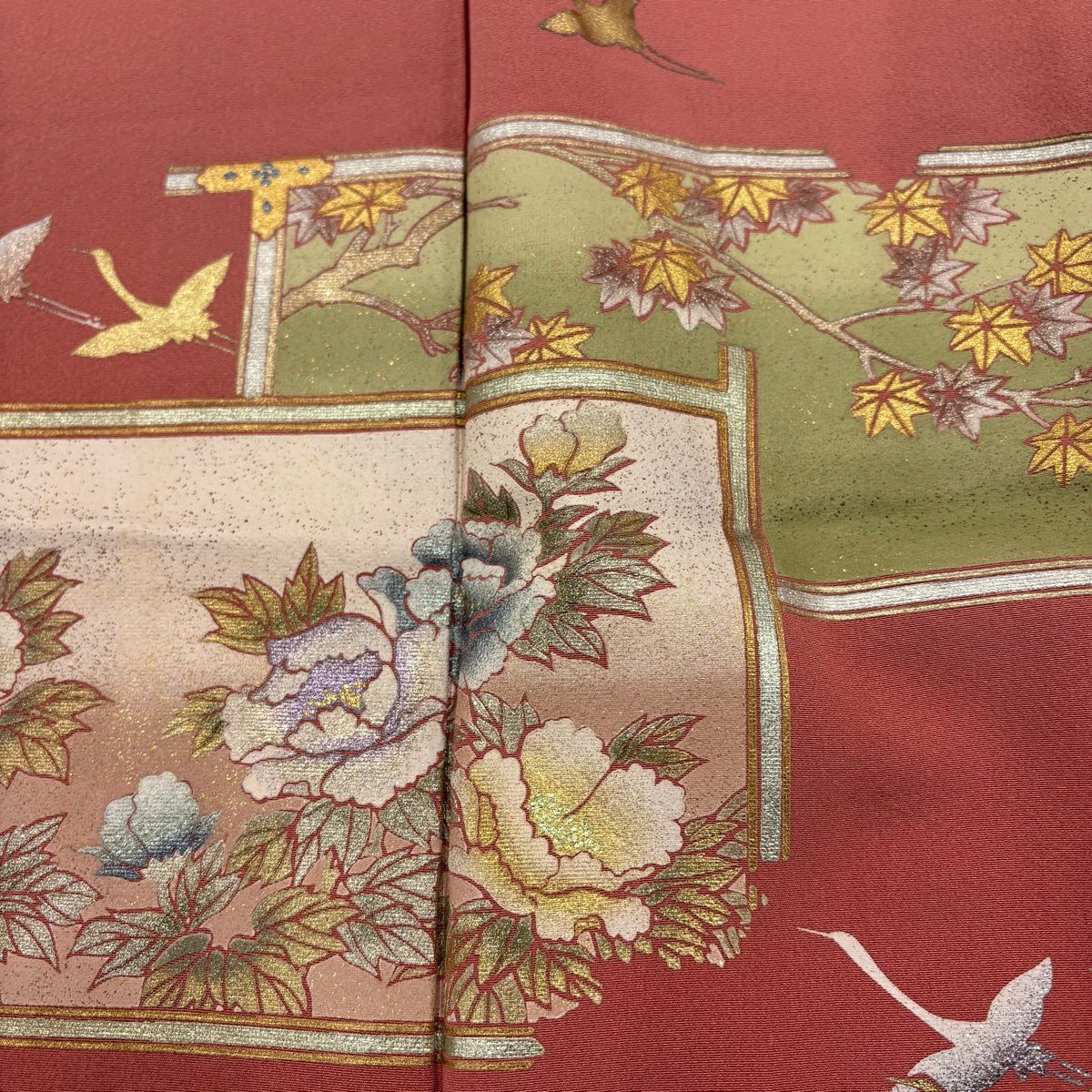 色留袖 身丈157cm 裄丈65.5cm M 袷 和田光正 落款あり 牡丹 鶴 金銀彩 ぼかし ピンク 正絹 秀品 一つ紋