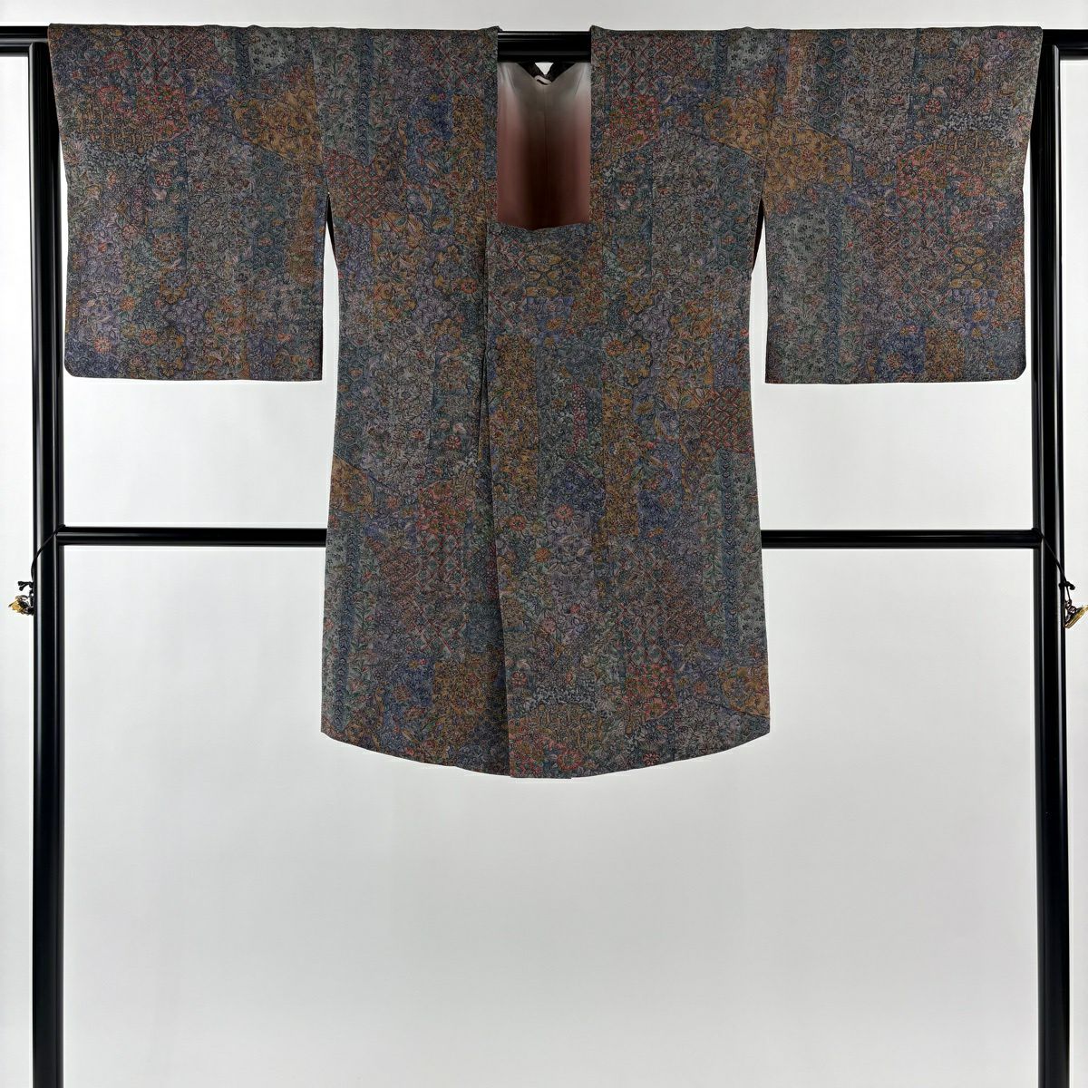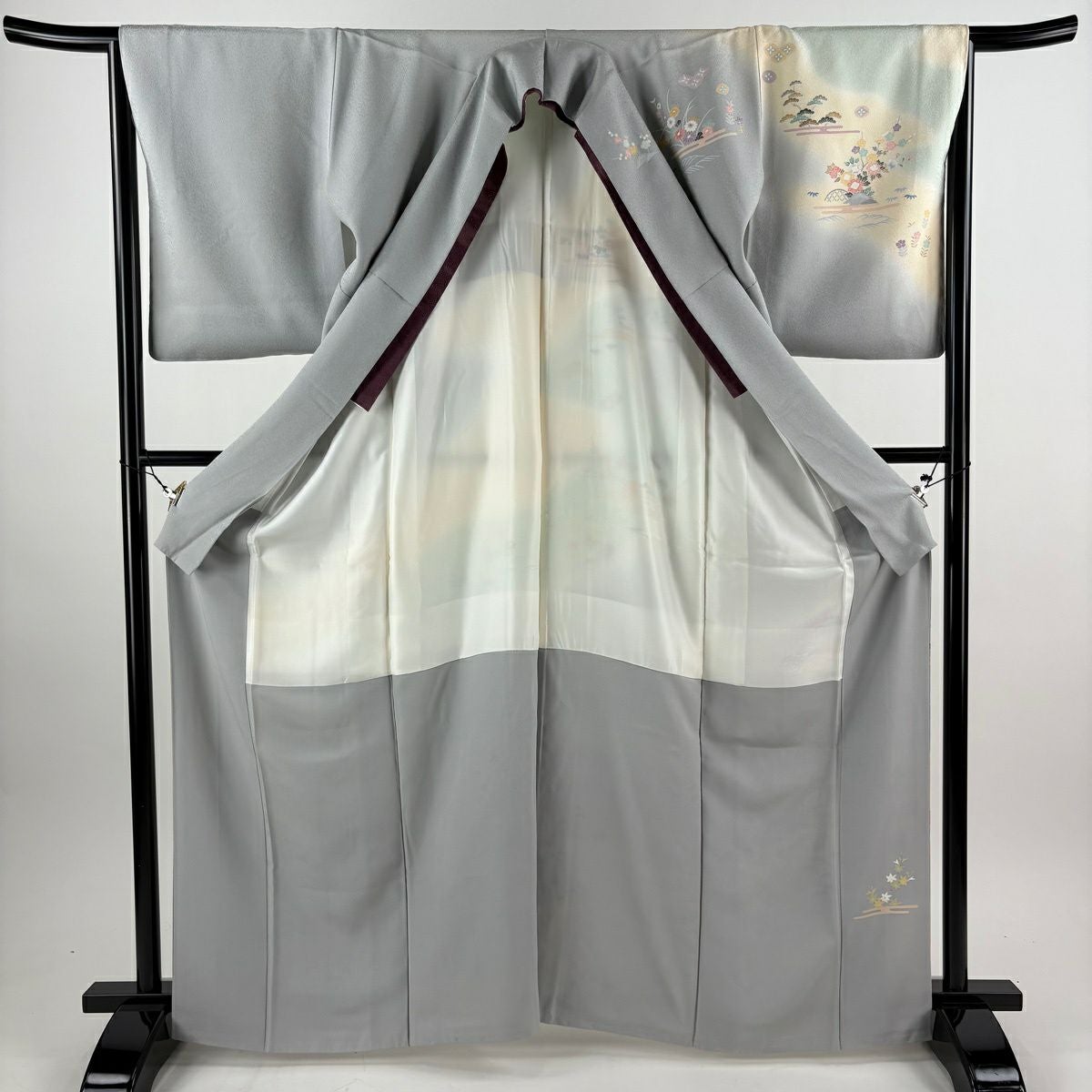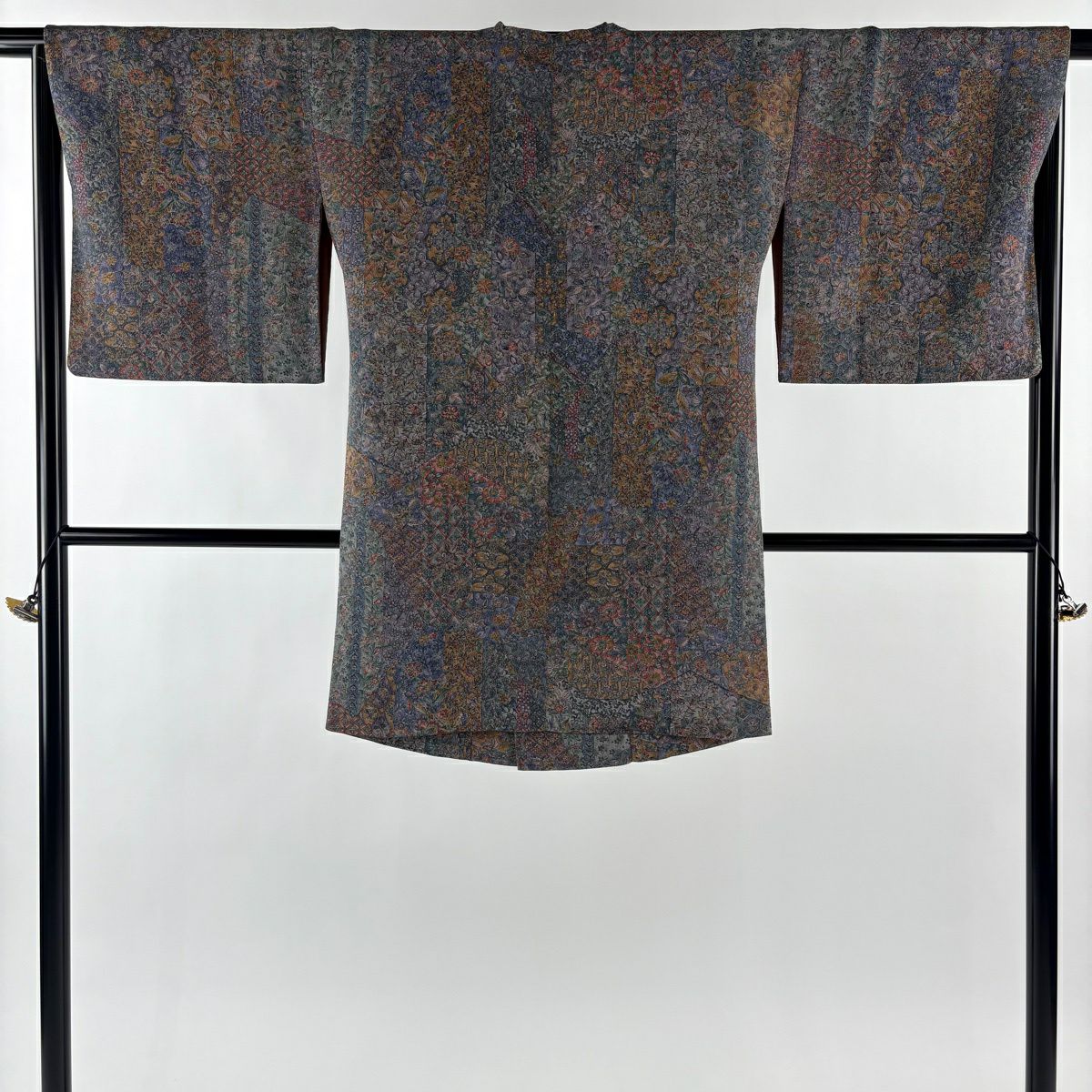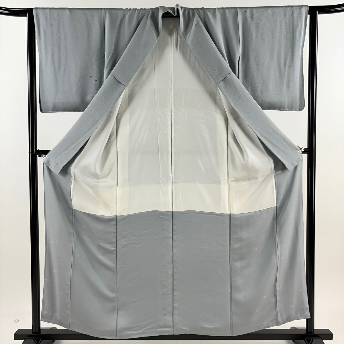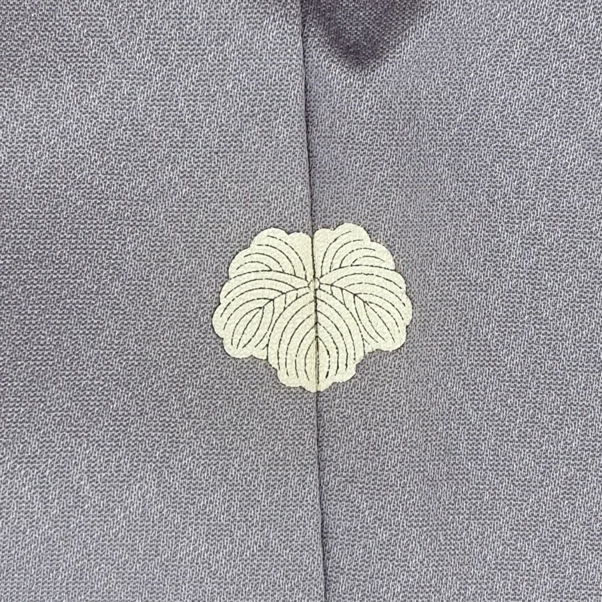 【在庫一掃】 小紋 身丈155.5cm 裄丈63cm S 袷 梶山伸 落款あり 梅 葉柄 金糸 青灰色 正絹 秀品 一つ紋