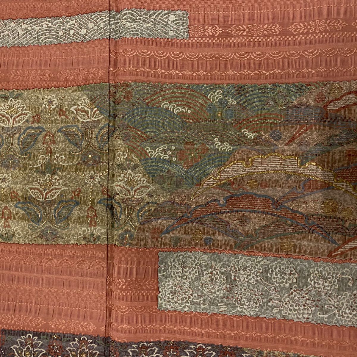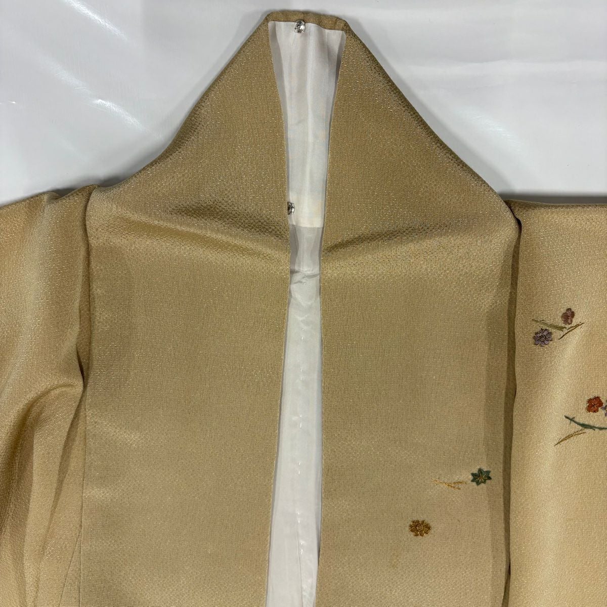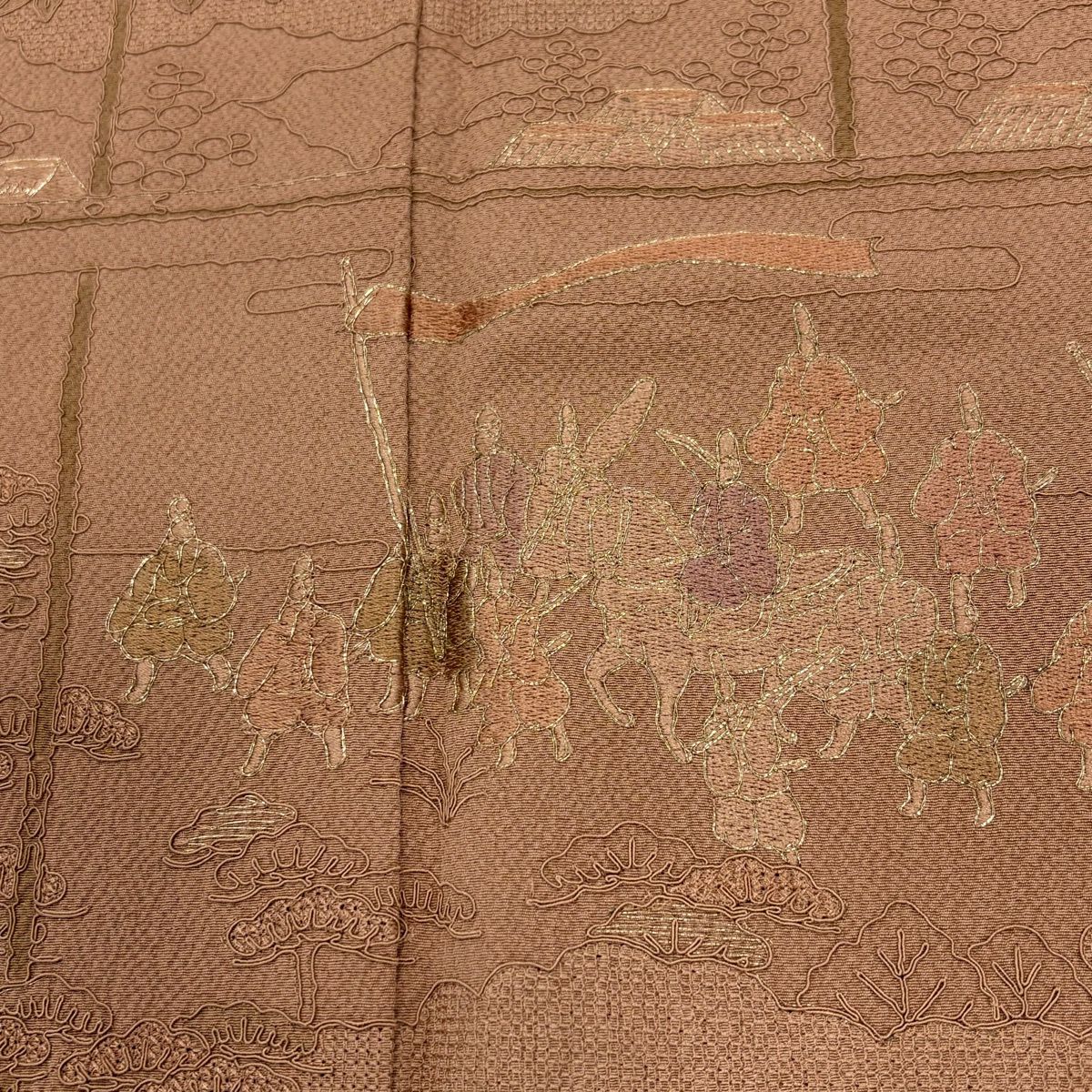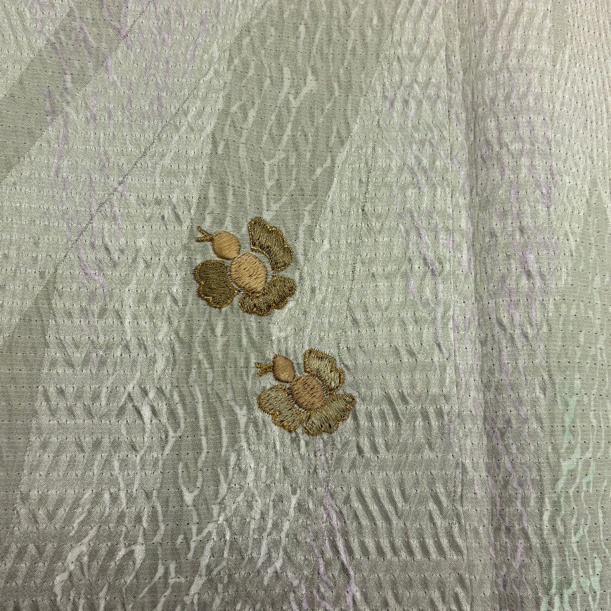 【在庫一掃】 付下げ 身丈164cm 裄丈64cm M 袷 紬地 花唐草 有職文様 刺繍 金糸 ピンクベージュ 正絹 秀品