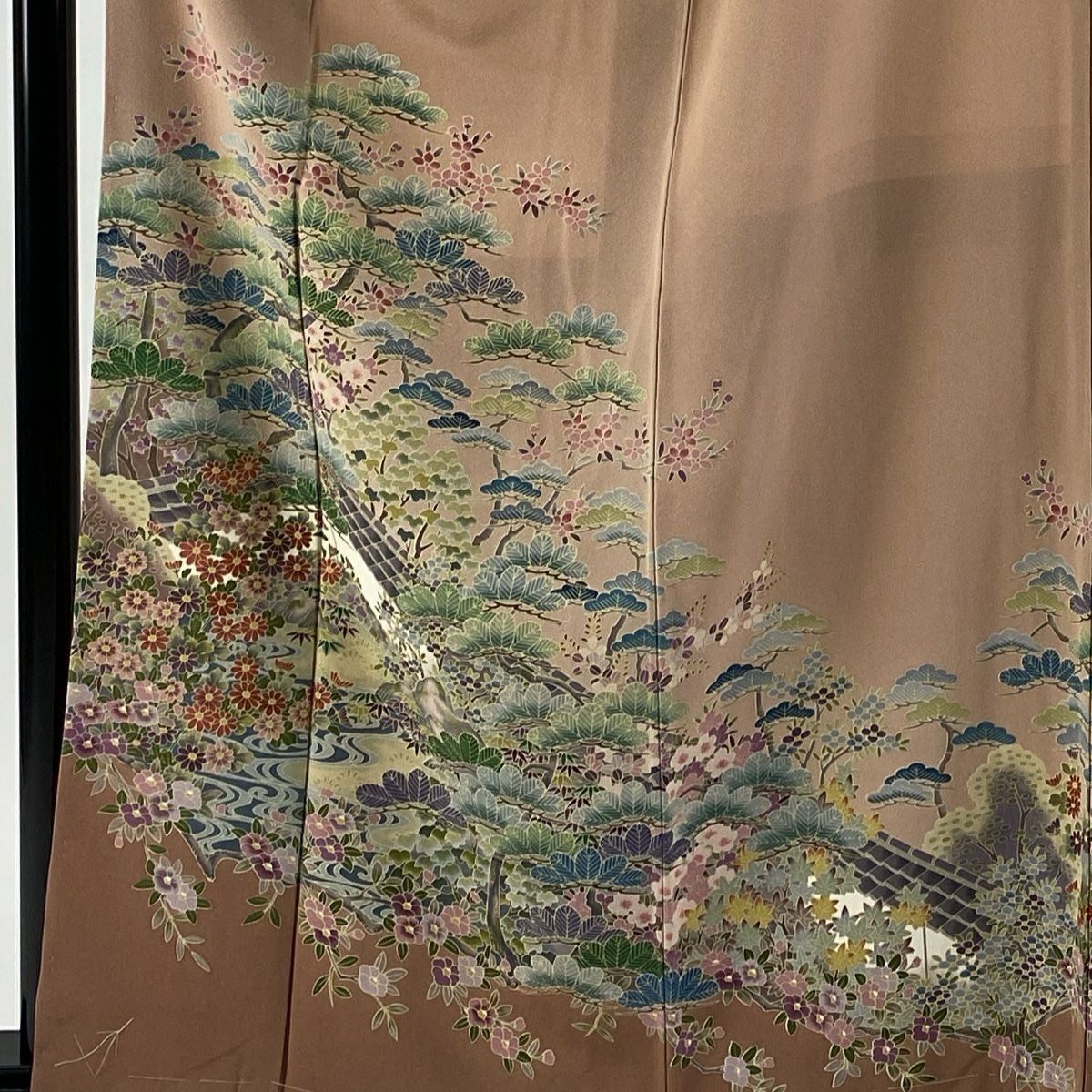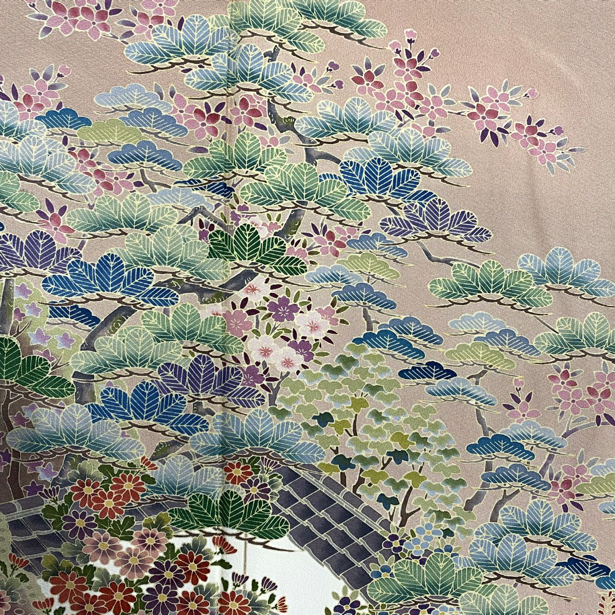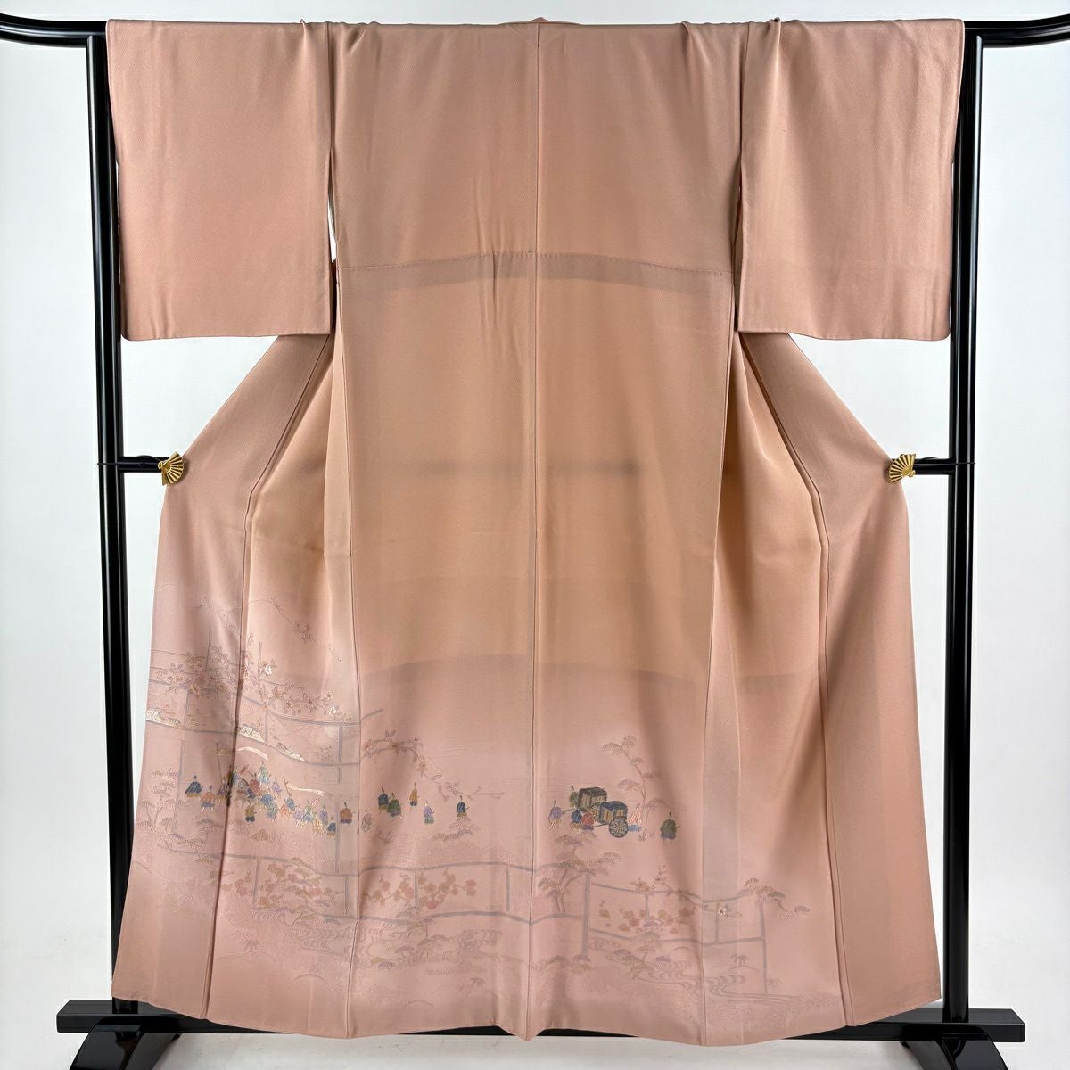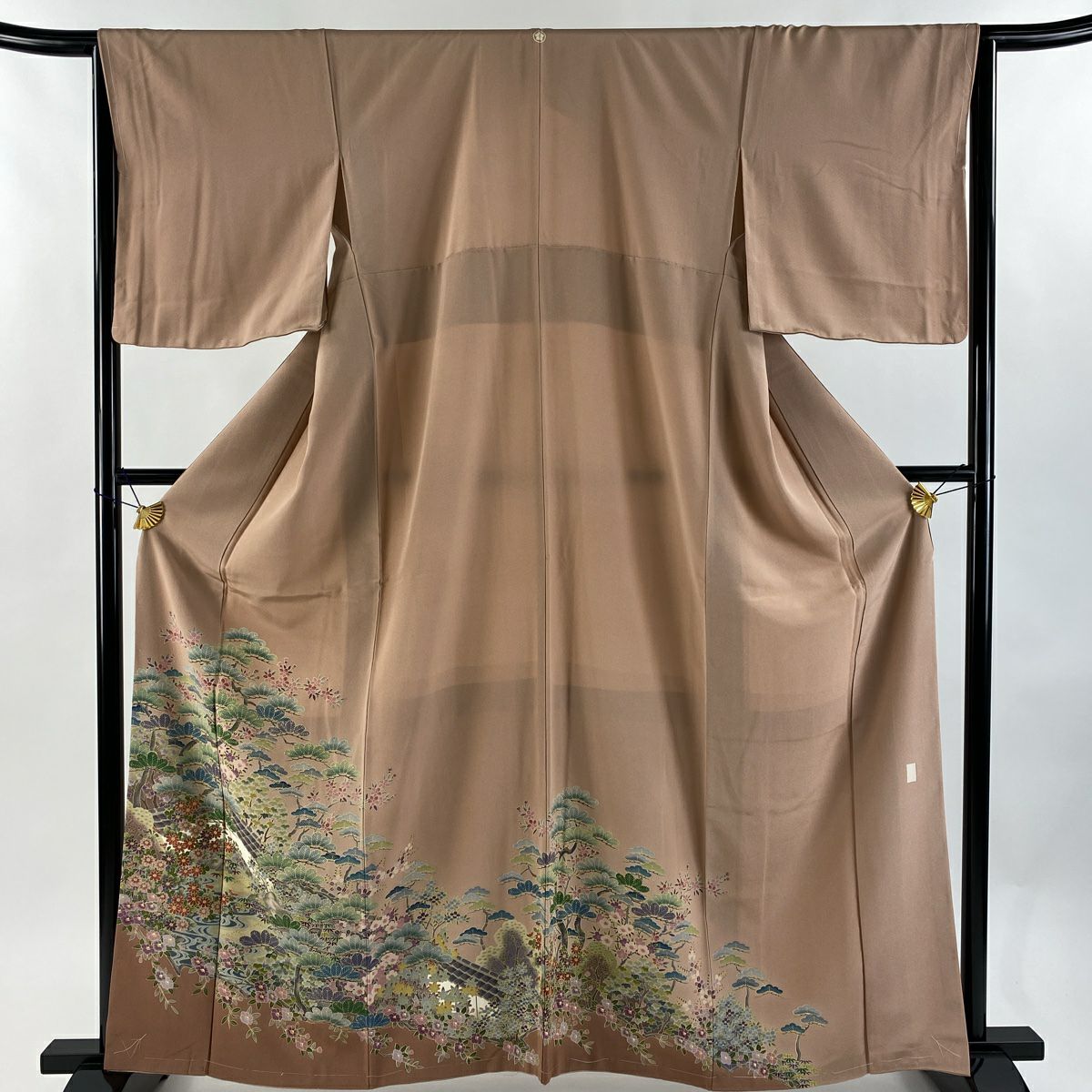 【在庫一掃】 訪問着 身丈157.5cm 裄丈64cm M 袷 落款あり 風景 松 ぼかし ピンクベージュ 正絹 秀品