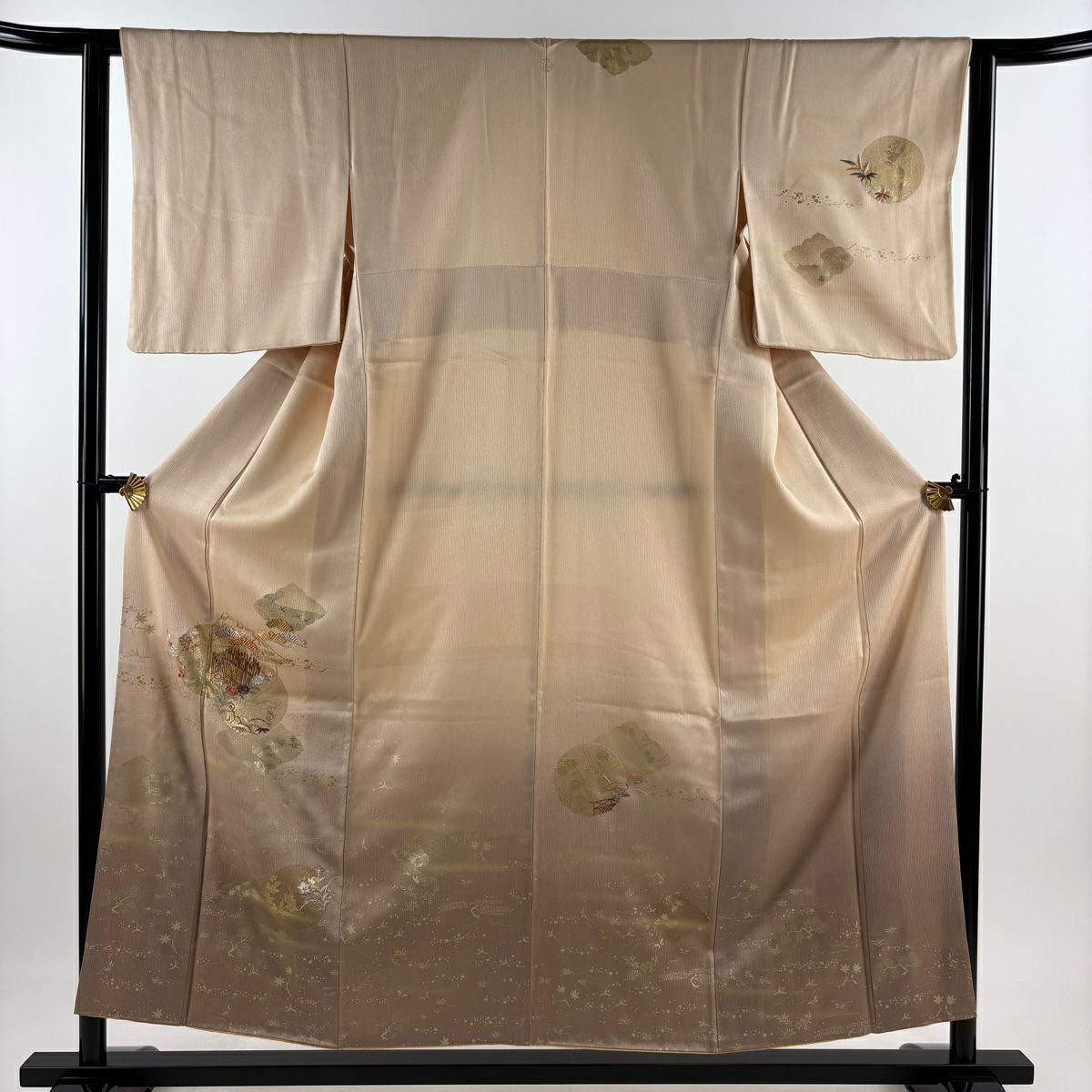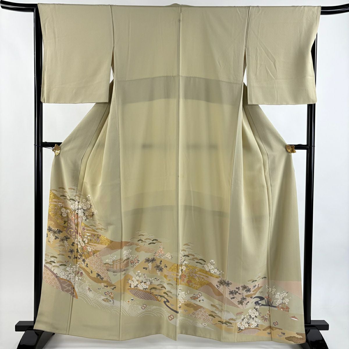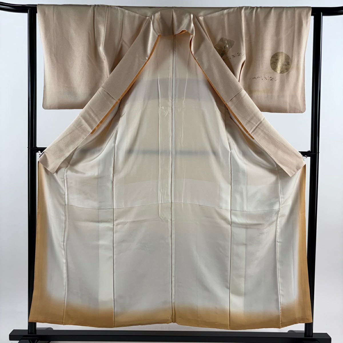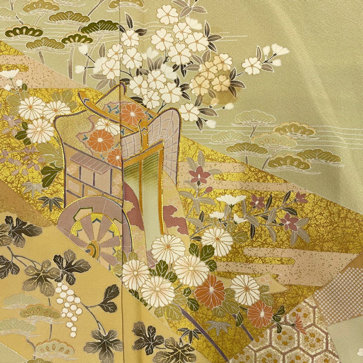 【在庫一掃】 色留袖 身丈162.5cm 裄丈66cm M 袷 御所車 松竹梅 金糸 金彩 ベージュ 正絹 秀品 一つ紋