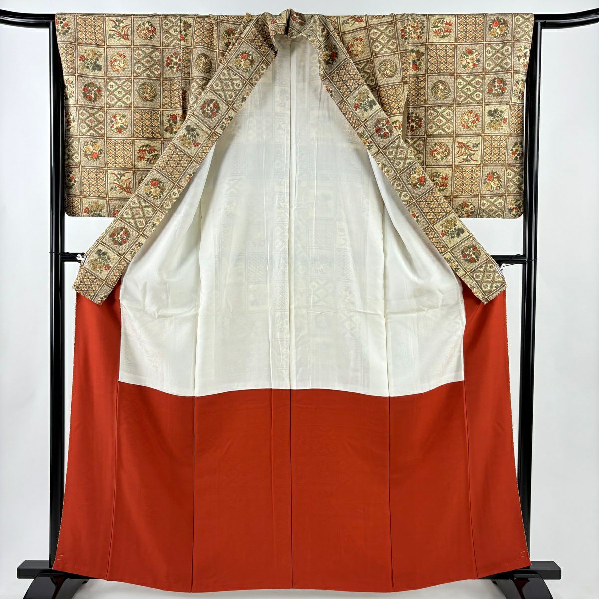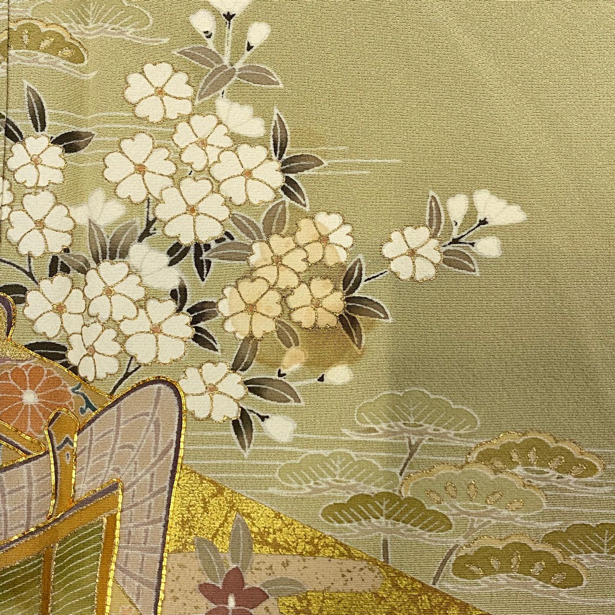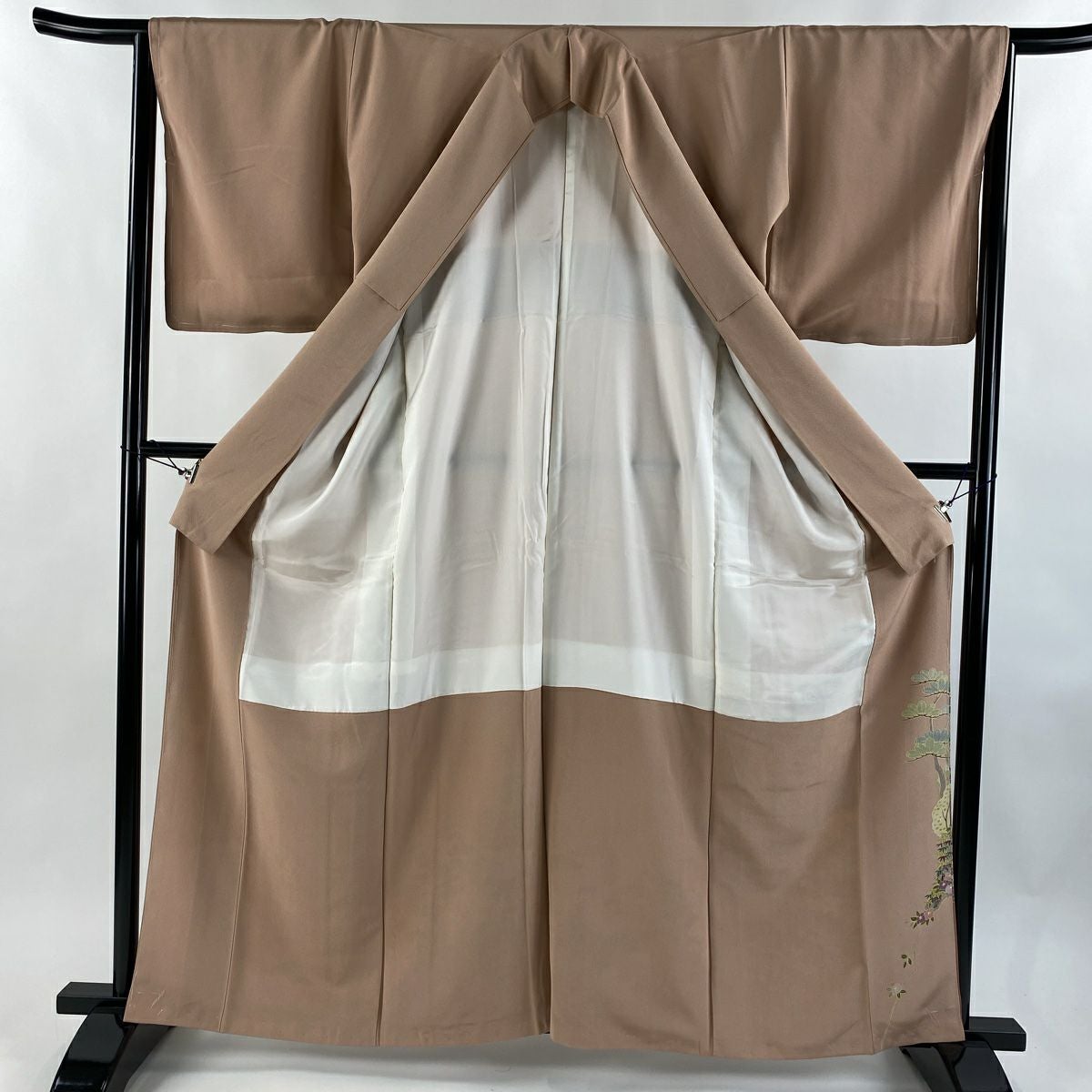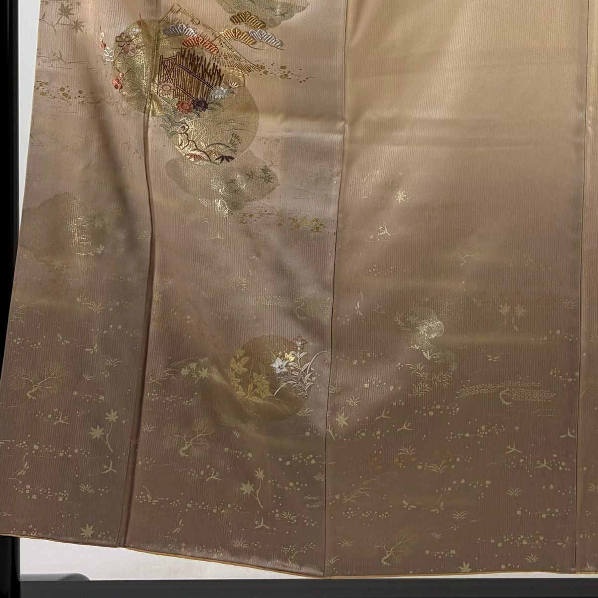 【在庫一掃】 色留袖 身丈162.5cm 裄丈66cm M 袷 御所車 松竹梅 金糸 金彩 ベージュ 正絹 秀品 一つ紋