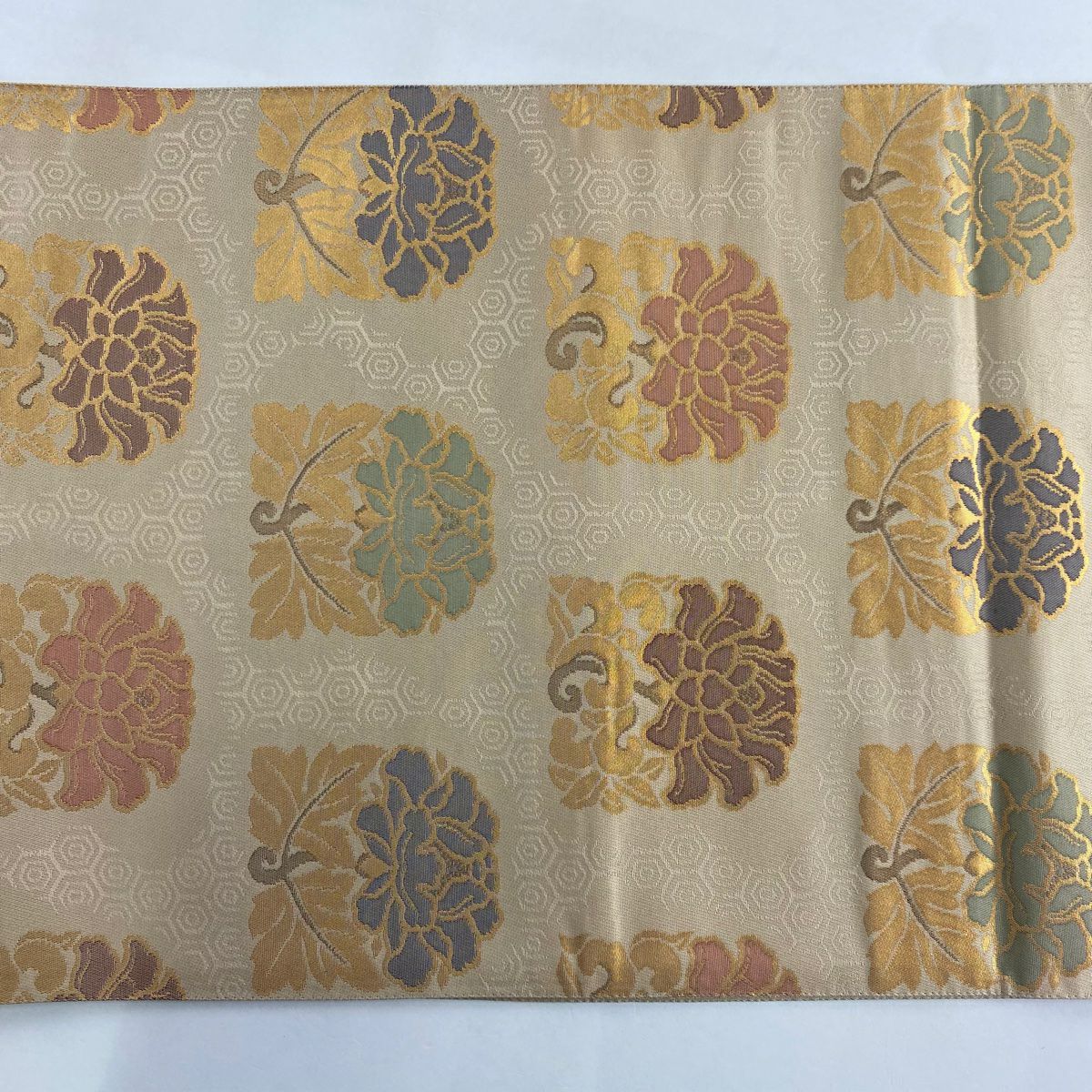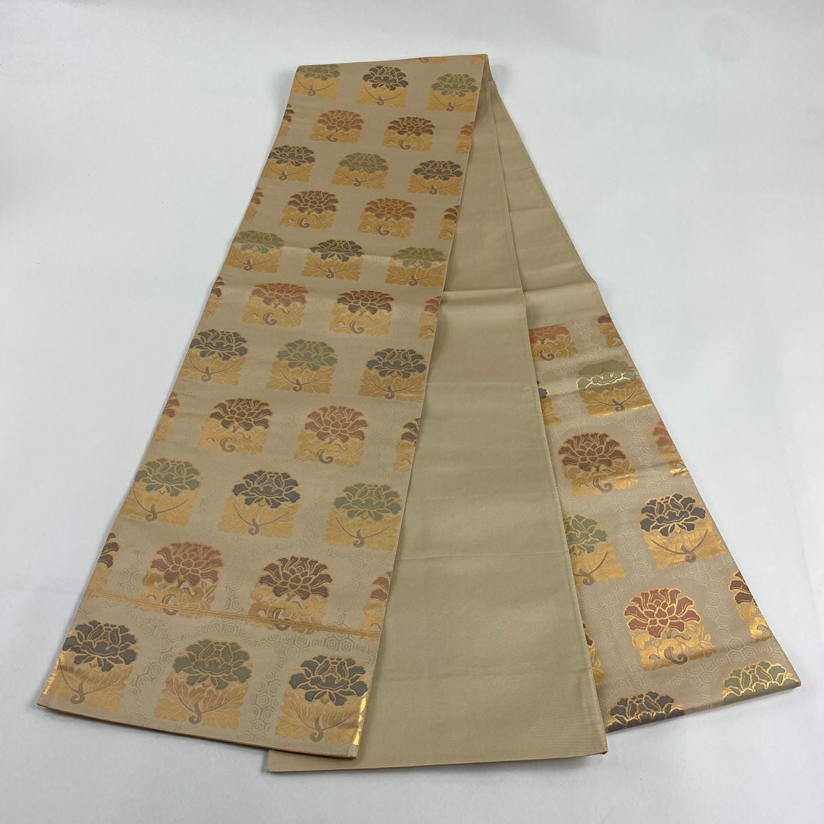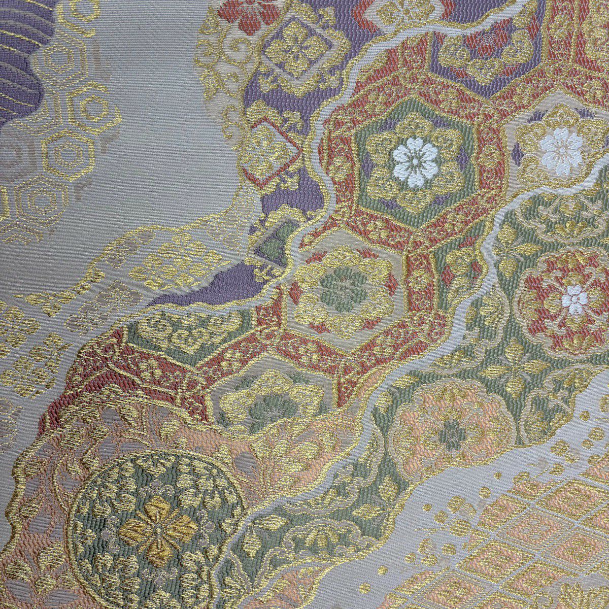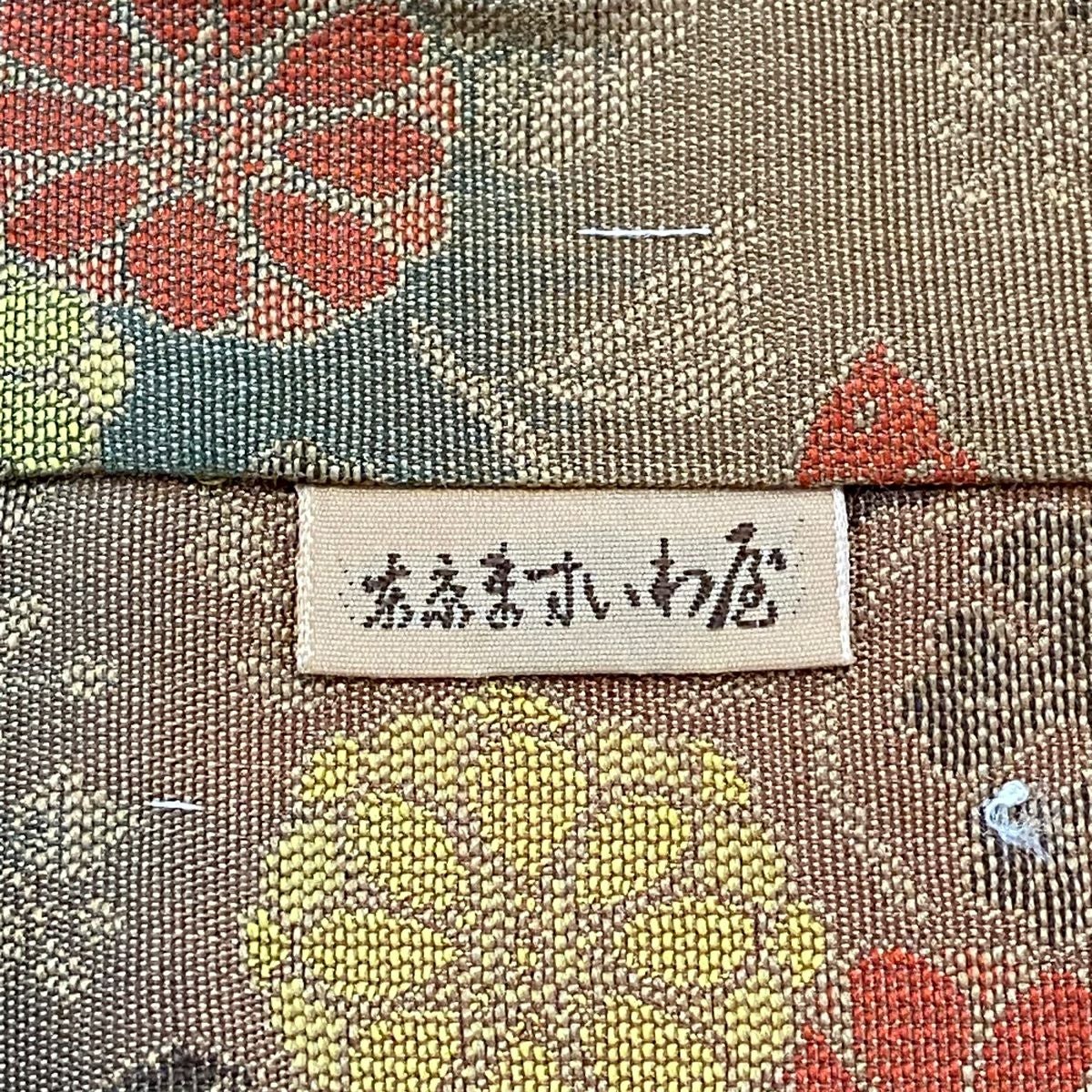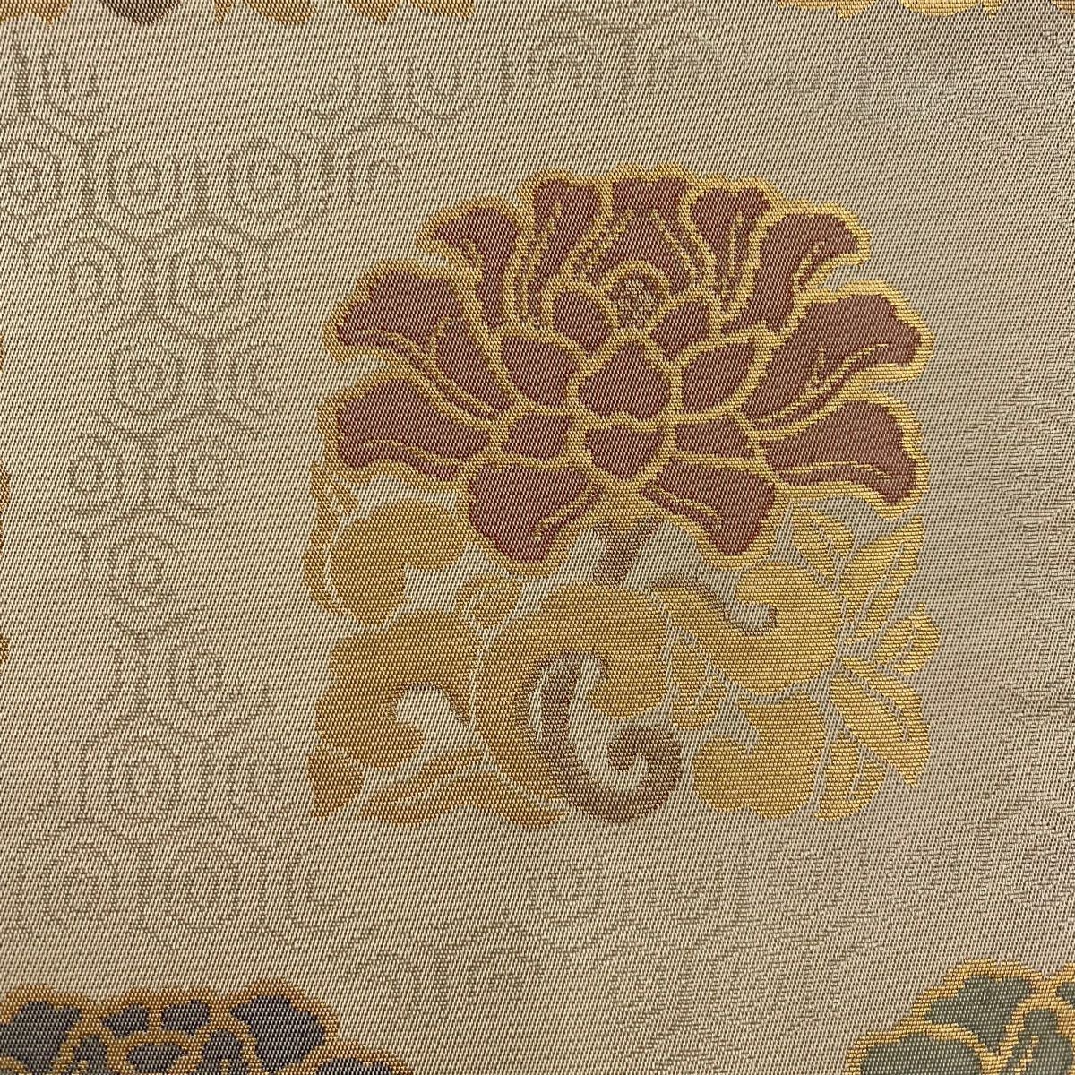 【在庫一掃】 【美品】 袋帯 秀品 落款あり 証紙あり 紋屋五左衛門 関西仕立て 草花 名物裂 箔 ベージュ 六通 正絹