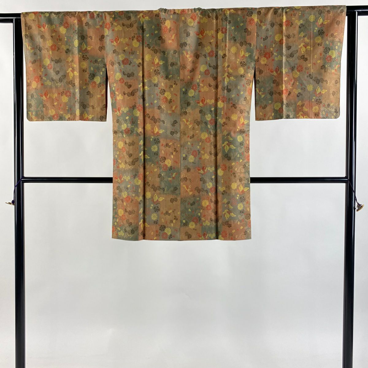 【在庫一掃】 【美品】 道行 身丈91cm 裄丈64cm M 和装コート 角衿 紬地 ますいわ屋 菊 蝶 薄茶色 正絹 秀品