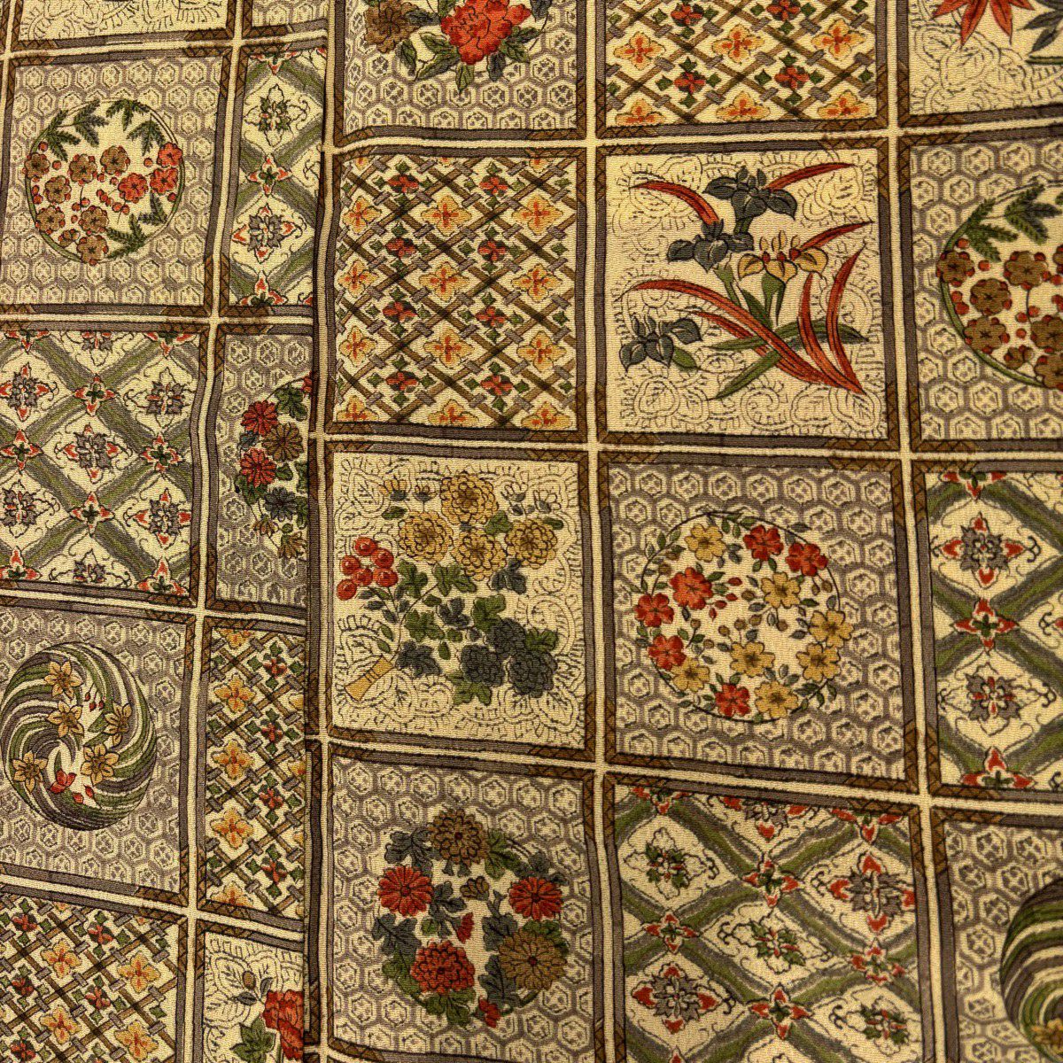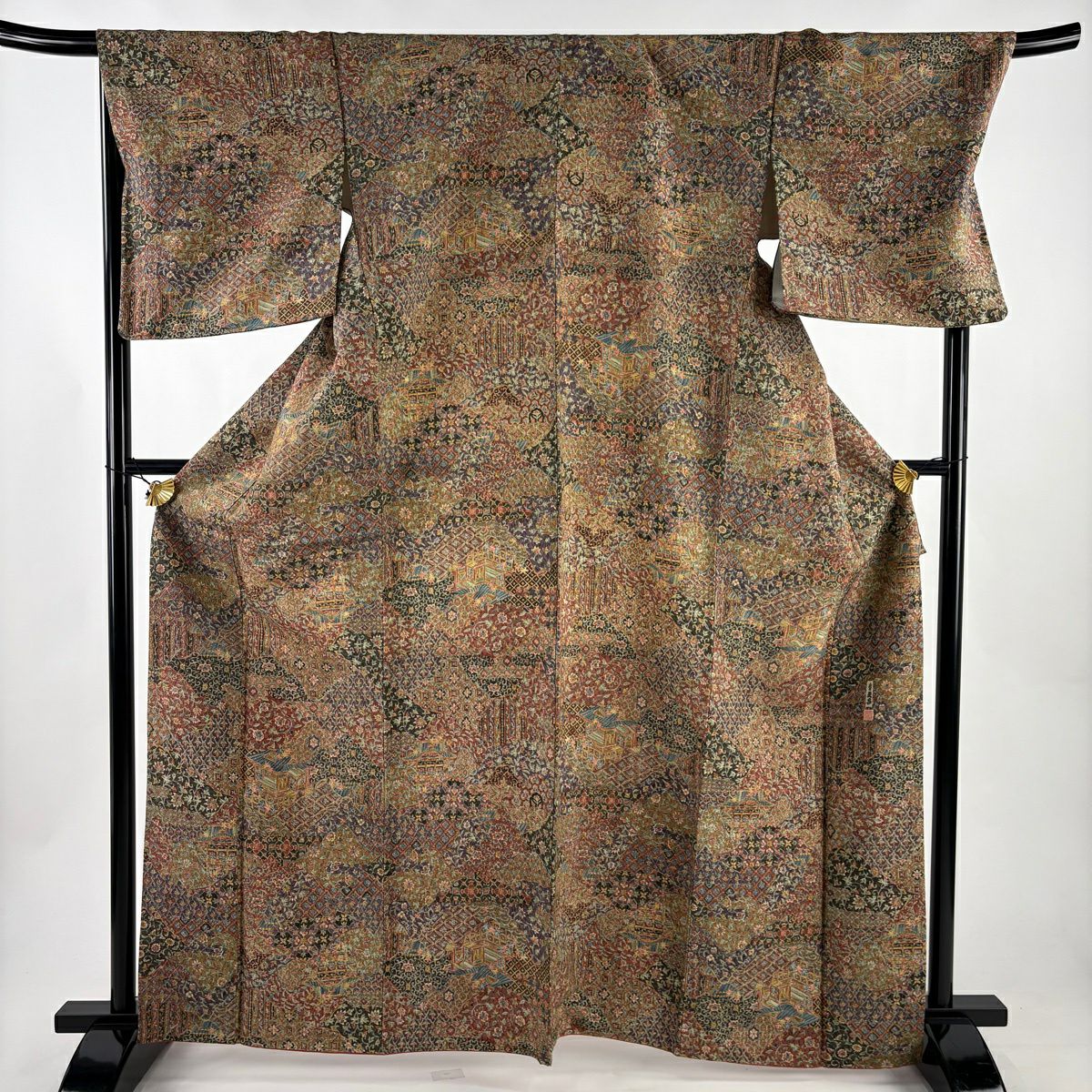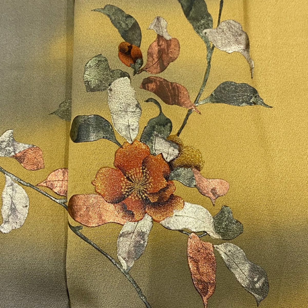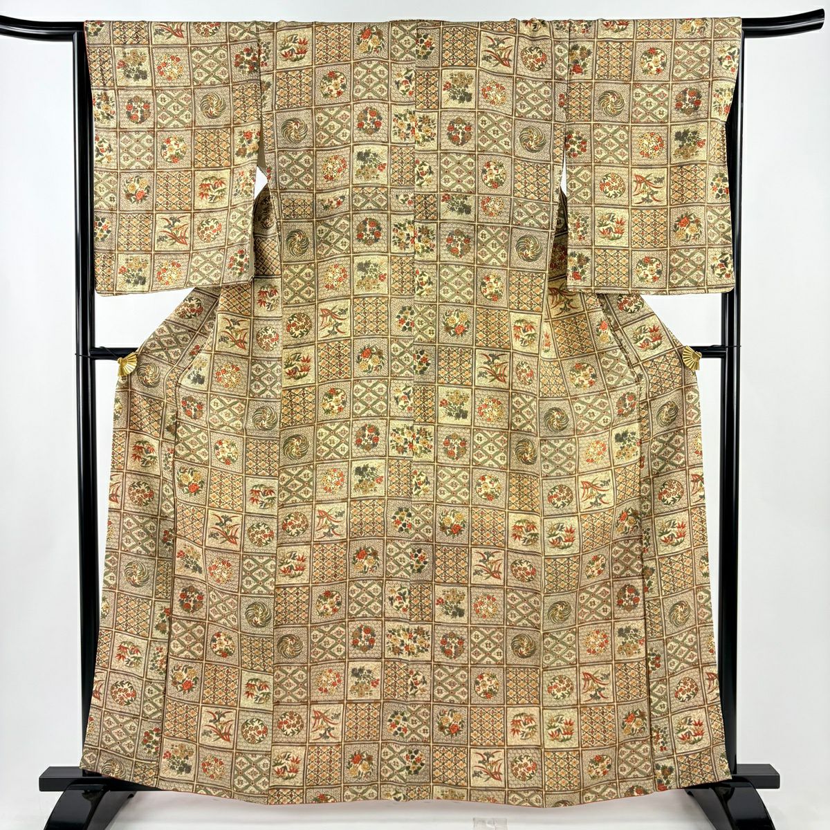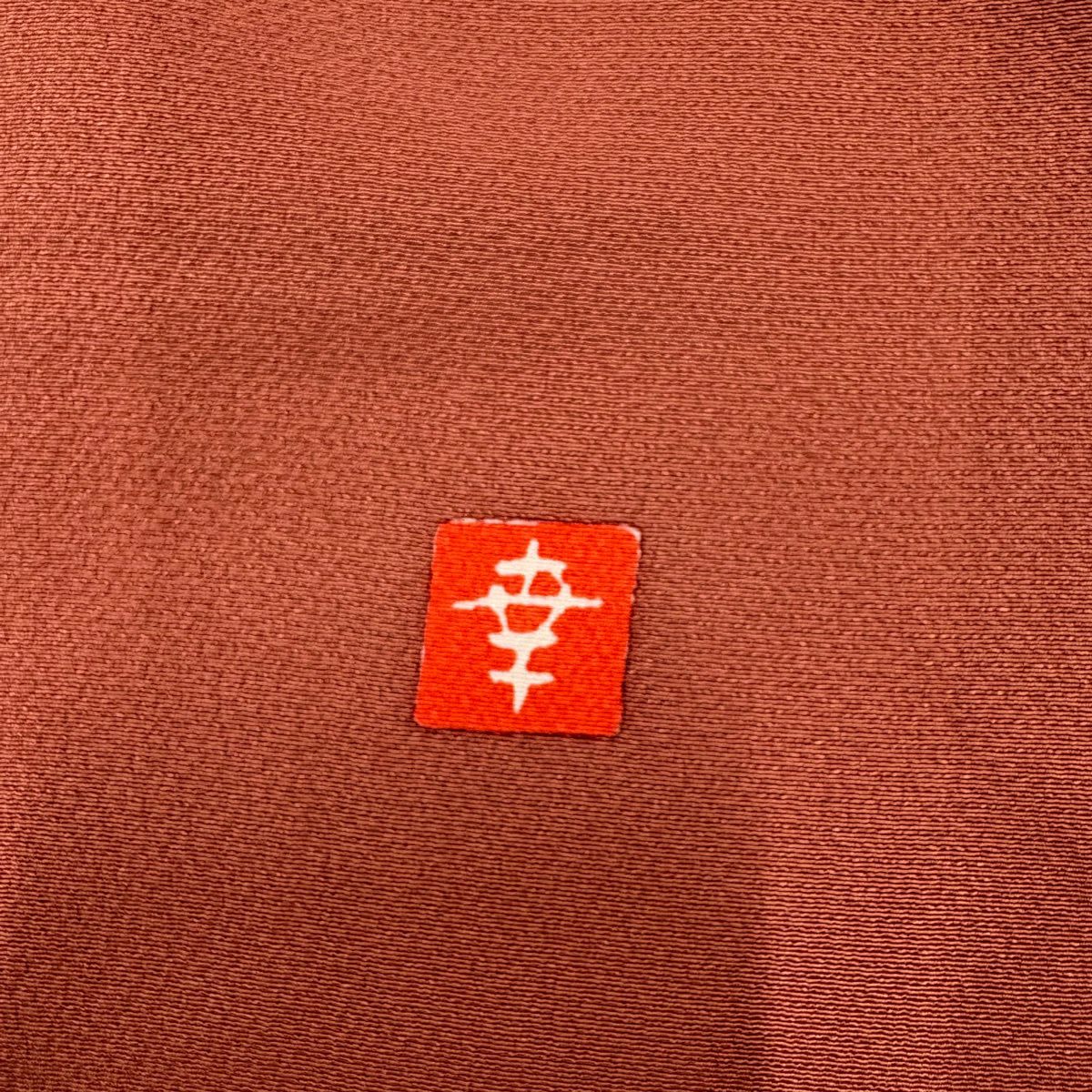 【在庫一掃】 【美品】 小紋 身丈157cm 裄丈61.5cm S 袷 落款あり 草花 有職文様 縮緬 山吹茶色 正絹 秀品