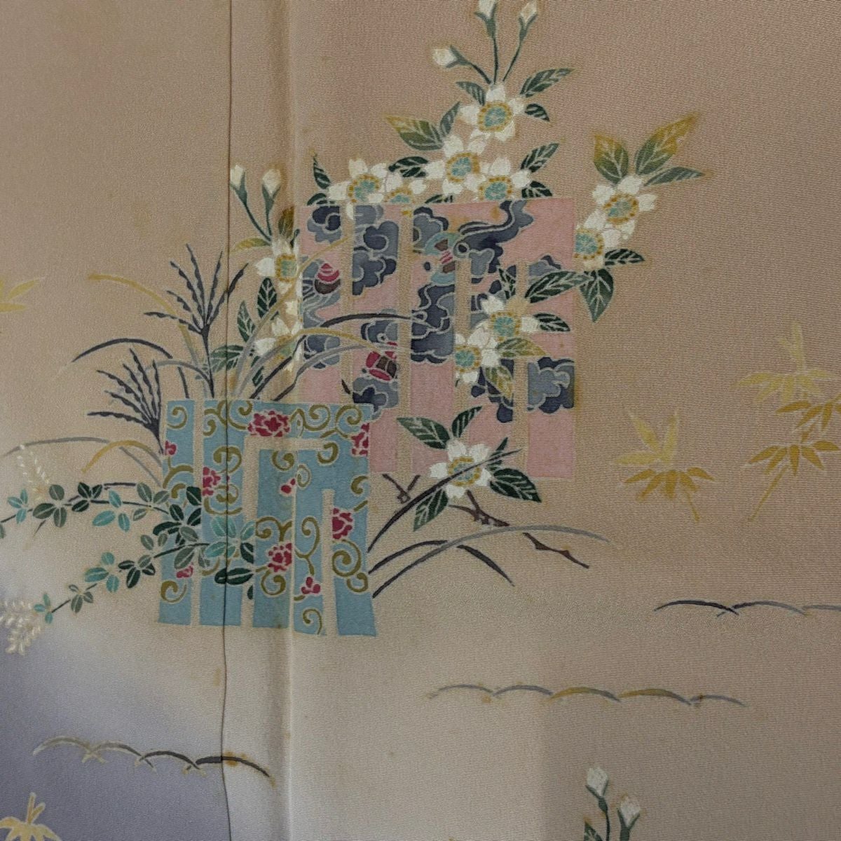 【在庫一掃】 【美品】 訪問着 身丈162cm 裄丈63.5cm S 袷 草花 雪芝 金彩 ピンクベージュ 正絹 秀品