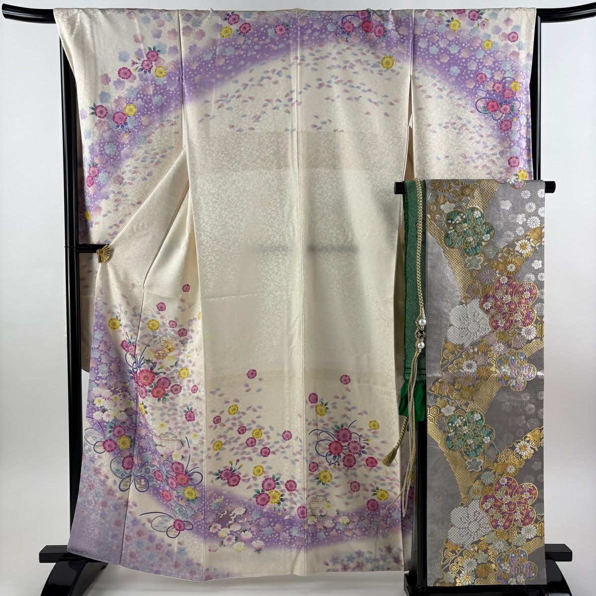 【在庫一掃】 【美品】 訪問着 身丈156.5cm 裄丈63cm S 袷 枝花 シルエット 金銀彩 ピンクベージュ 正絹 秀品
