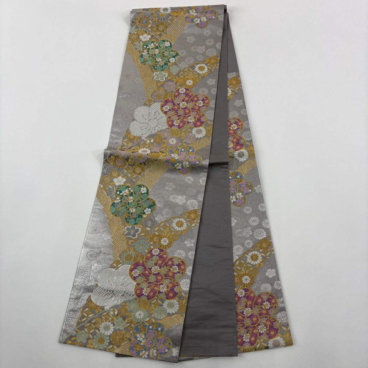 【在庫一掃】 付下げ 身丈154.5cm 裄丈63cm S 袷 松尾光琳 落款あり 扇 草花 刺繍 銀彩 灰色 正絹 秀品 一つ紋