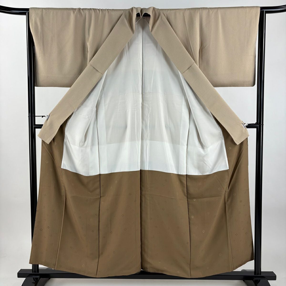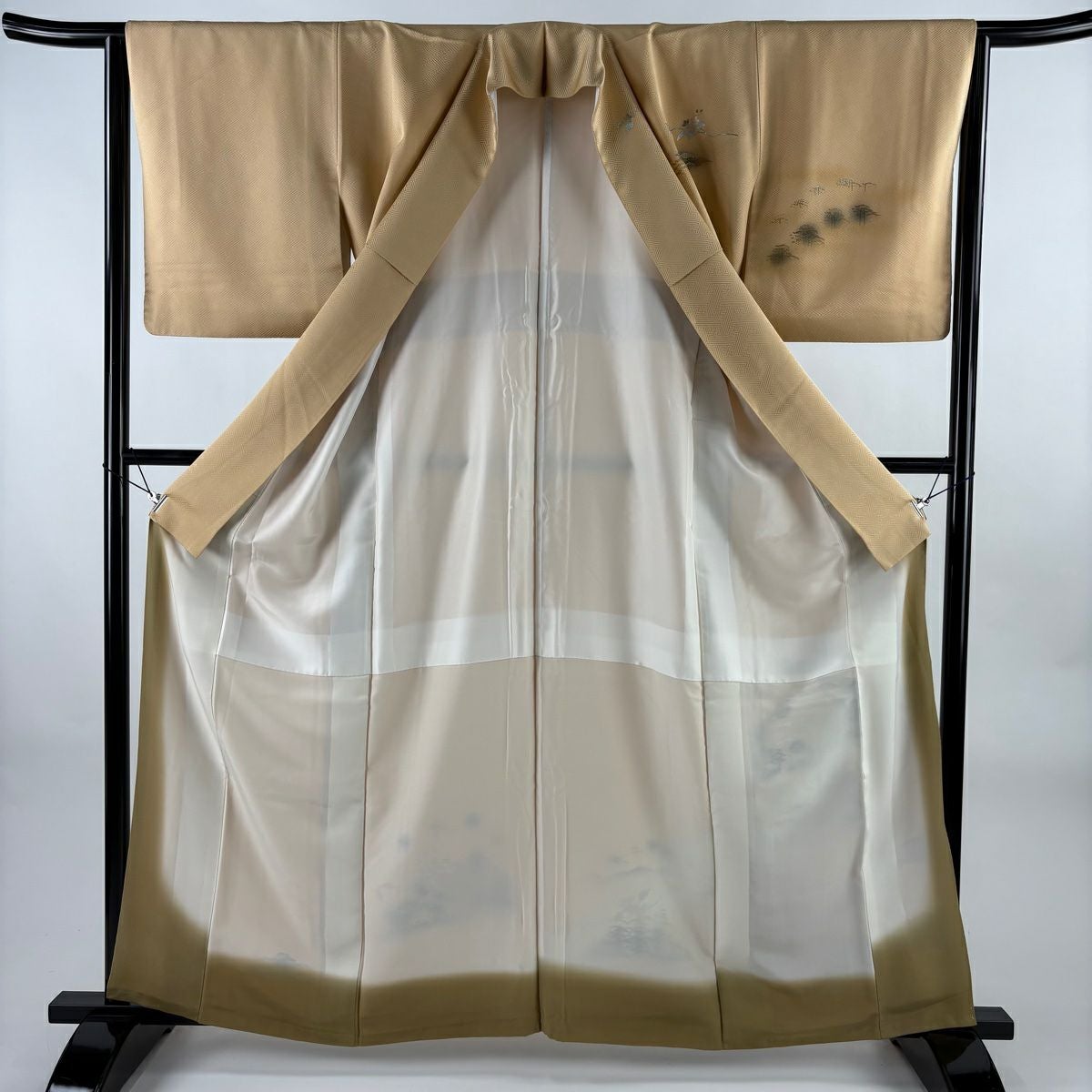 他の画像を見る 【最終値引き】 83%OFF 【美品】 道中着 身丈97cm 裄丈64cm M 和装コート 松竹梅 ヱ霞 染め分け ぼかし ベージュ 正絹 秀品 K70 当店通常価格 ¥ 11,800 ¥ 1,980 税込