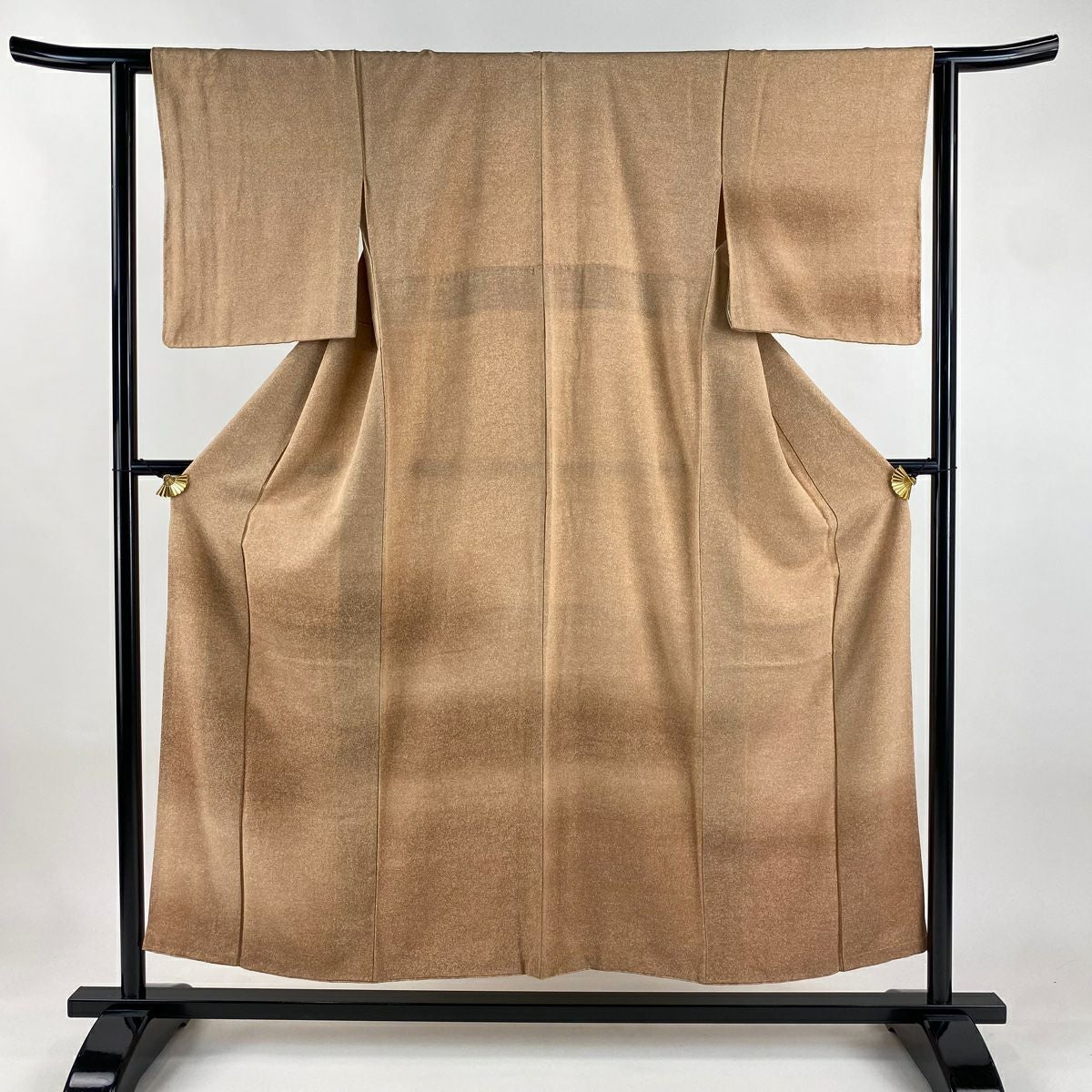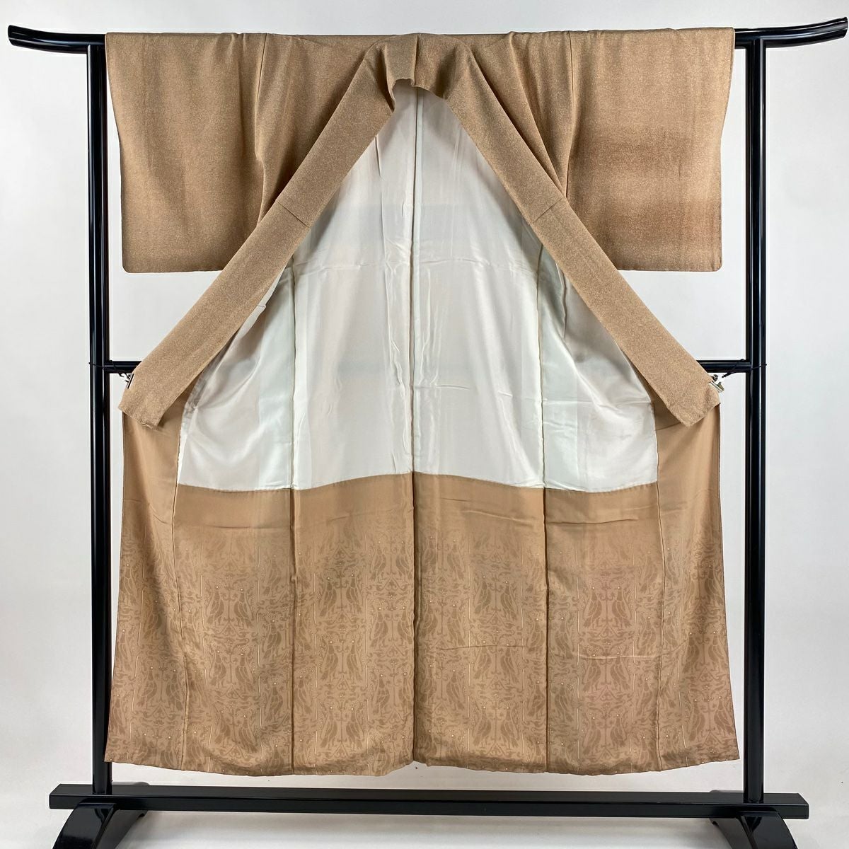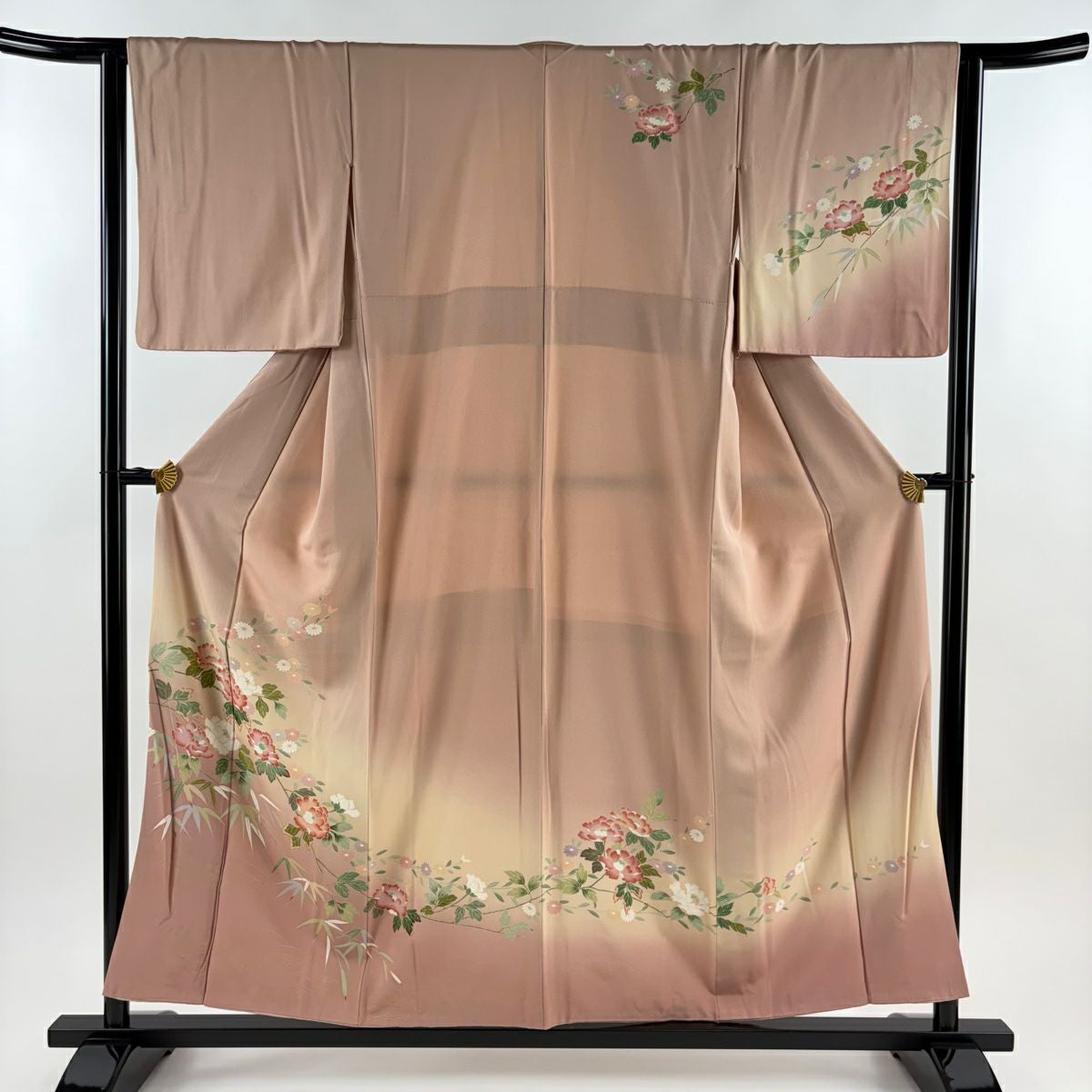 他の画像を見る 【最終値引き】 80%OFF 付下げ 身丈166cm 裄丈65.5cm M 袷 袋帯セット 草花 扇 金彩 ぼかし 薄茶色 正絹 秀品 三つ紋 K70 当店通常価格 ¥ 20,800 ¥ 3,960 税込