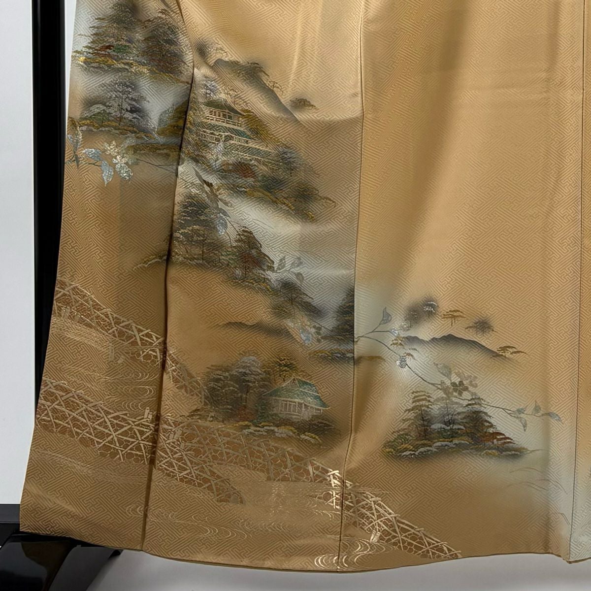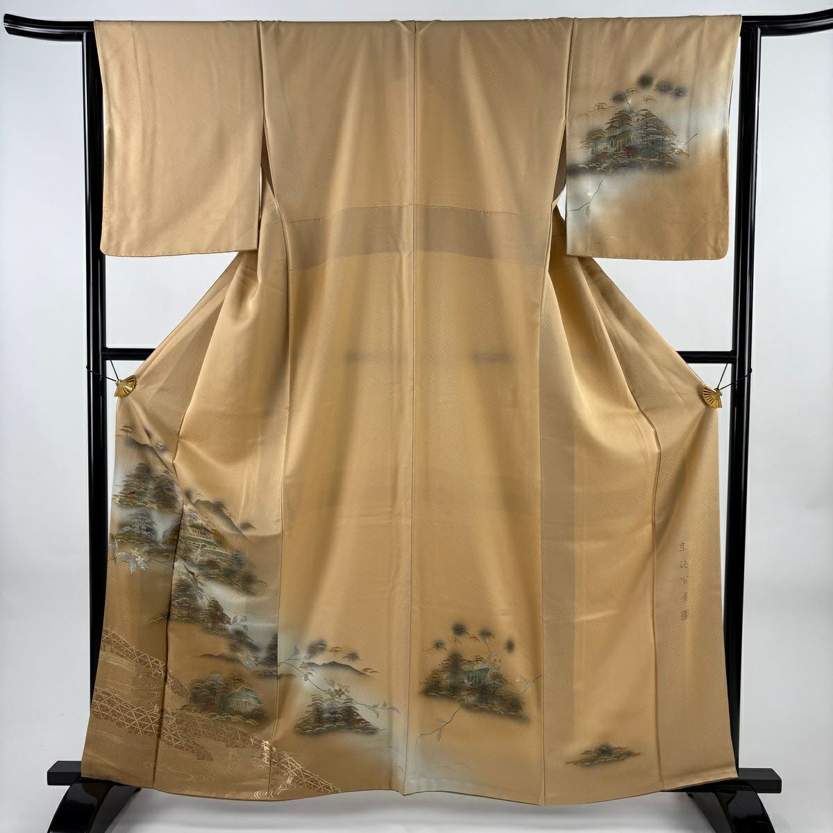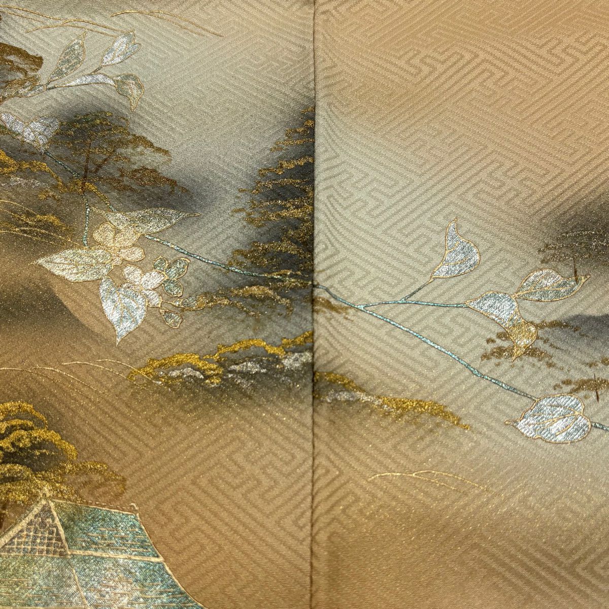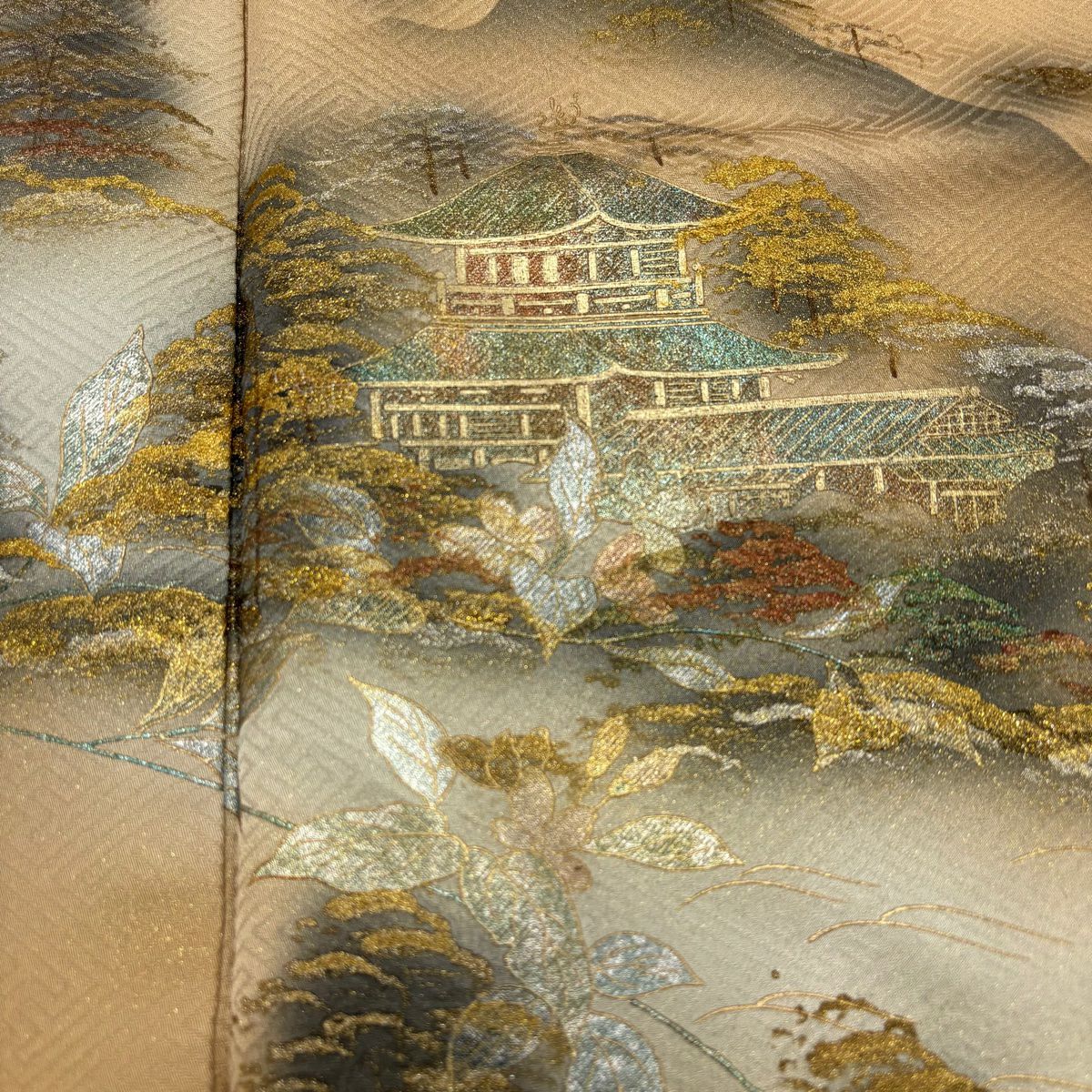 他の画像を見る 【最終値引き】 83%OFF 【美品】 訪問着 身丈155cm 裄丈63.5cm S 単衣 松梅 家屋 金彩 ぼかし ベージュ 正絹 秀品 一つ紋 K70 当店通常価格 ¥ 11,800 ¥ 1,980 税込