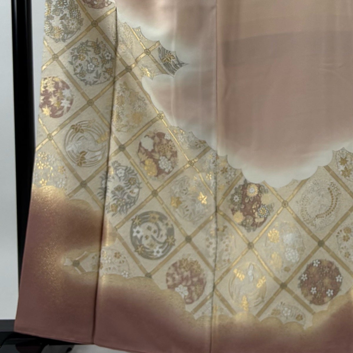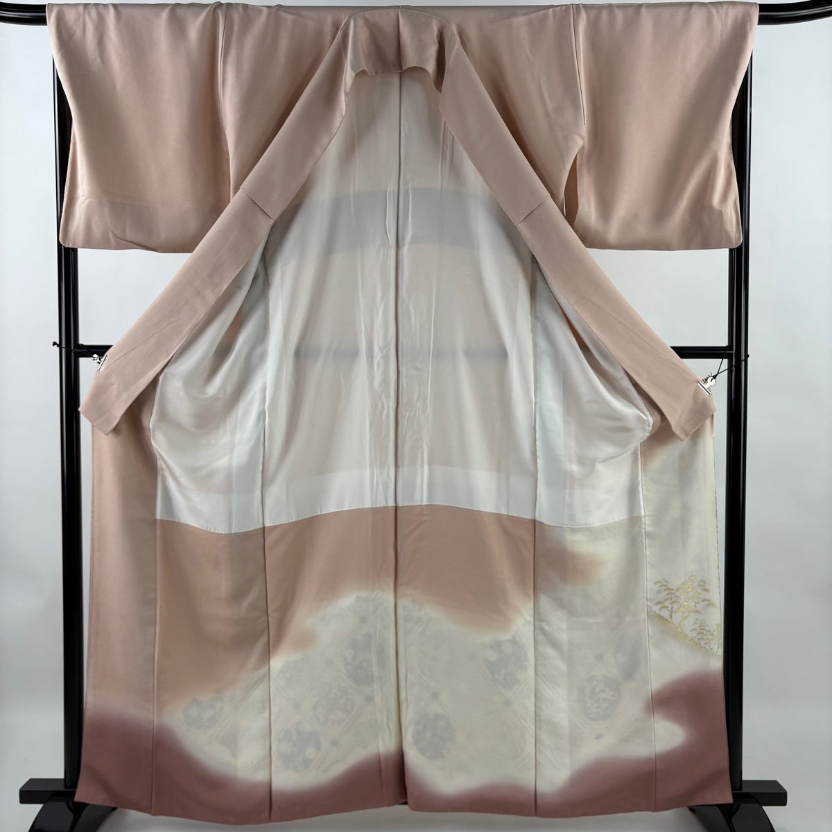【在庫一掃】 付下げ 身丈153.5cm 裄丈62cm S 袷 宝尽くし 地紋 金彩 ぼかし ピンクベージュ 正絹 秀品 一つ紋