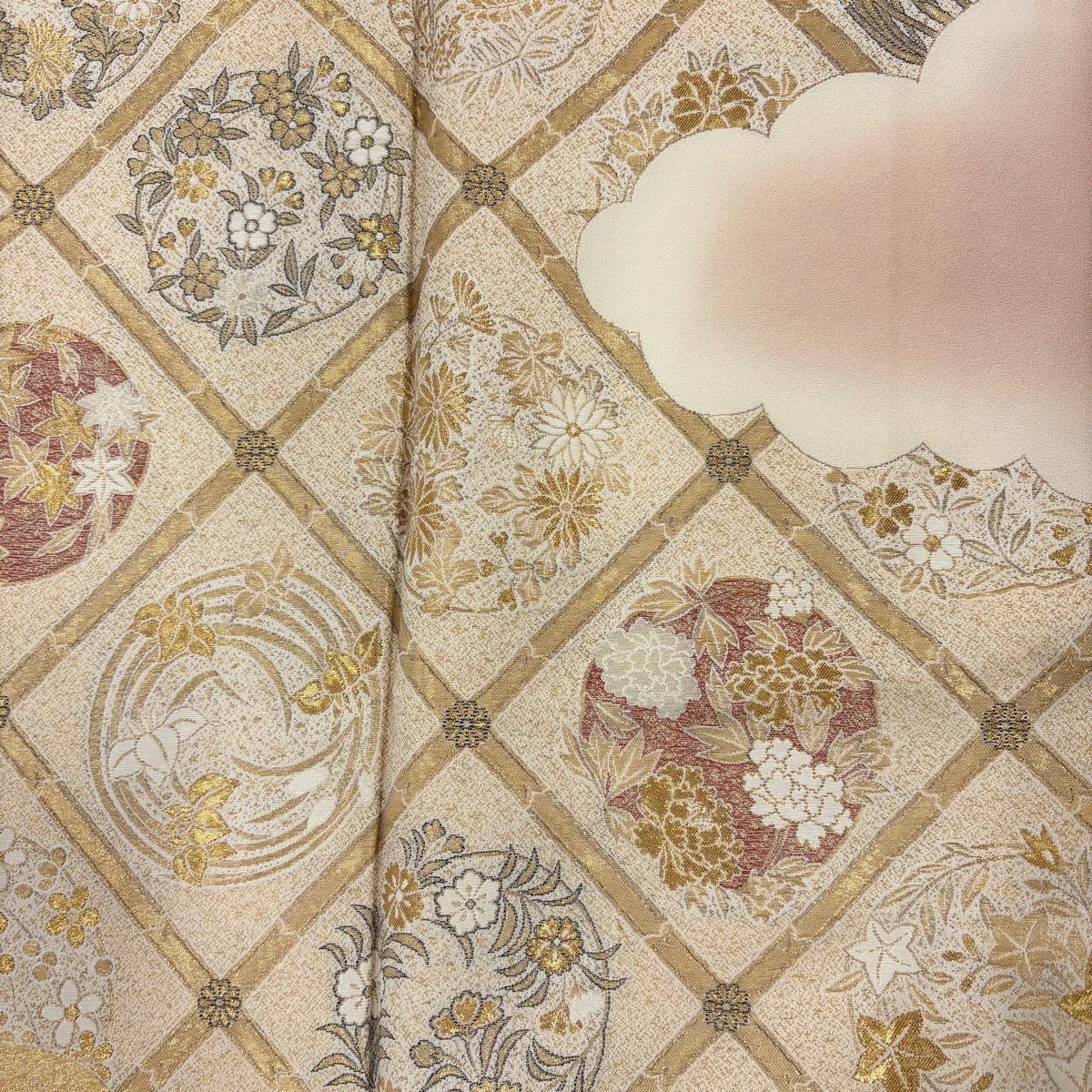 【在庫一掃】 【美品】 訪問着 身丈154cm 裄丈62.5cm S 袷 扇面 有職文様 銀通し ぼかし ピンクベージュ 正絹 秀品
