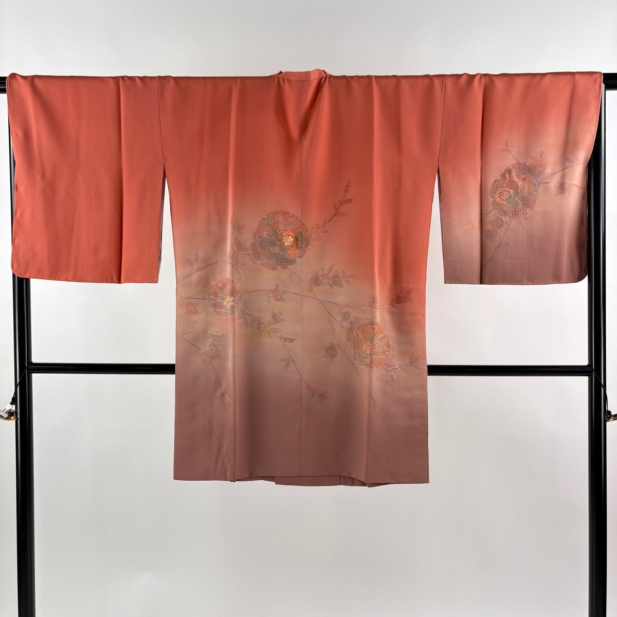 【美品】 訪問着 身丈160.5cm 裄丈67cm M 袷 鈴乃屋 落款あり 草花 染め分け ぼかし サーモンピンク 正絹 秀品