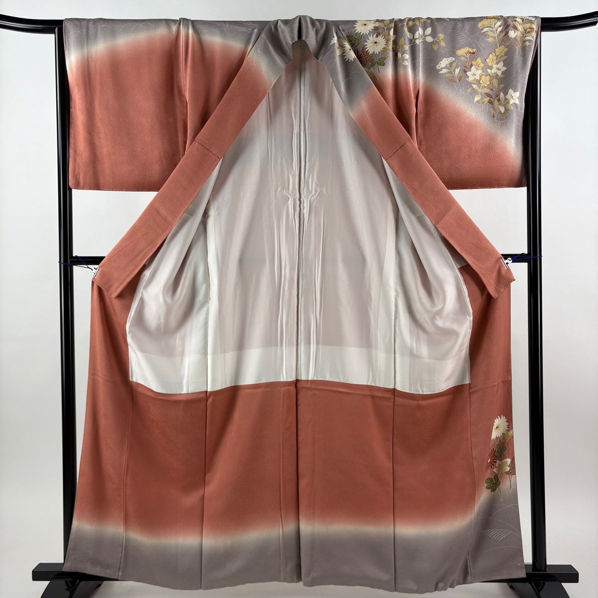 【在庫一掃】 訪問着 身丈155cm 裄丈62.5cm S 袷 落款あり 草花 流水 金銀彩 ぼかし サーモンピンク 正絹 秀品