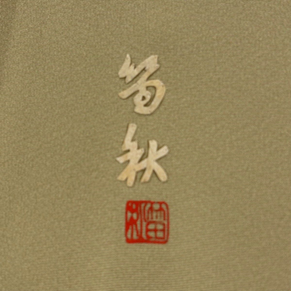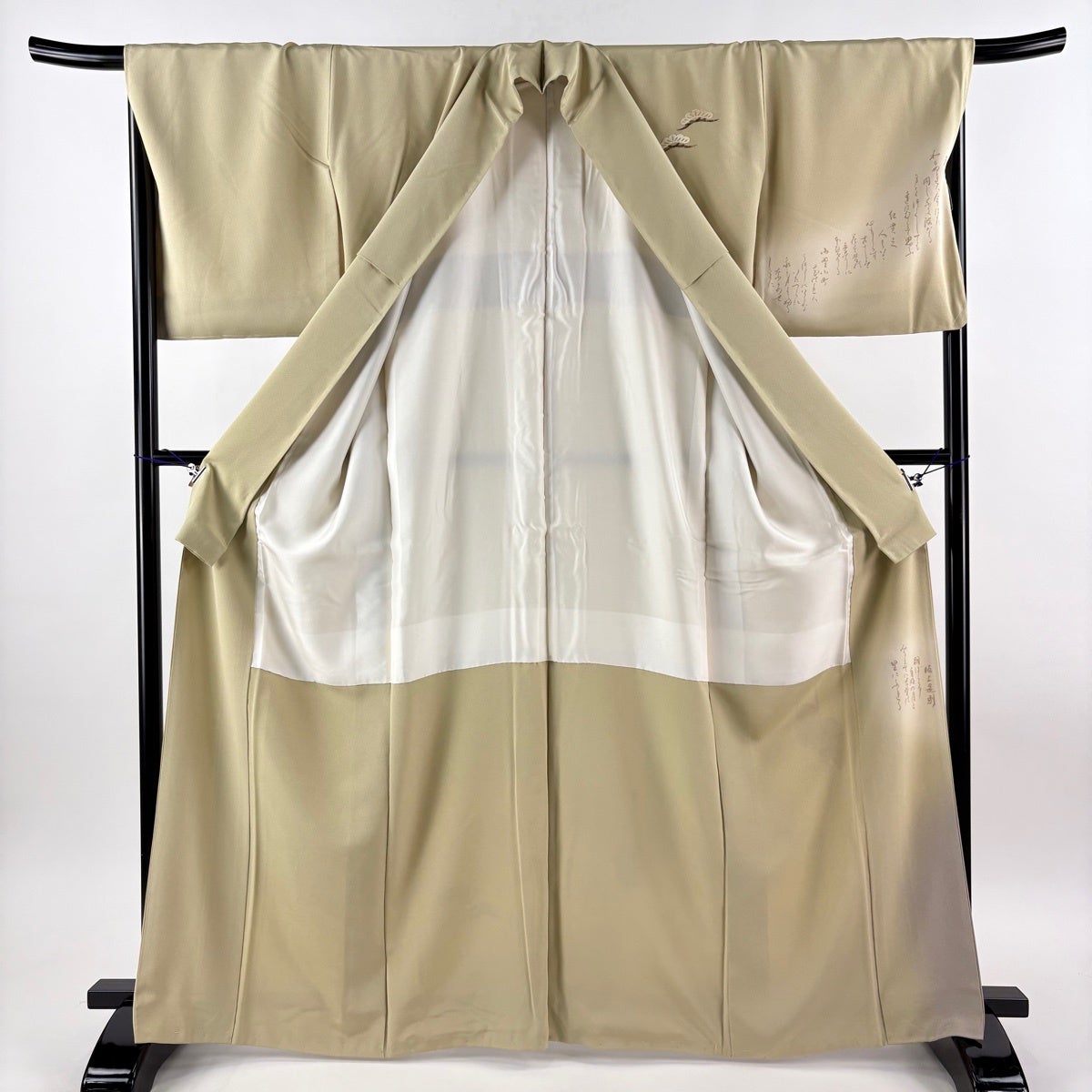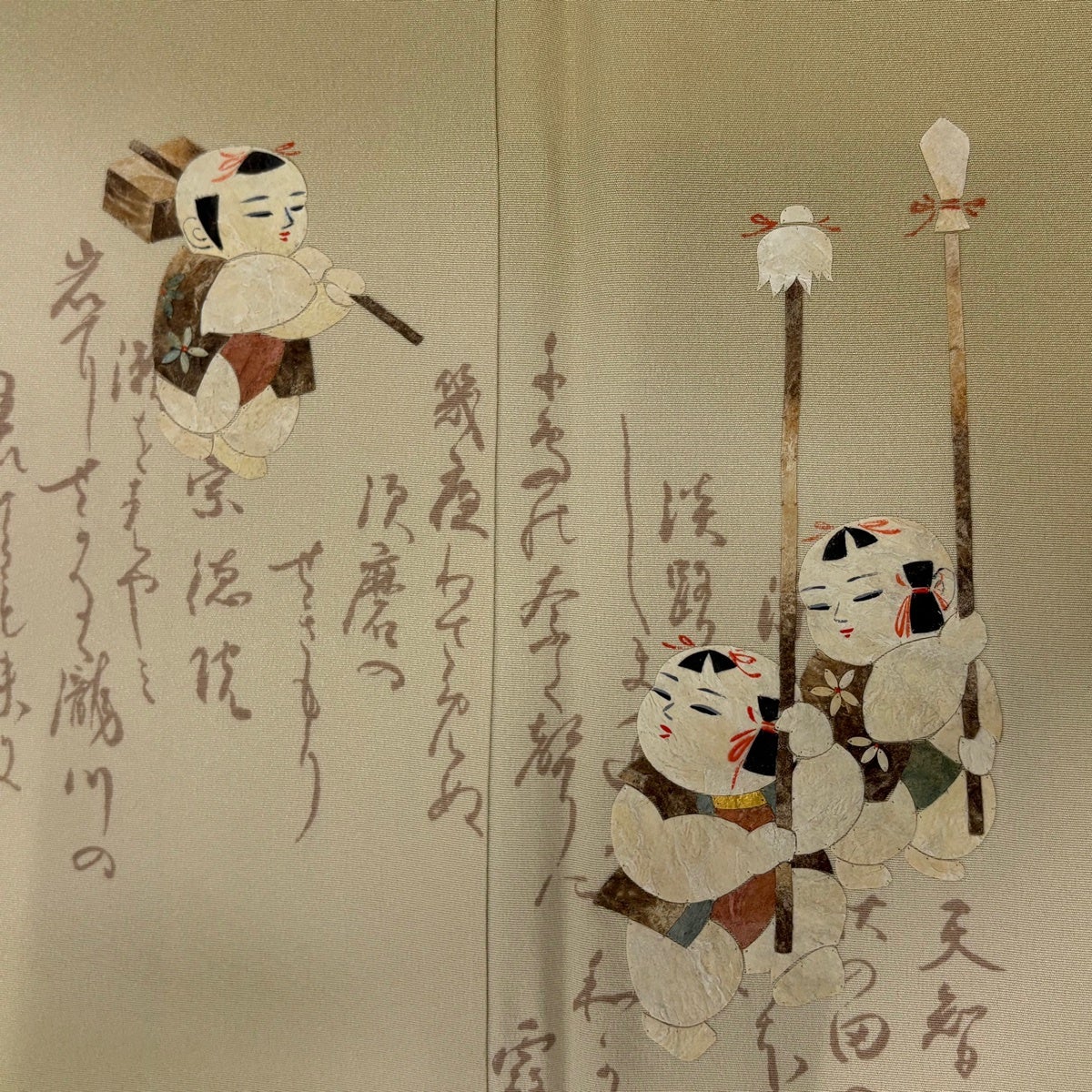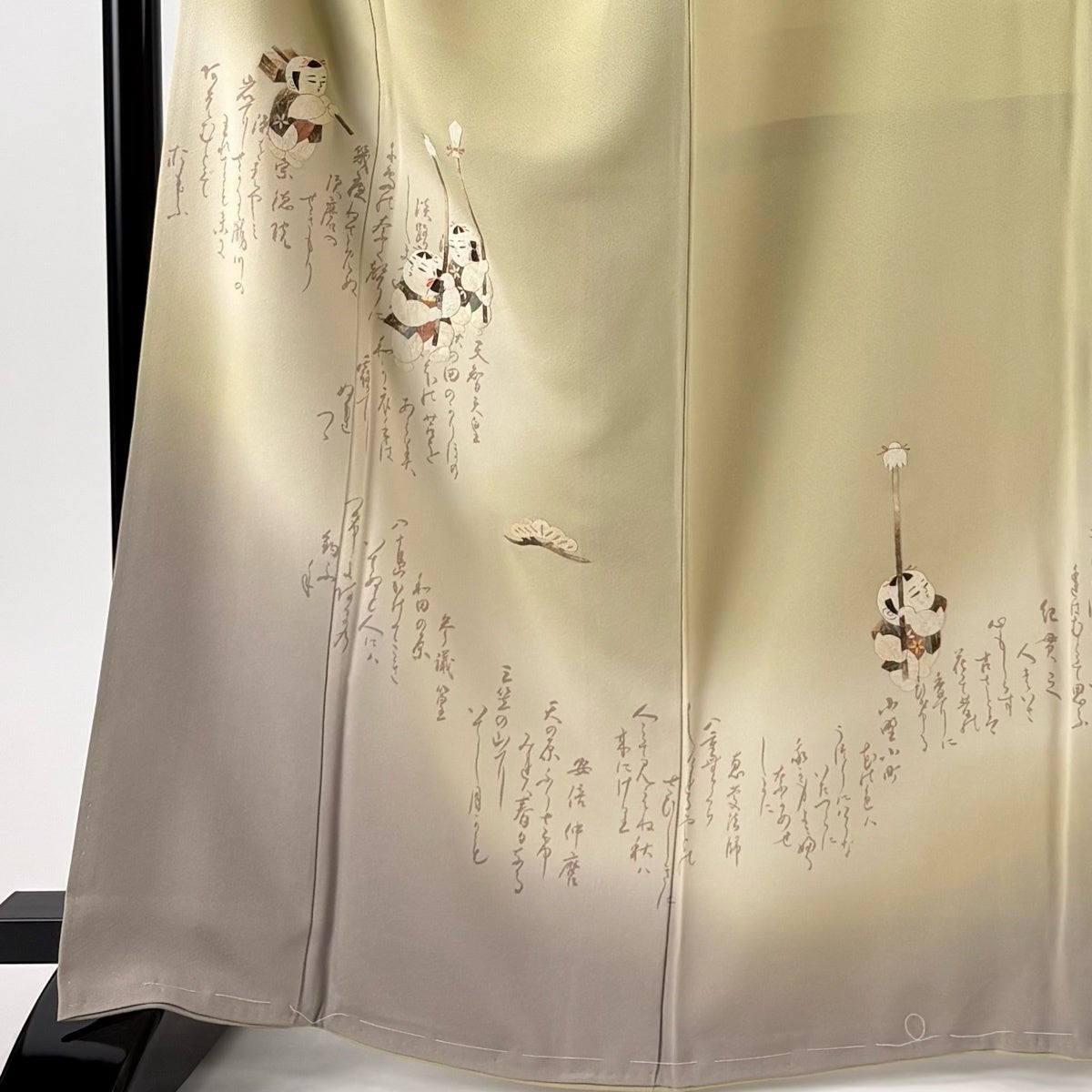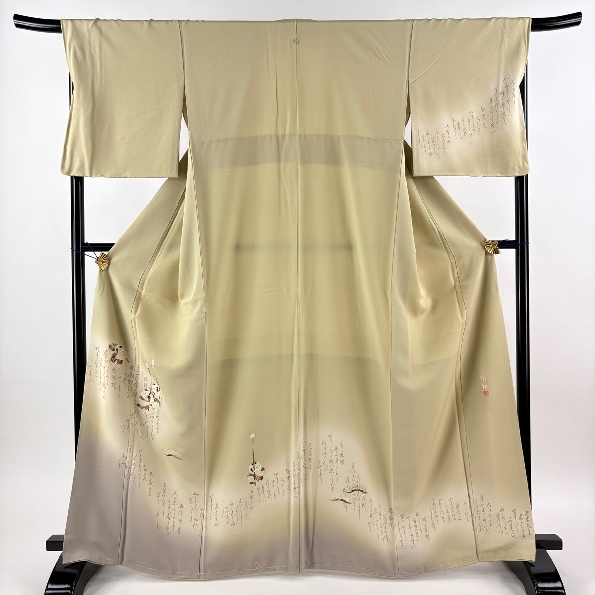 【美品】 付下げ 身丈165cm 裄丈68cm L 袷 田尾笛秋 落款あり 御所人形 文字 金彩 ぼかし ベージュ 正絹 秀品 一つ紋