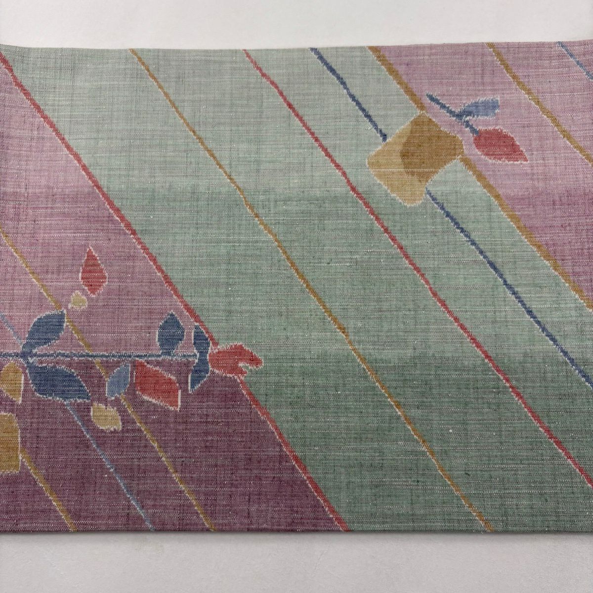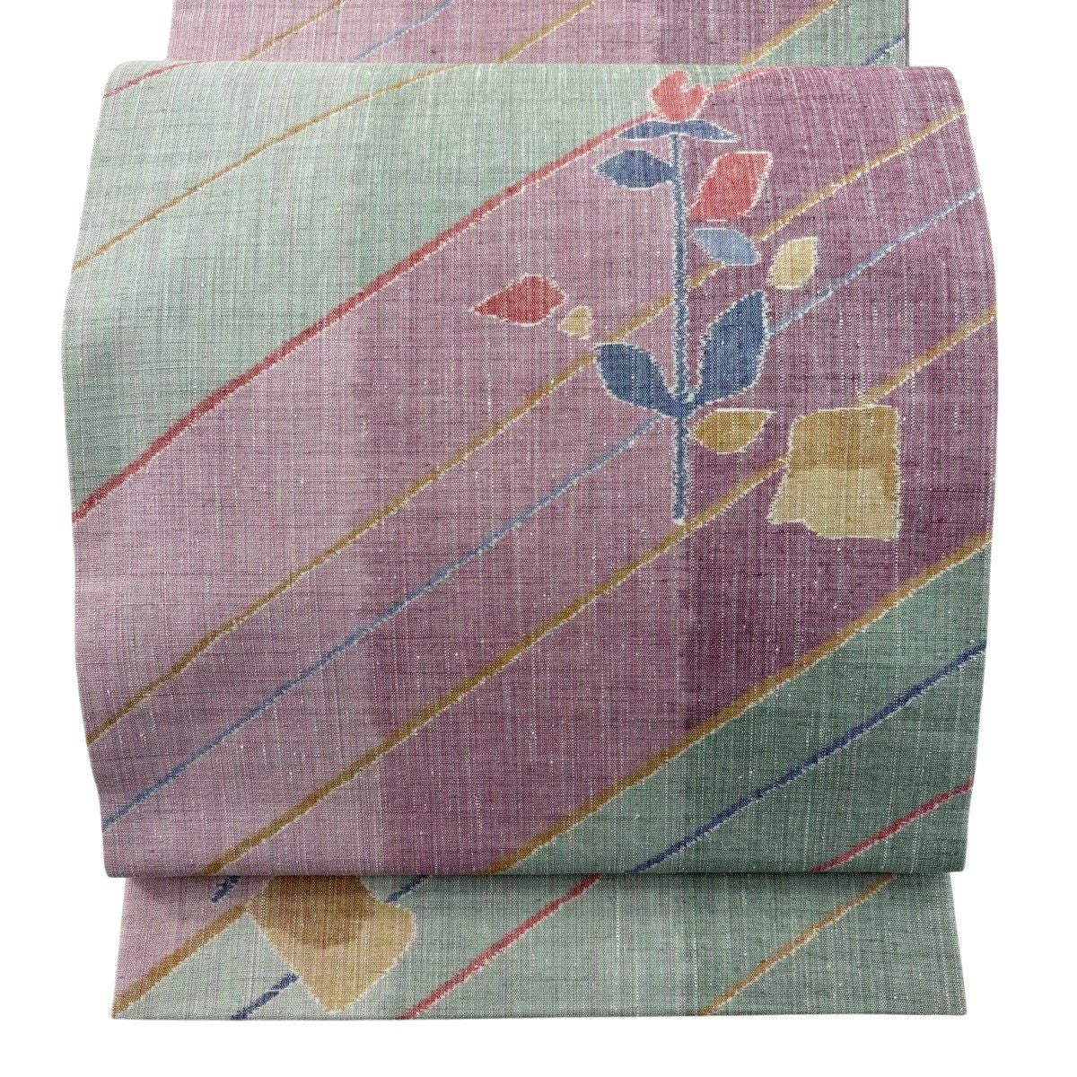 袋帯 秀品 斜縞 草花 紫 全通 正絹