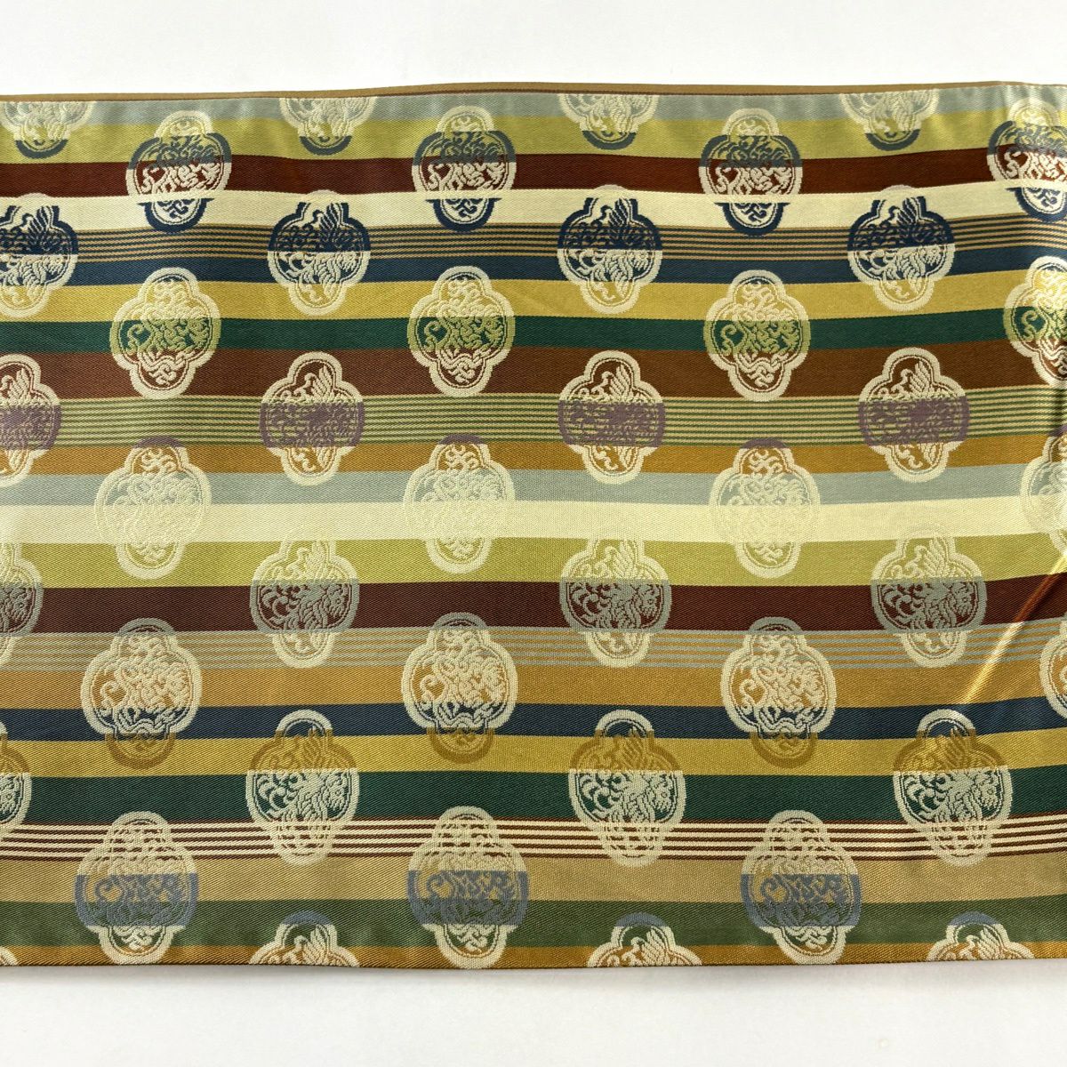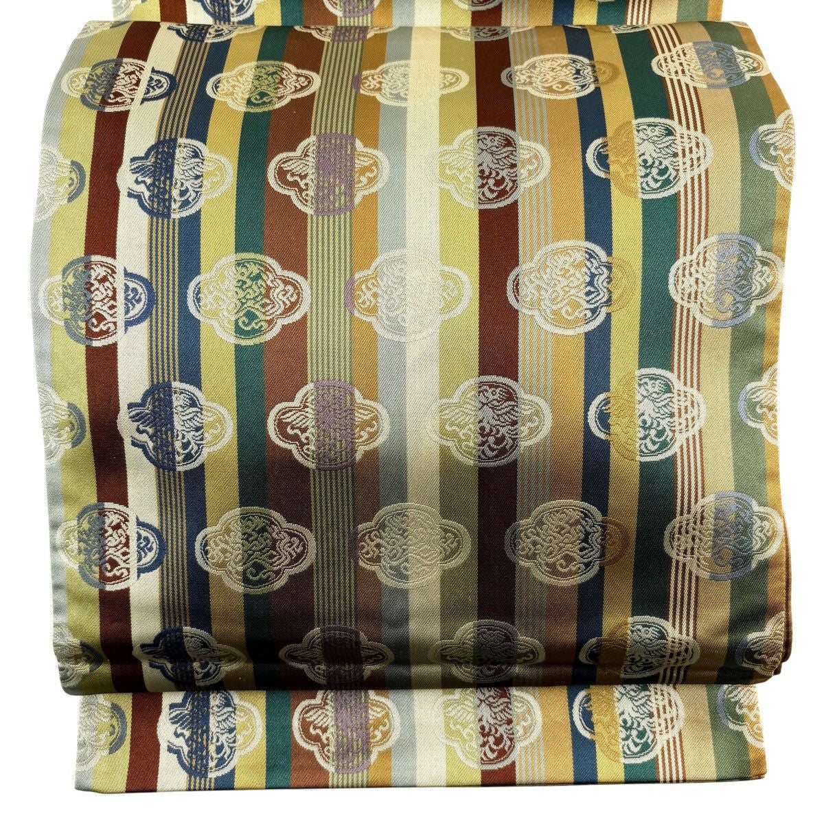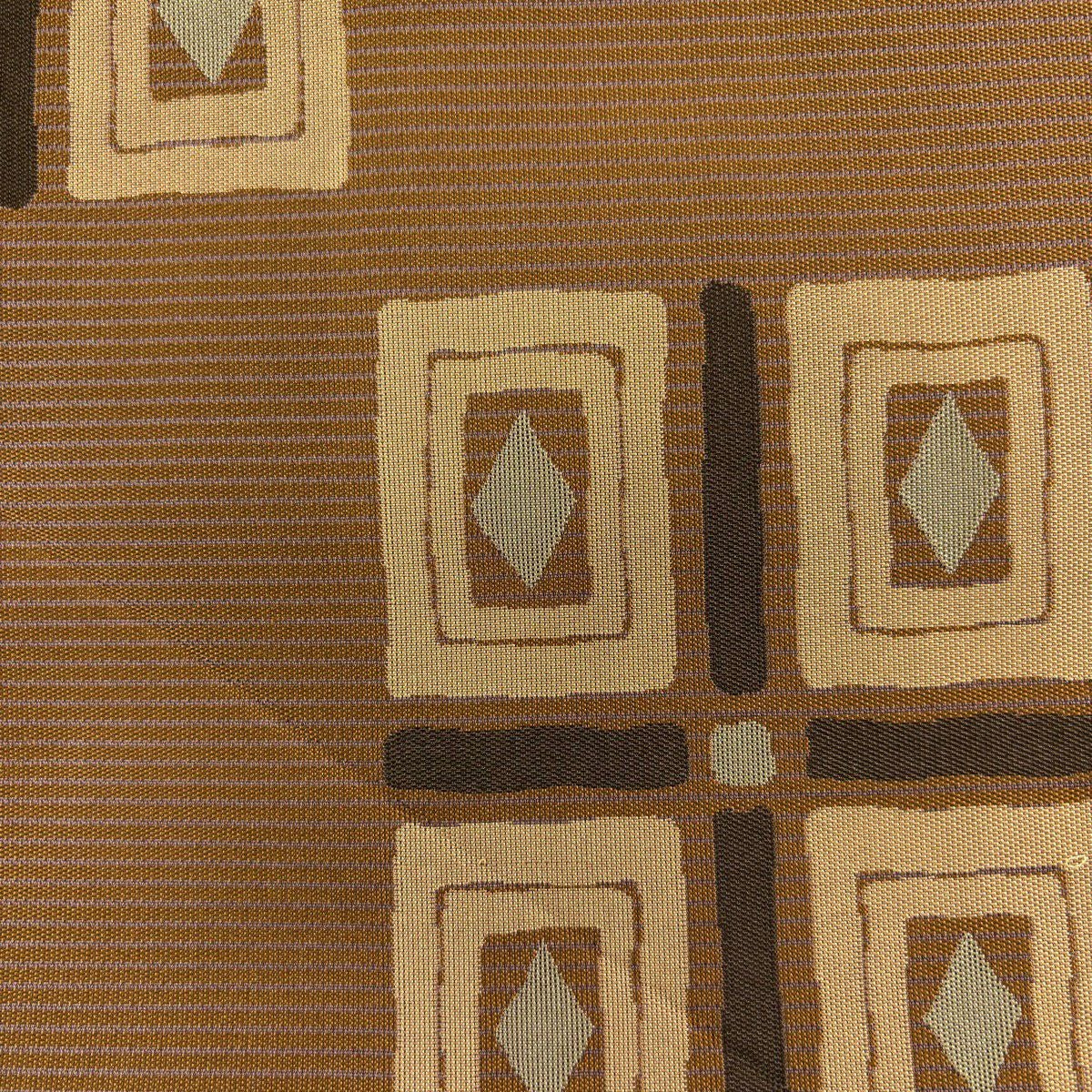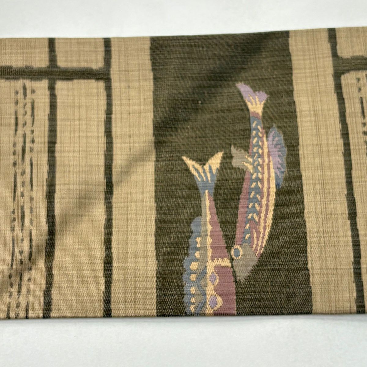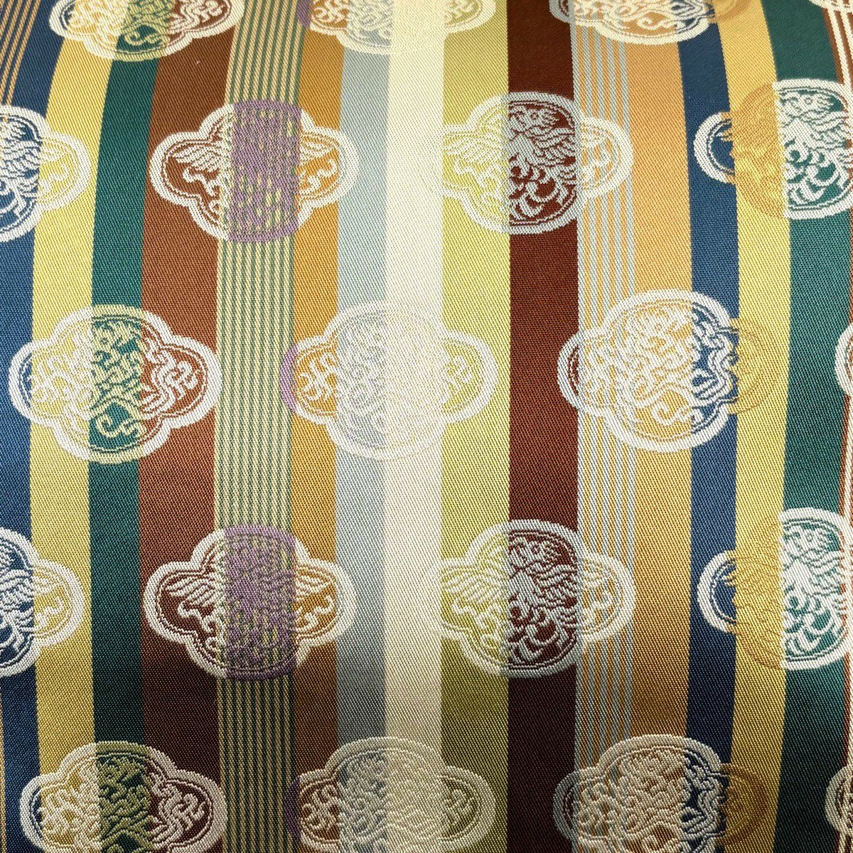 袋帯 秀品 縞 鳥 黄土色 全通 正絹