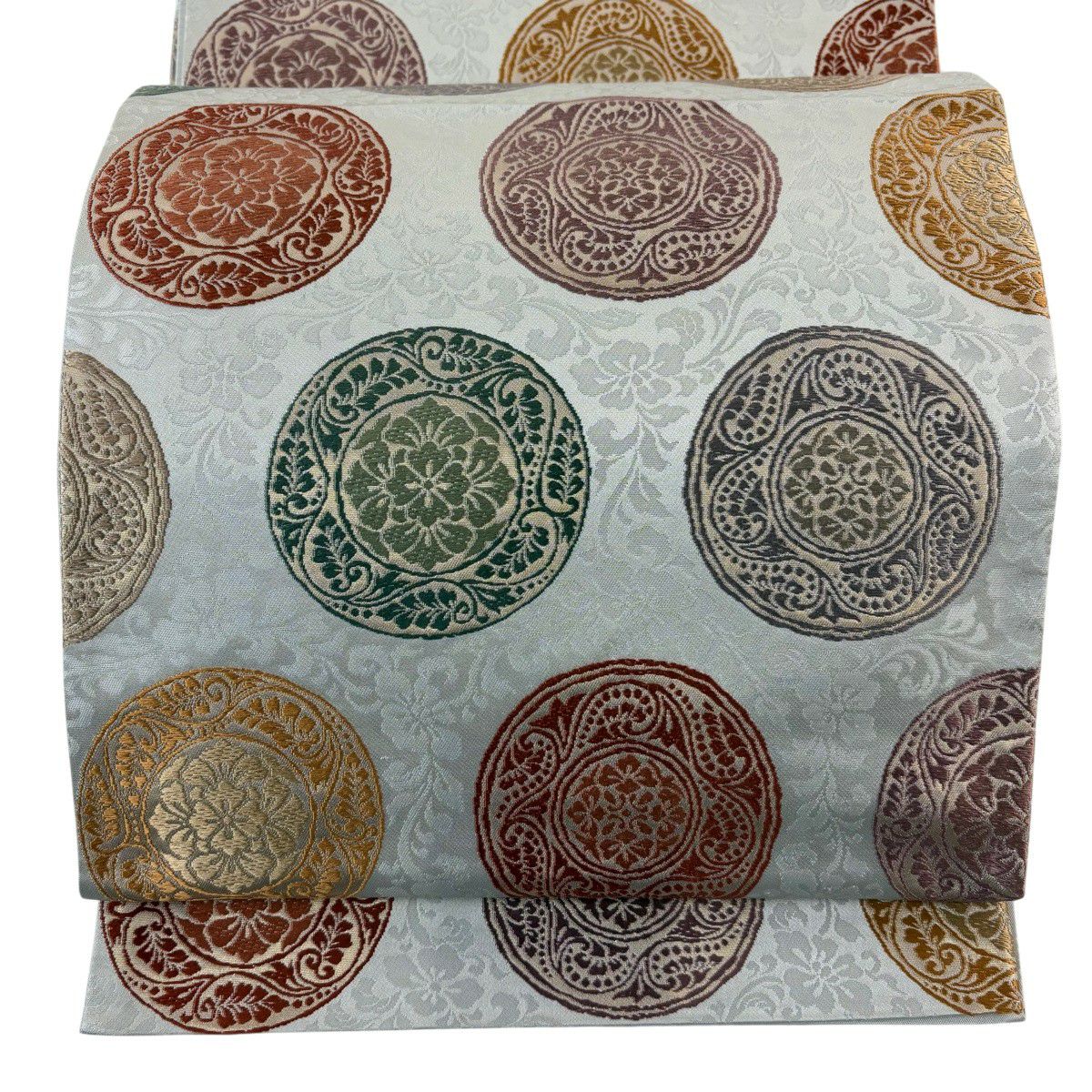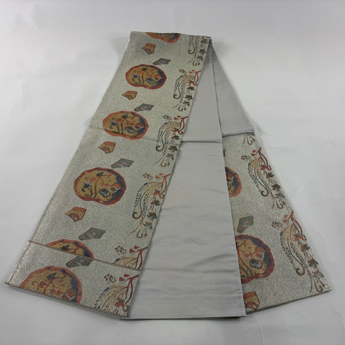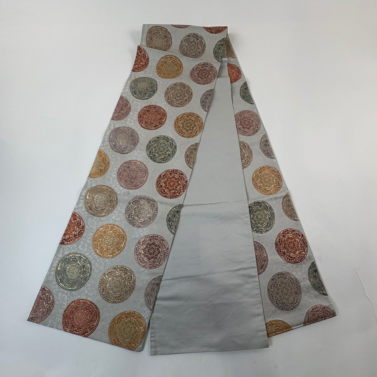 袋帯 秀品 丸文 箔 灰色 六通 正絹